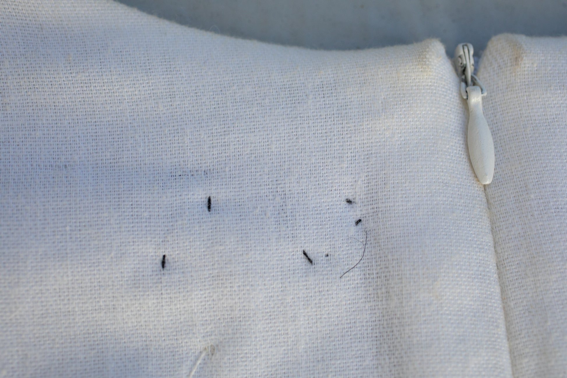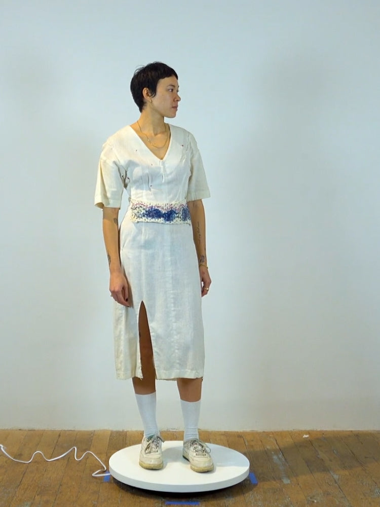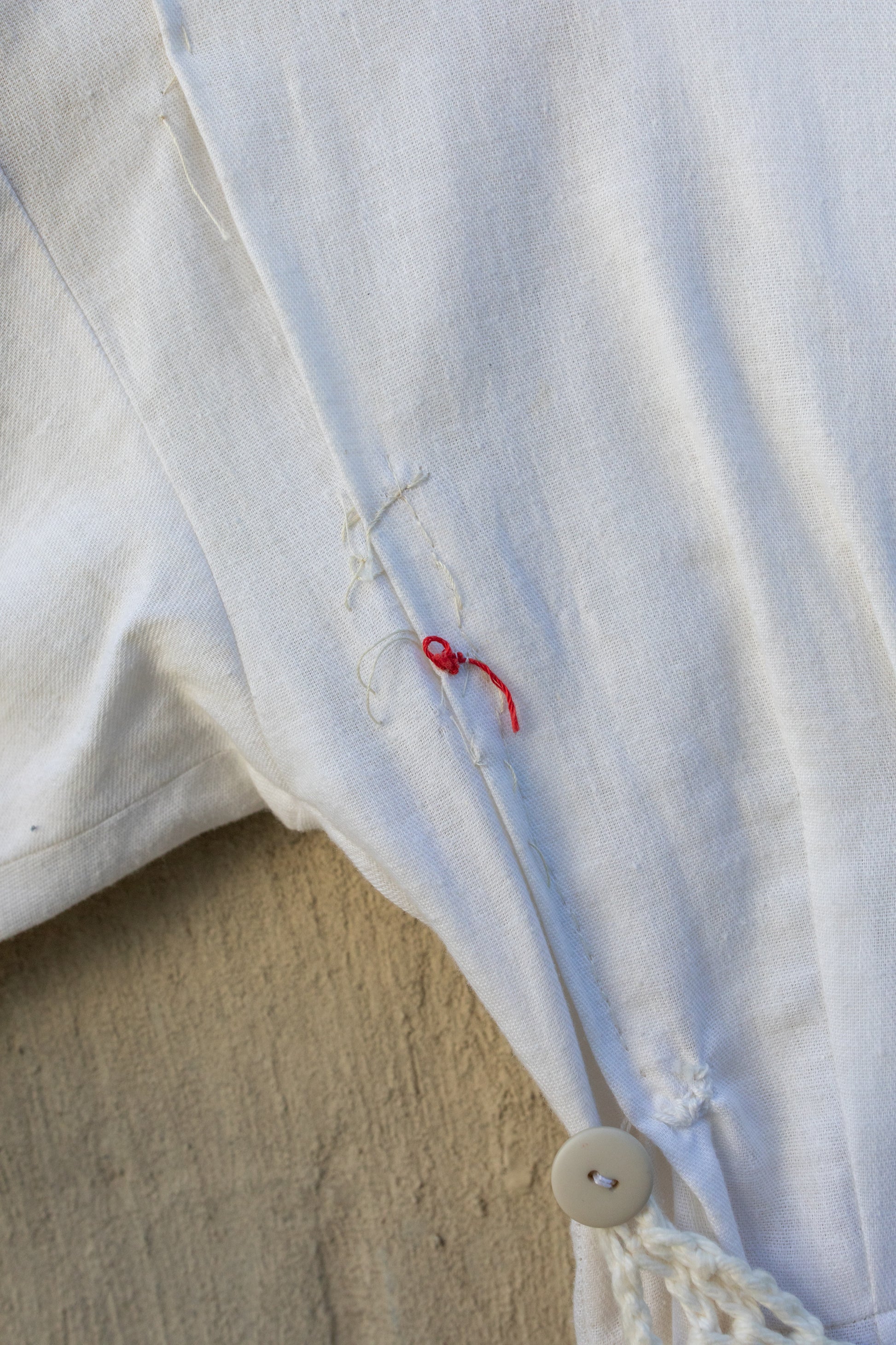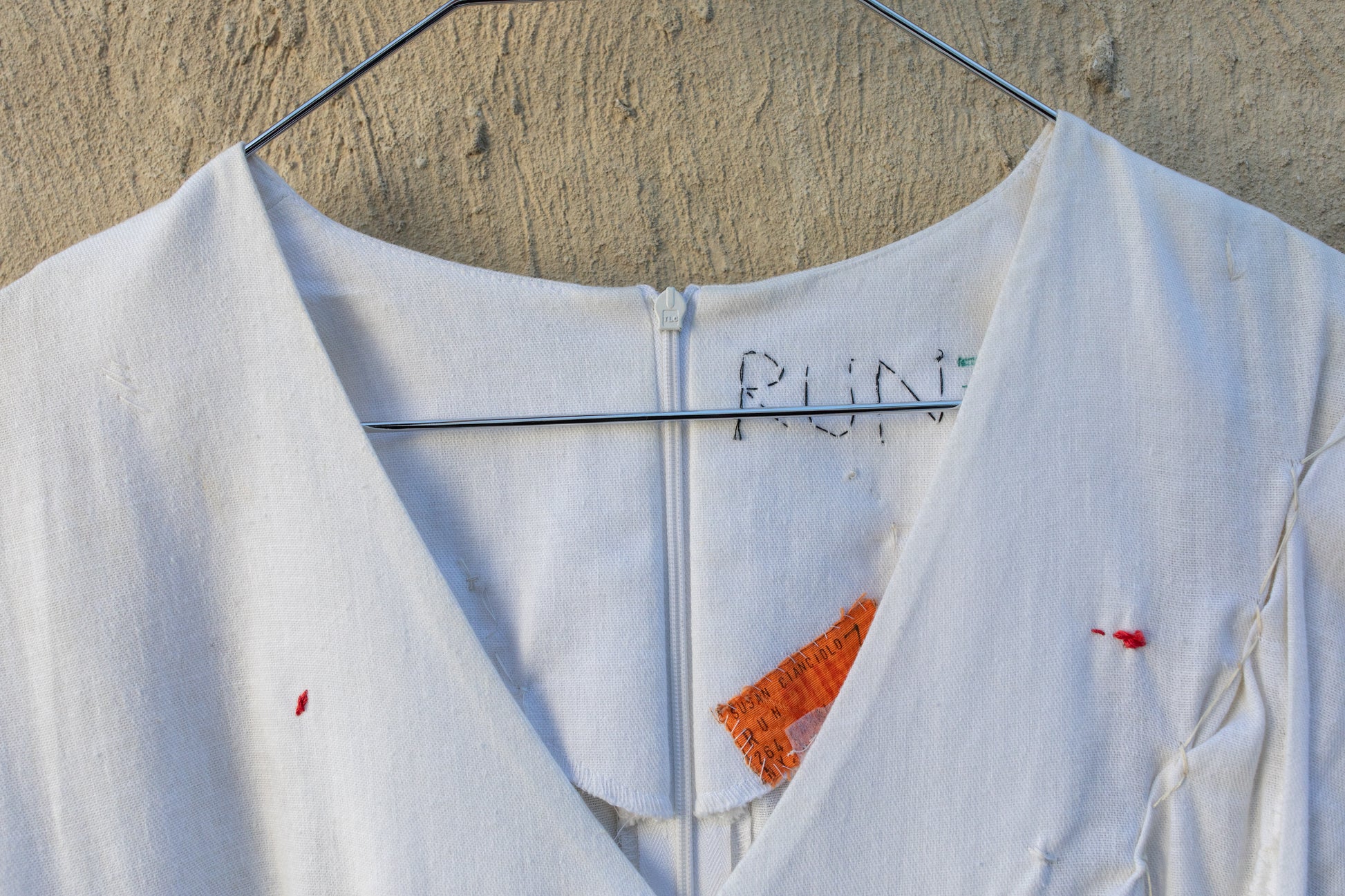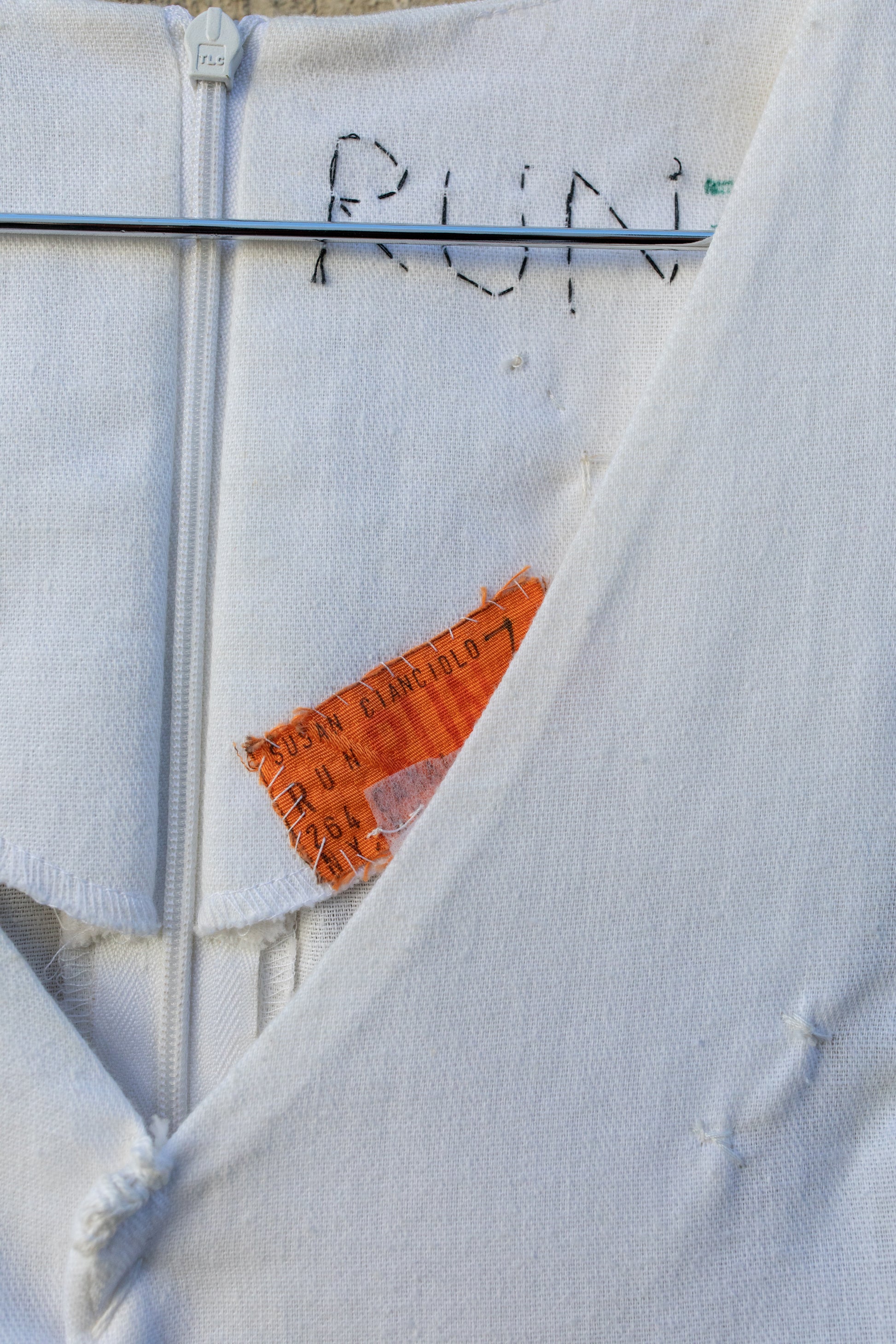 White and red thread stitching details throughout. Small side slit. Back zipper and back seams. RUN 7 embroidered on inside back collar. RUN tag marked sample.
