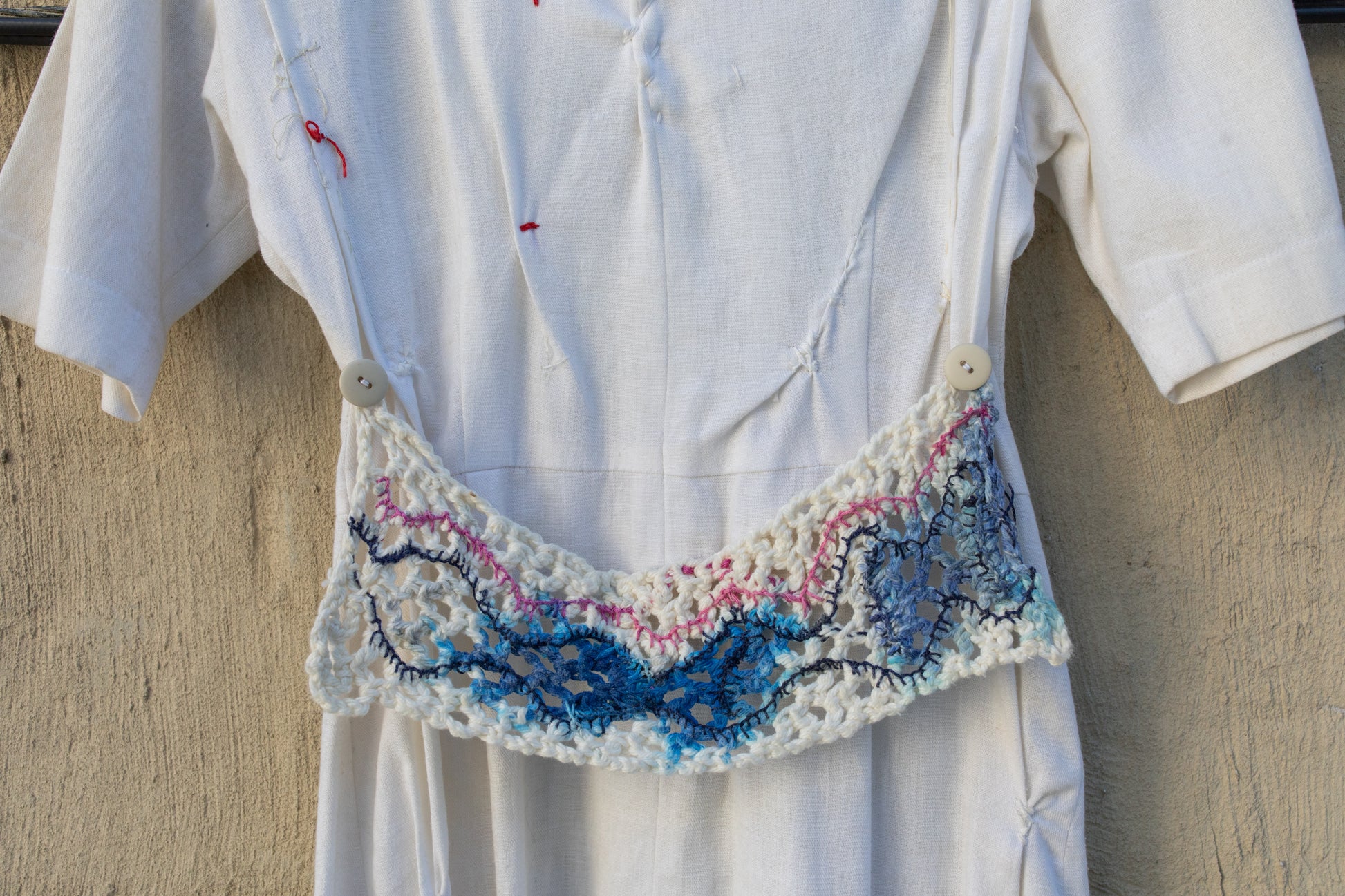 RUN 7 off white cotton v-neck short-sleeve dress with crochet sash attached with buttons.