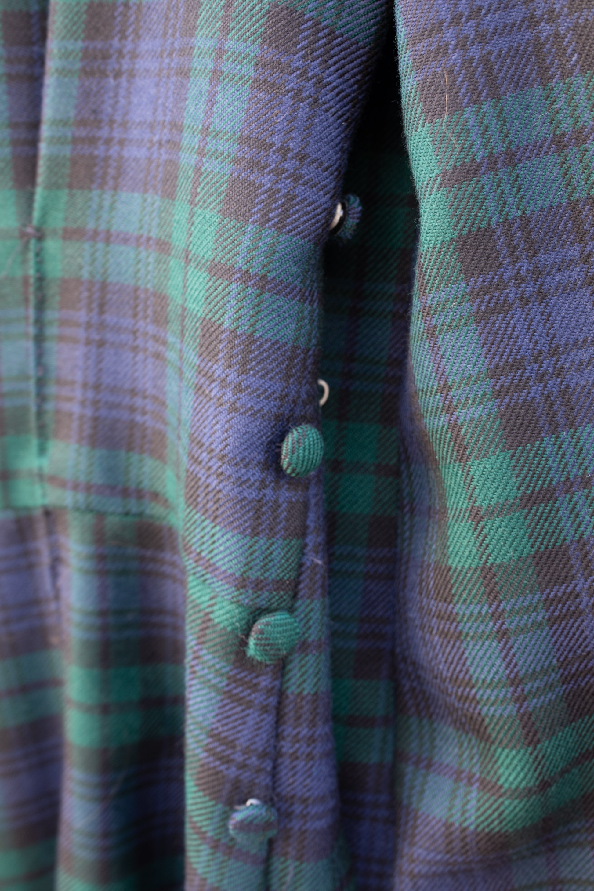 Attachment secured by oversized wool coated buttons. Drop waist and pleated skirt. Ruched hem at sleeves. RUN Collection 10 logo tag inside back collar.