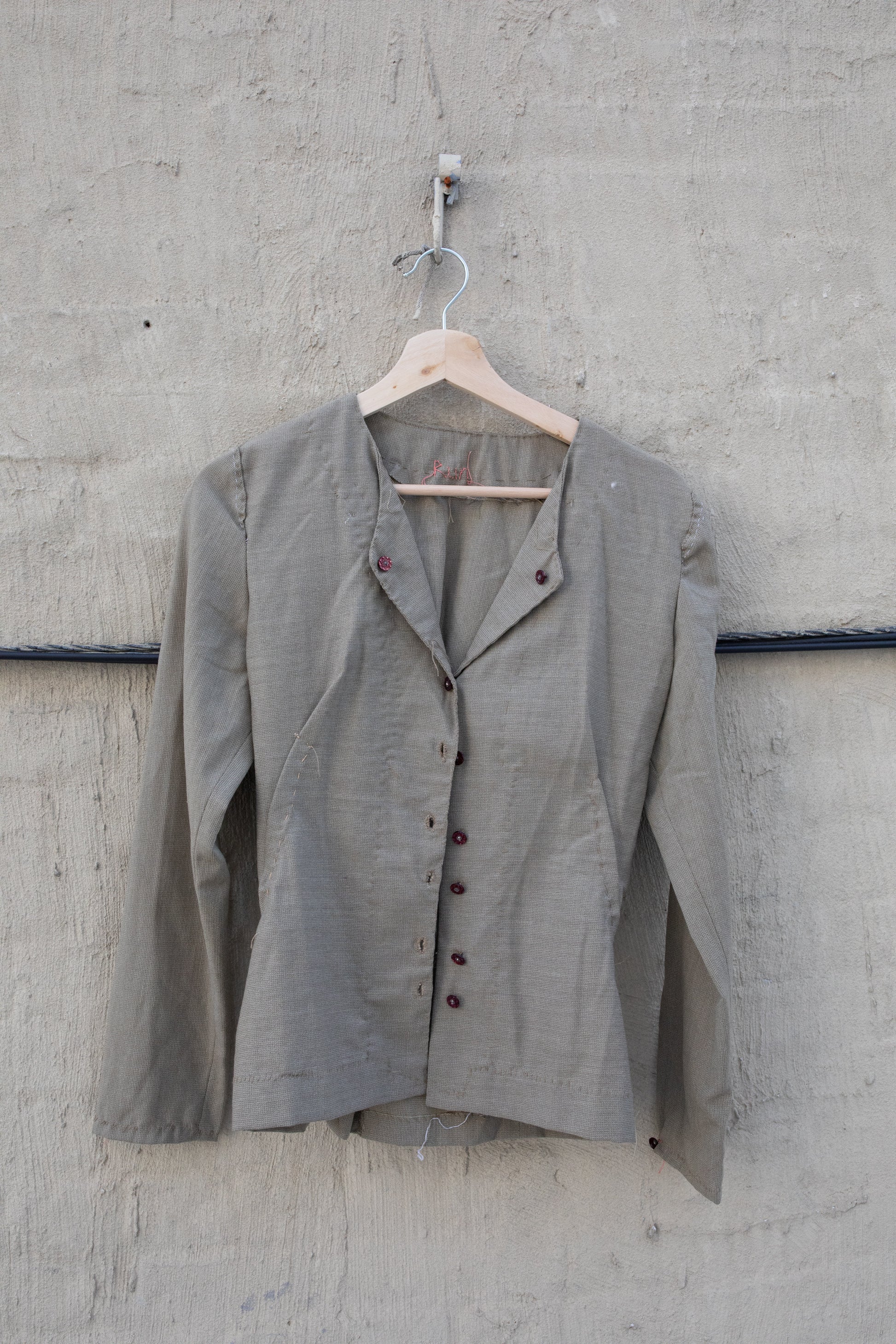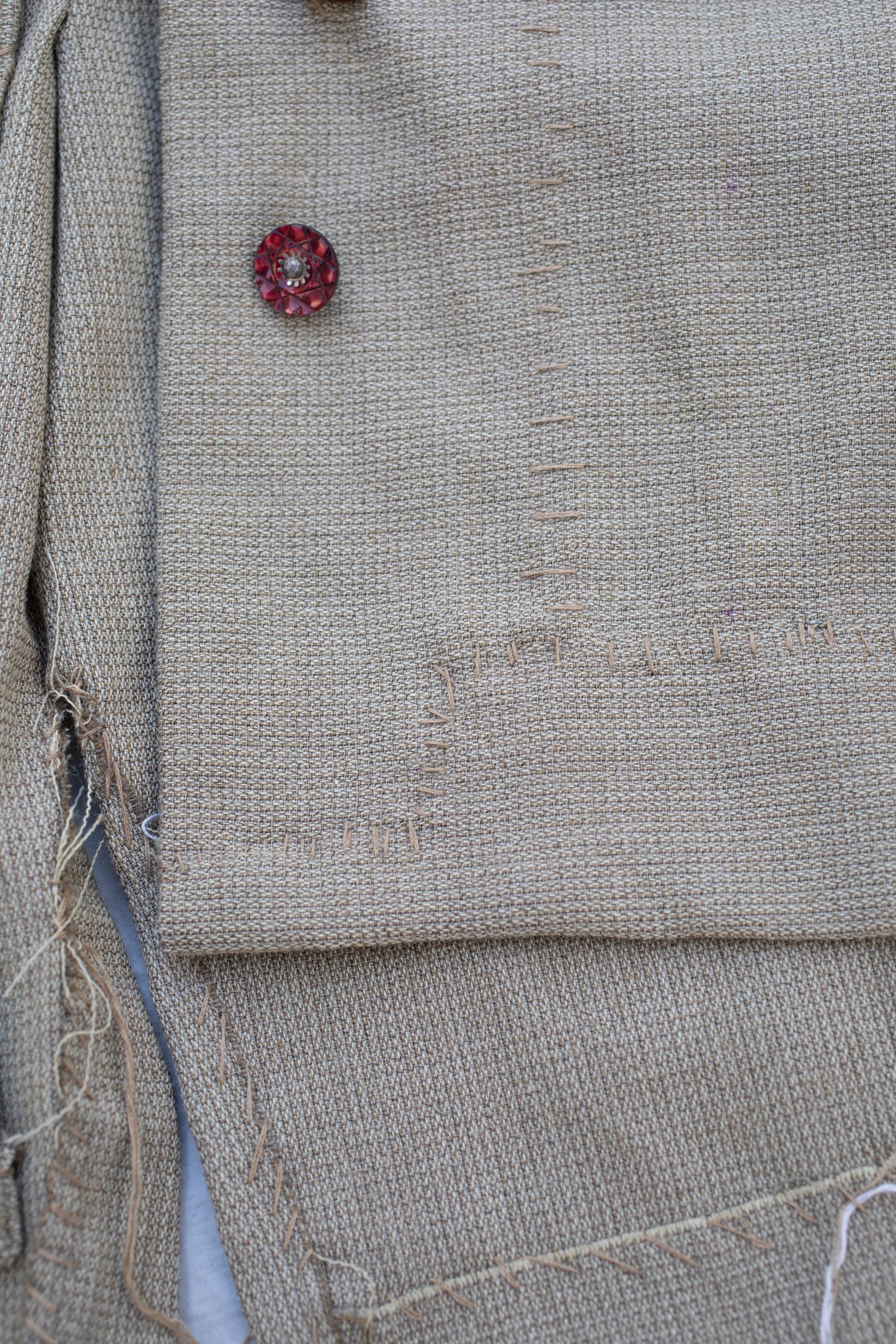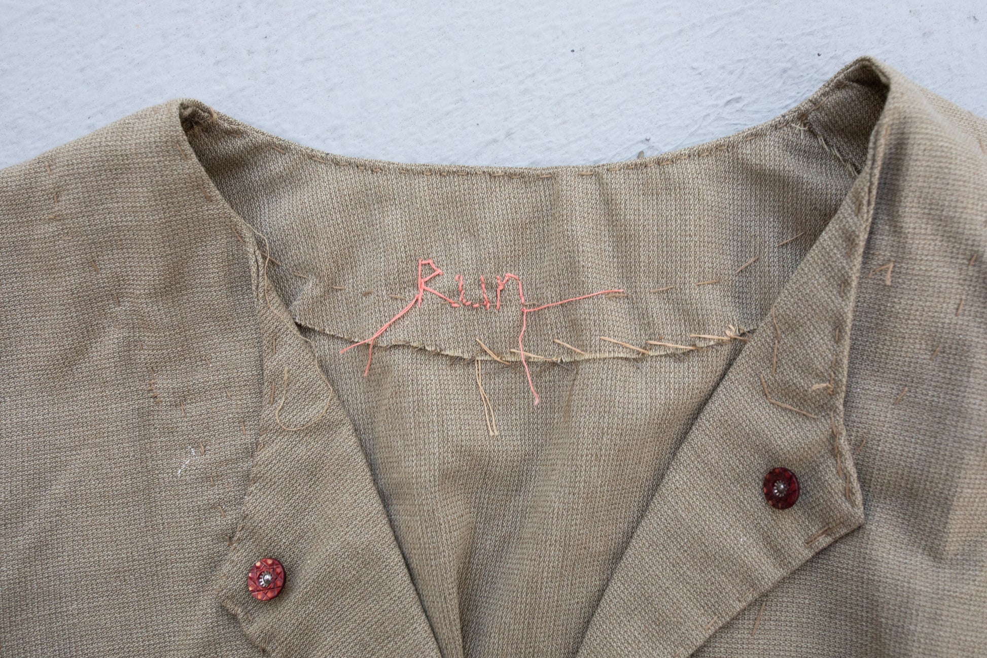 Maroon textured glass buttons. Stitching details throughout both garments. RUN logo hand-embroidered on inner back collar of jacket.