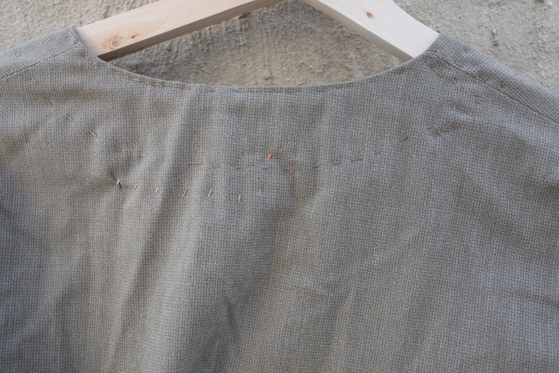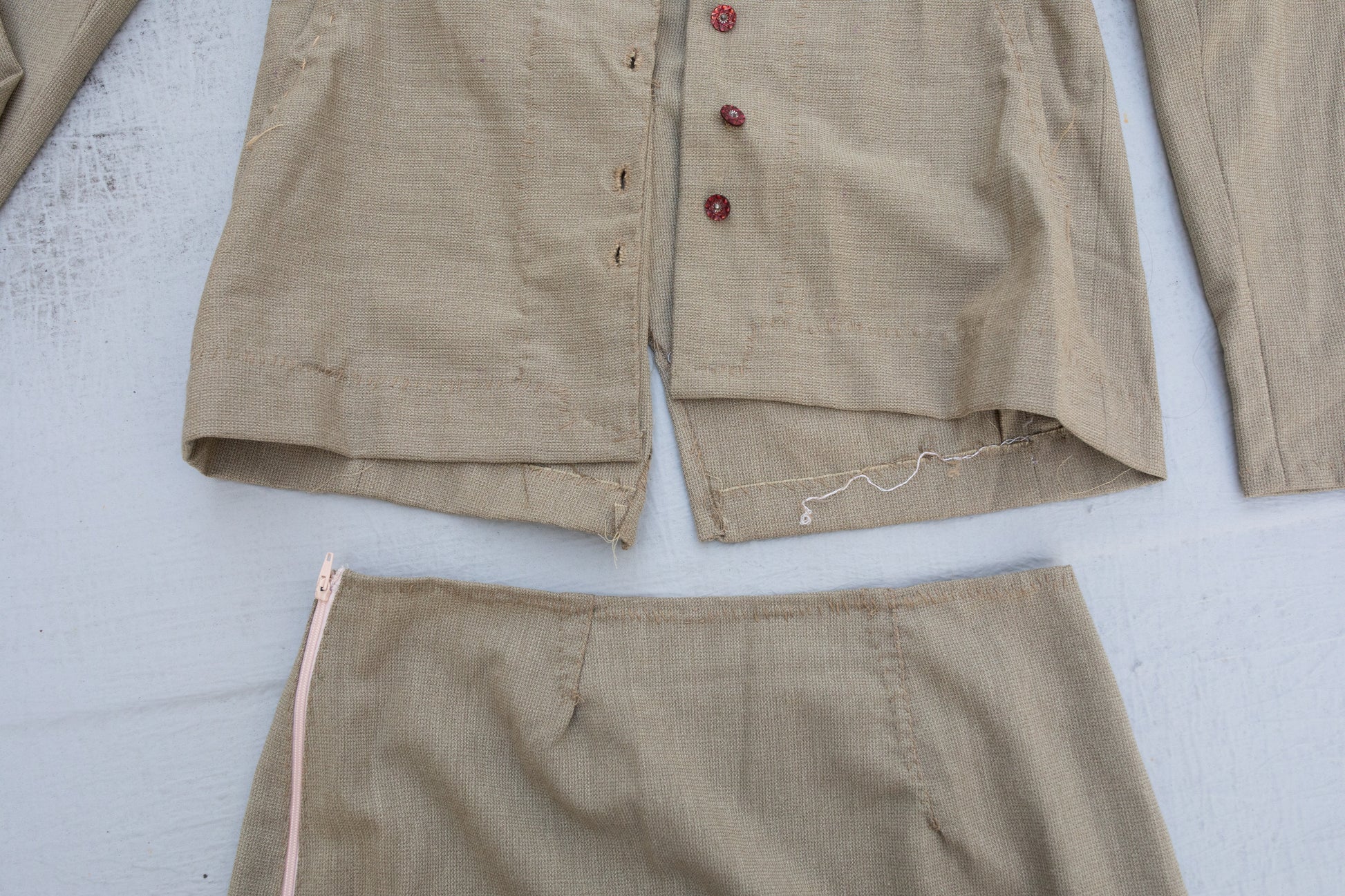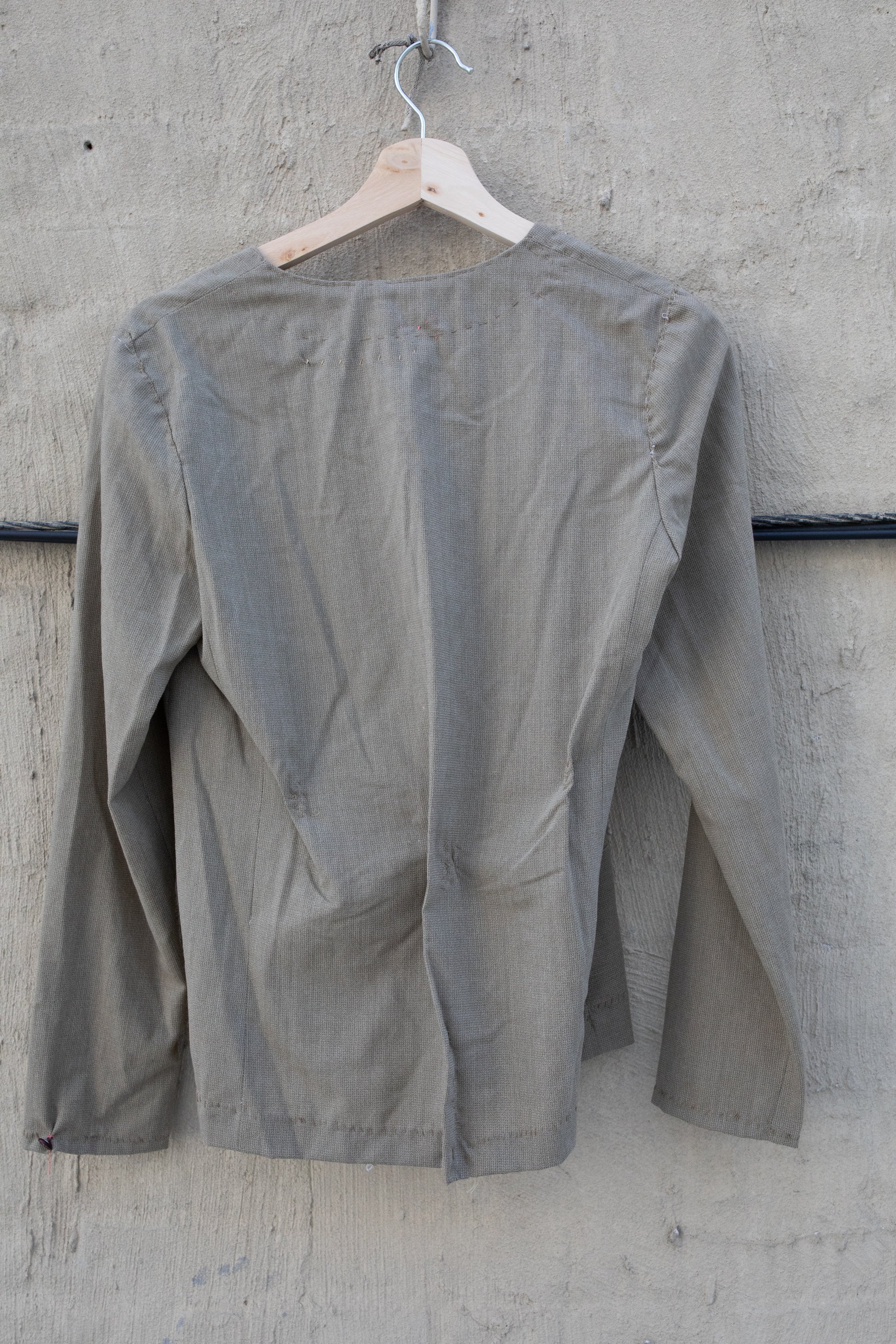 Maroon textured glass buttons. Stitching details throughout both garments. RUN logo hand-embroidered on inner back collar of jacket.