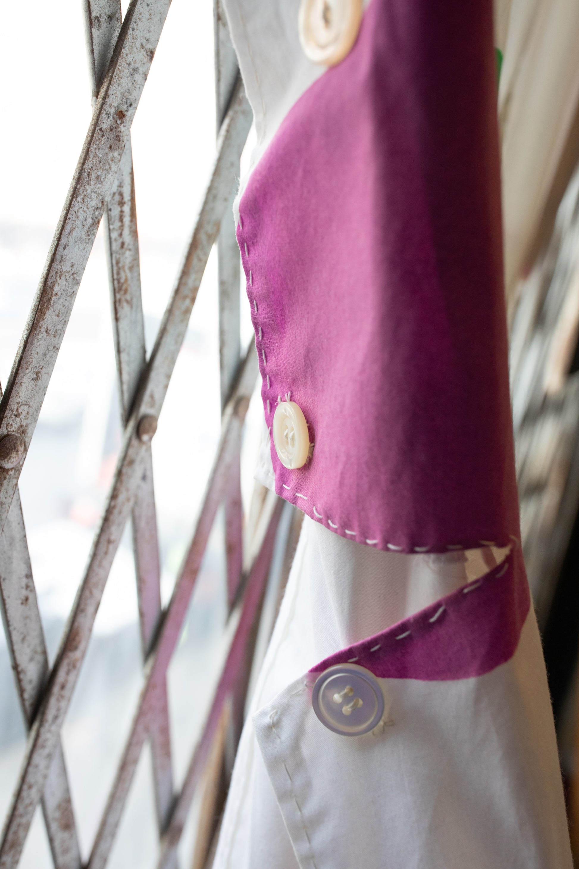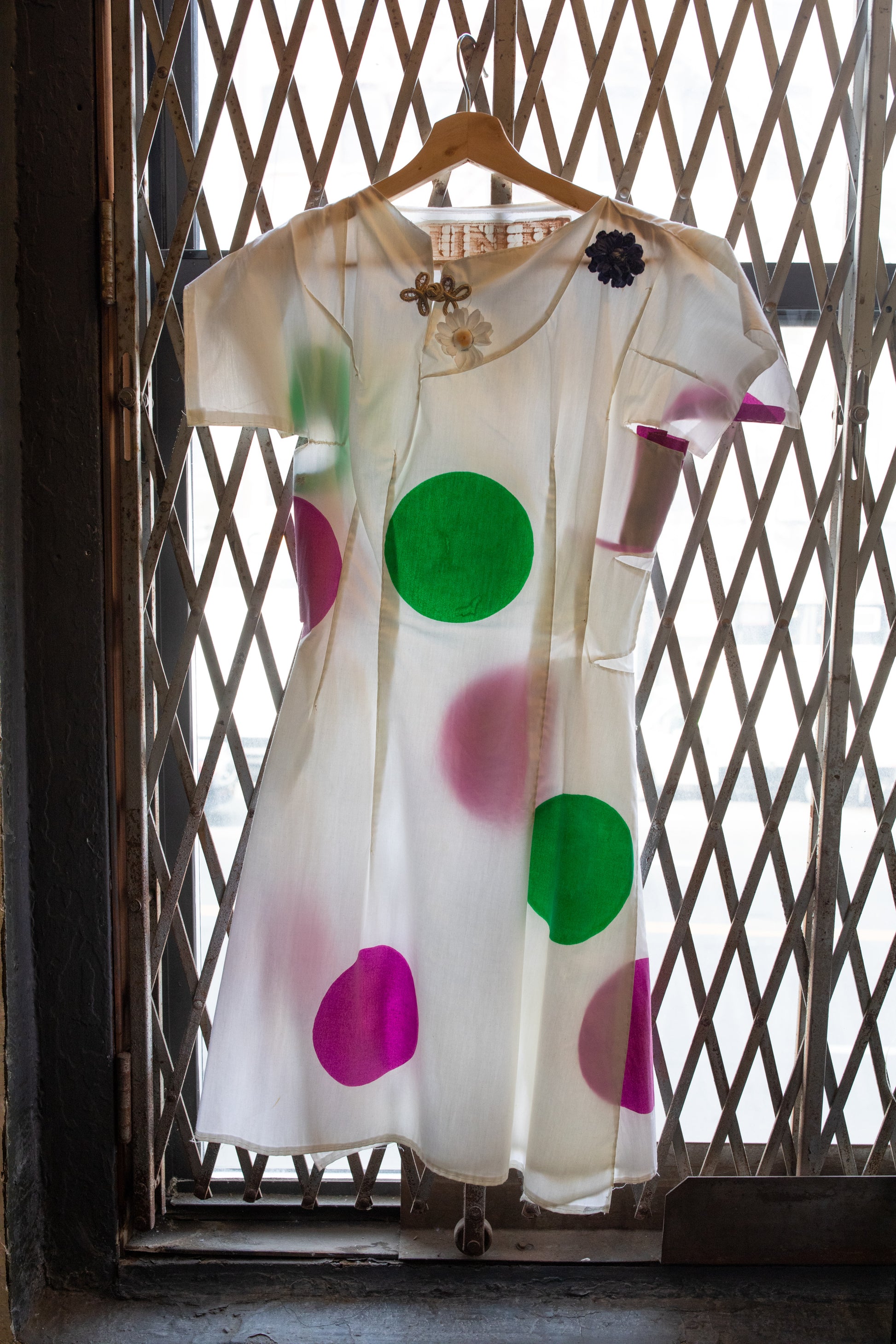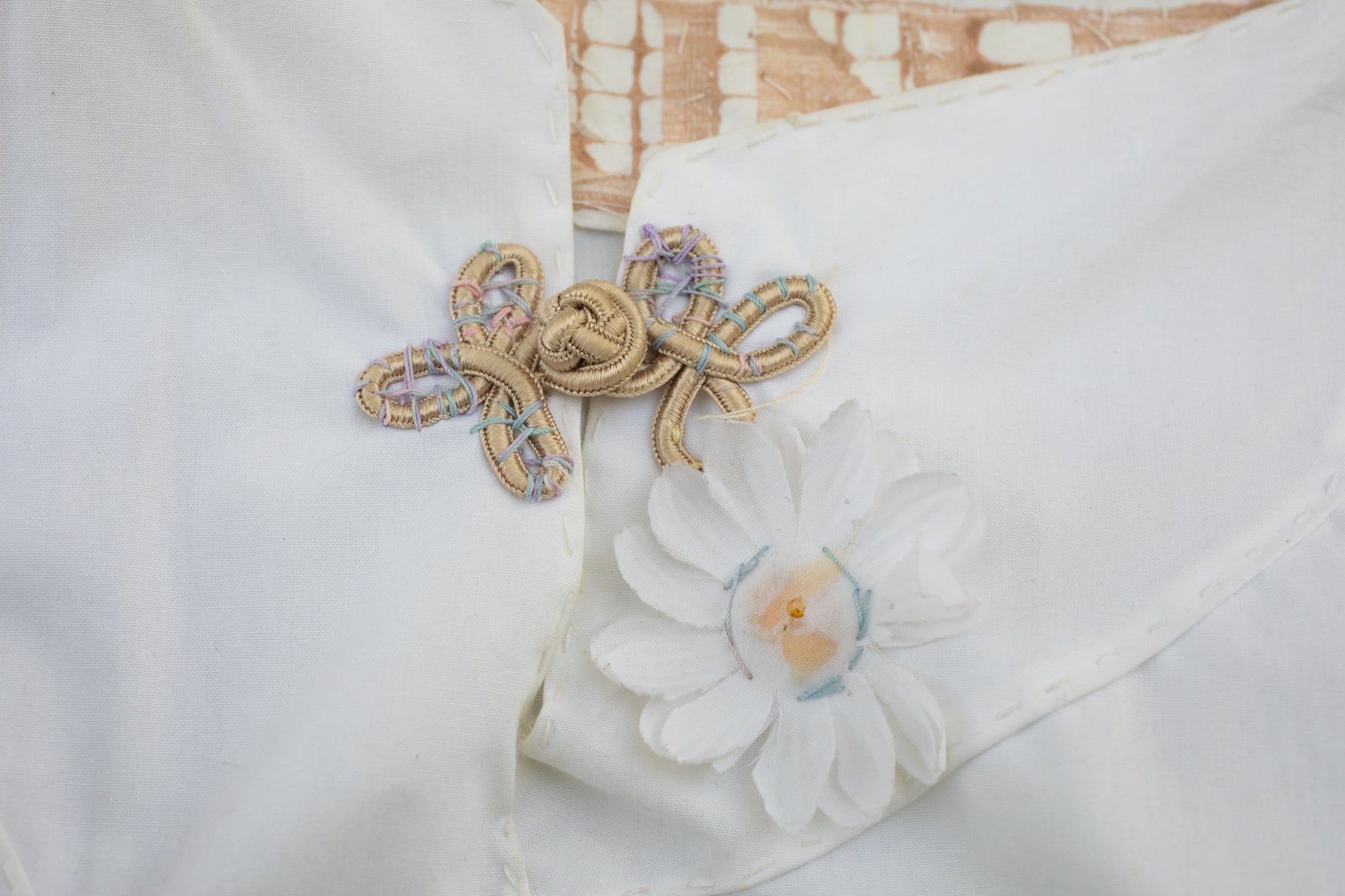 White and navy silk flowers and twist applique at neckline. Bodice of dress is pieced with hand-stitching. White button closure along left side. Sleeves are open rather than hemmed together. RUN label in block print.