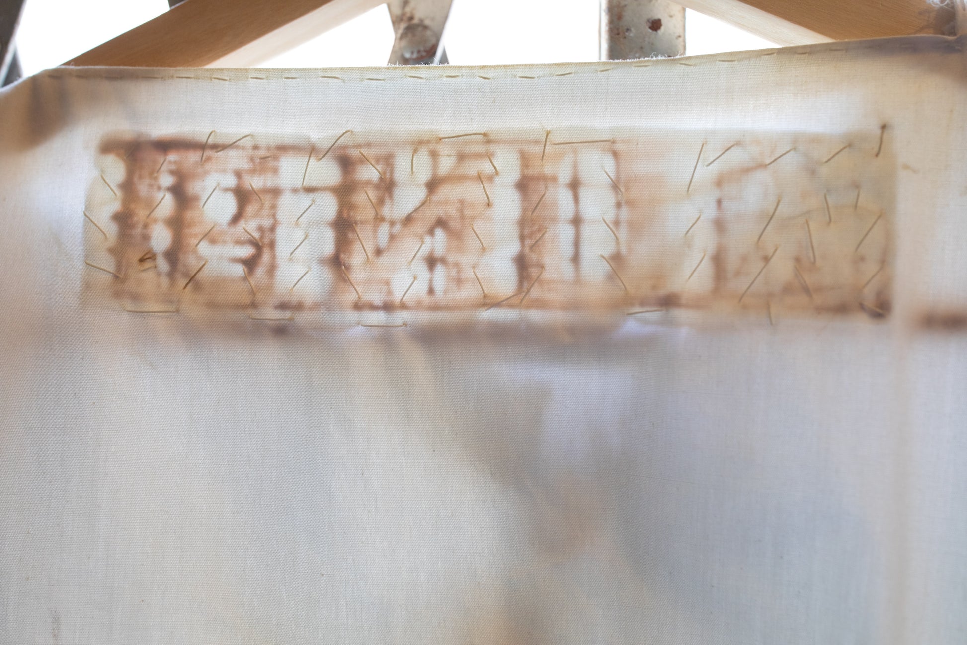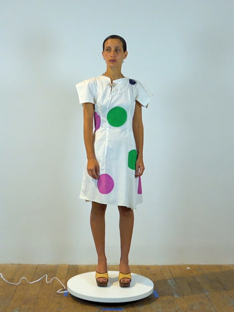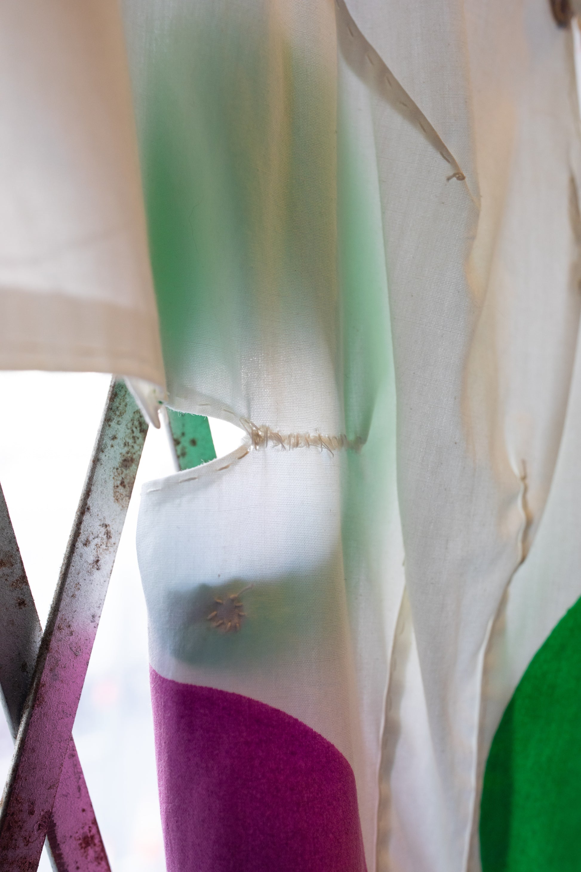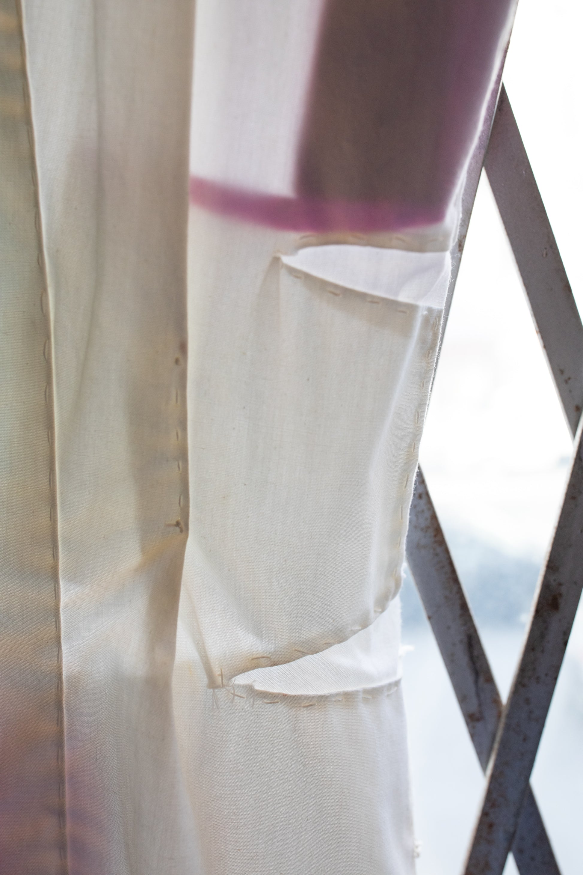 White and navy silk flowers and twist applique at neckline. Bodice of dress is pieced with hand-stitching. White button closure along left side. Sleeves are open rather than hemmed together. RUN label in block print.