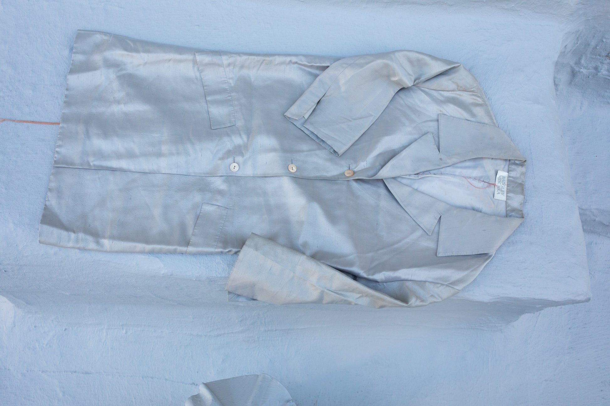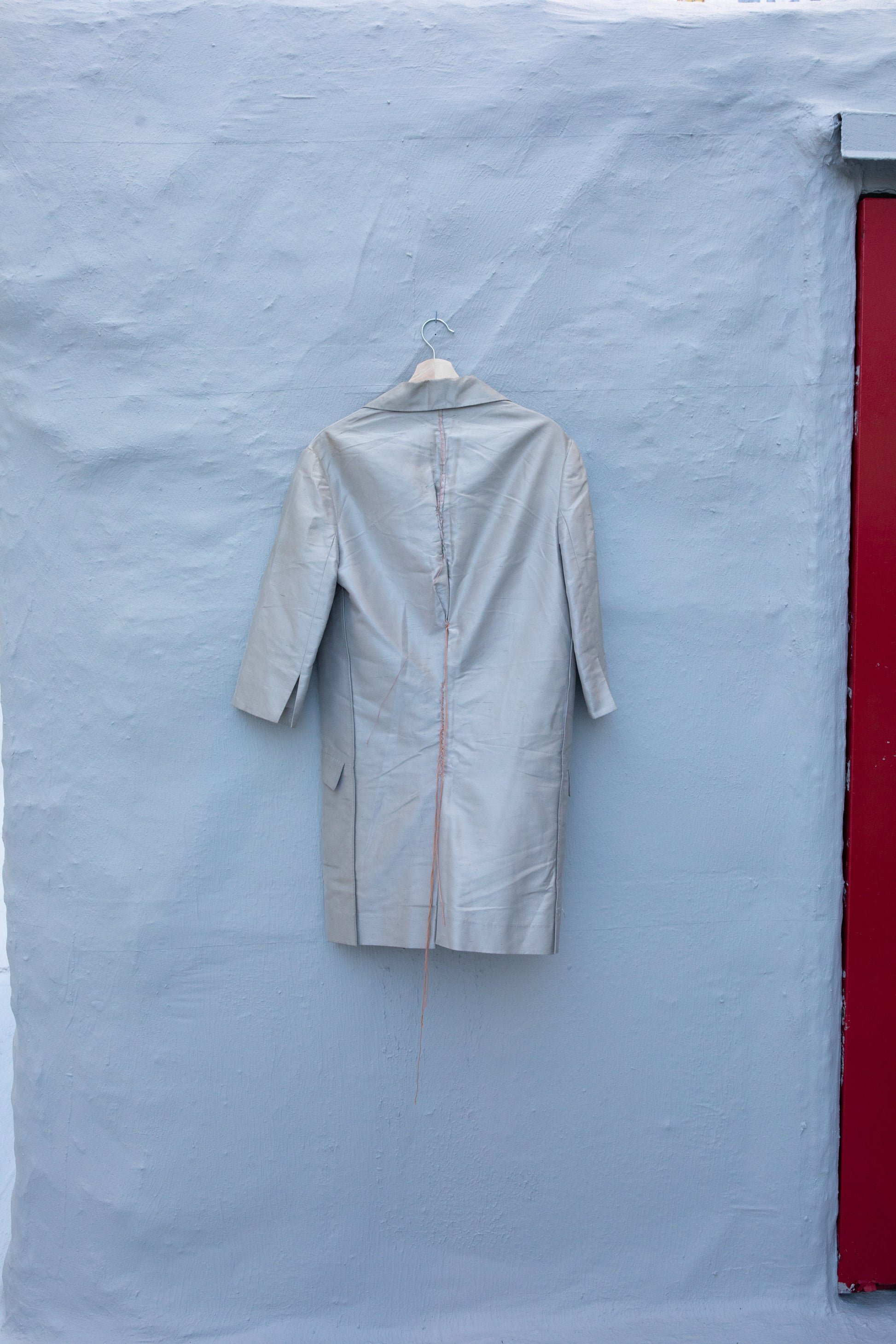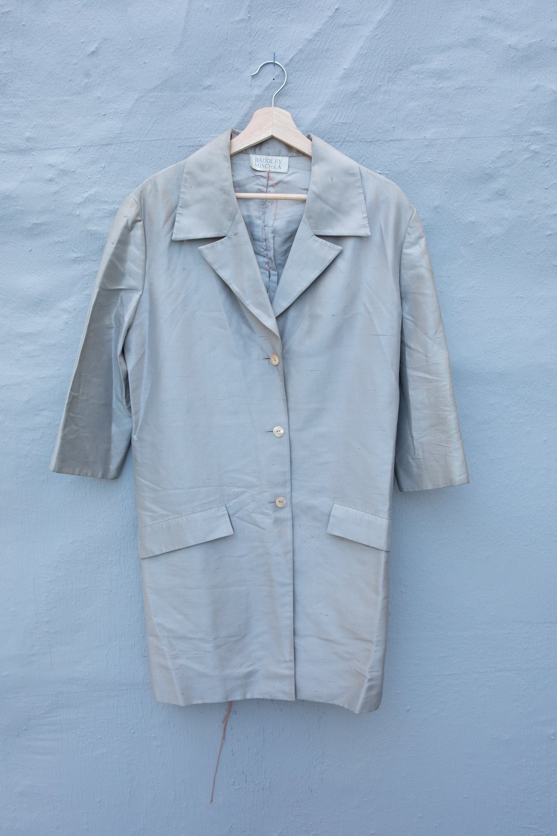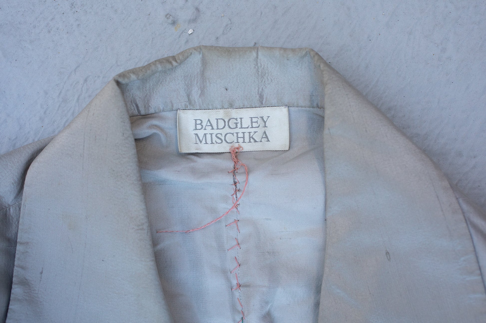 Long silver-grey raw silk Badgley Mischka blazer with designer label. Green and pink embroidery along the back seam and braided pink thread toward bottom of back seam. Minor stain/discoloration in the inside of the garment and another on right lapel collar. Pink-beige button closures.