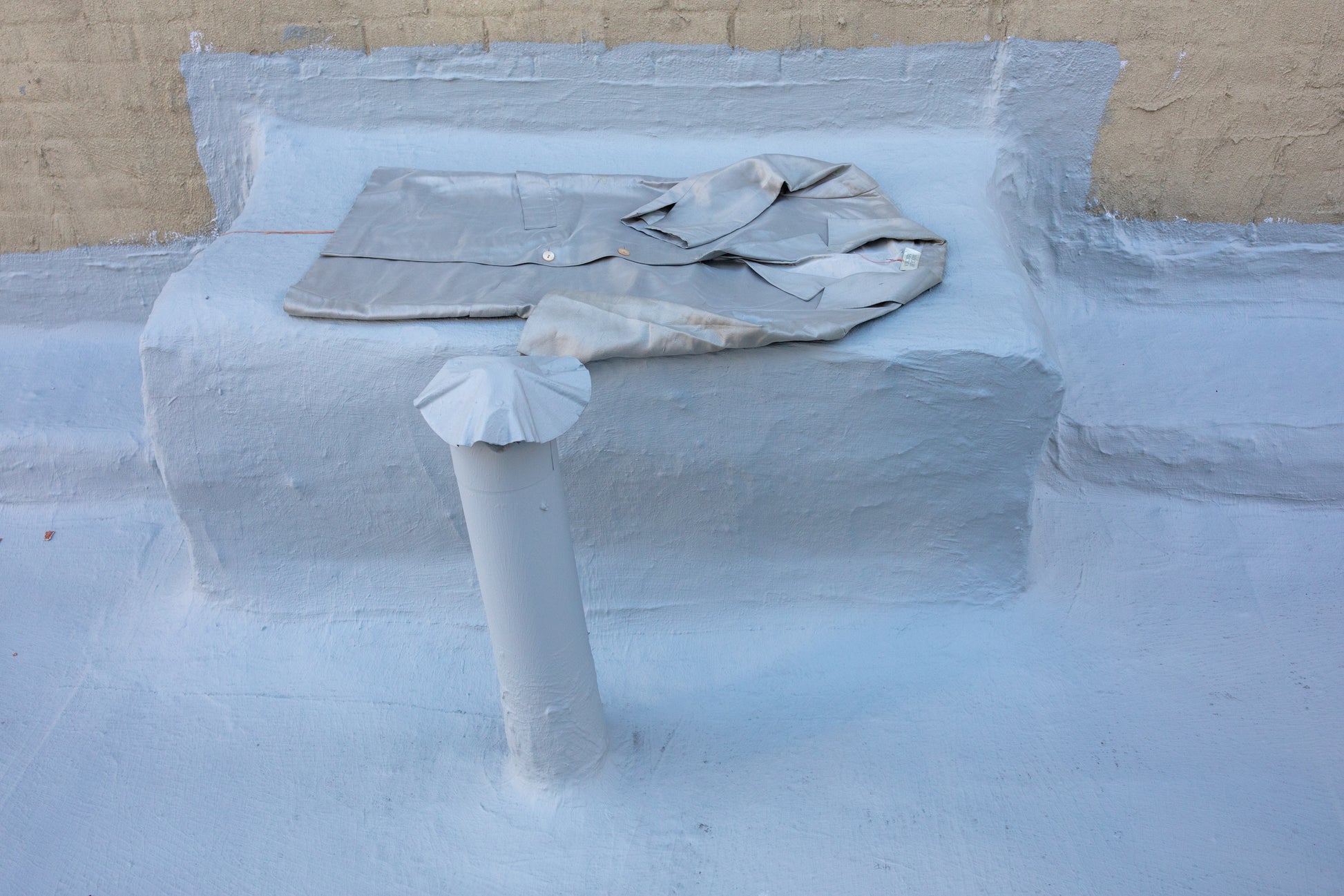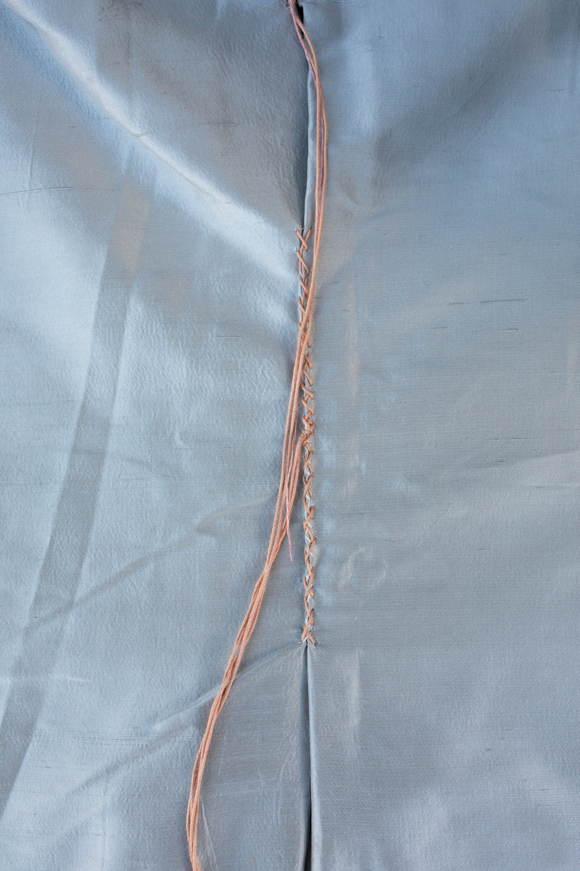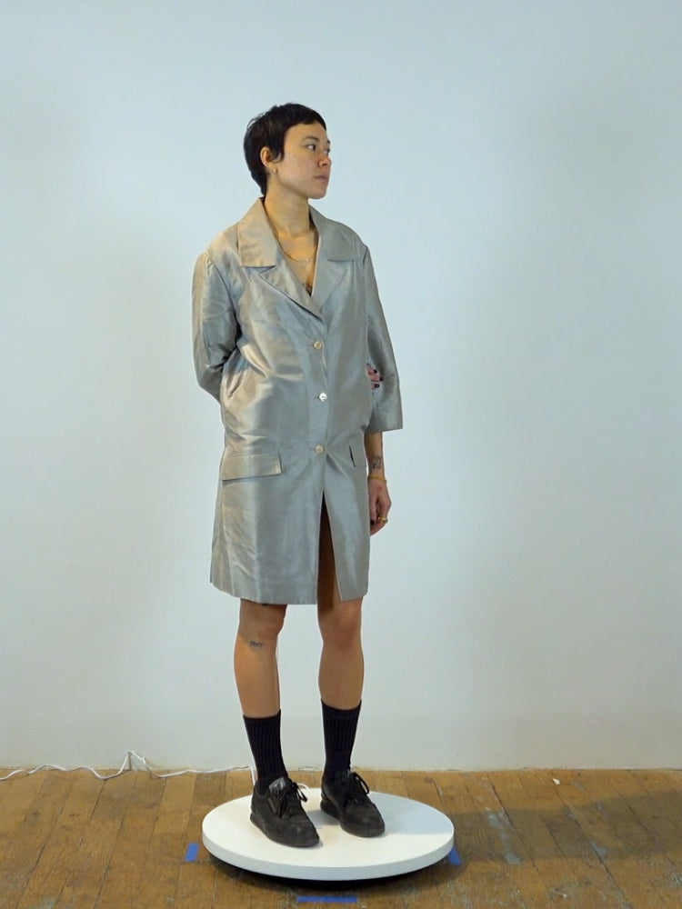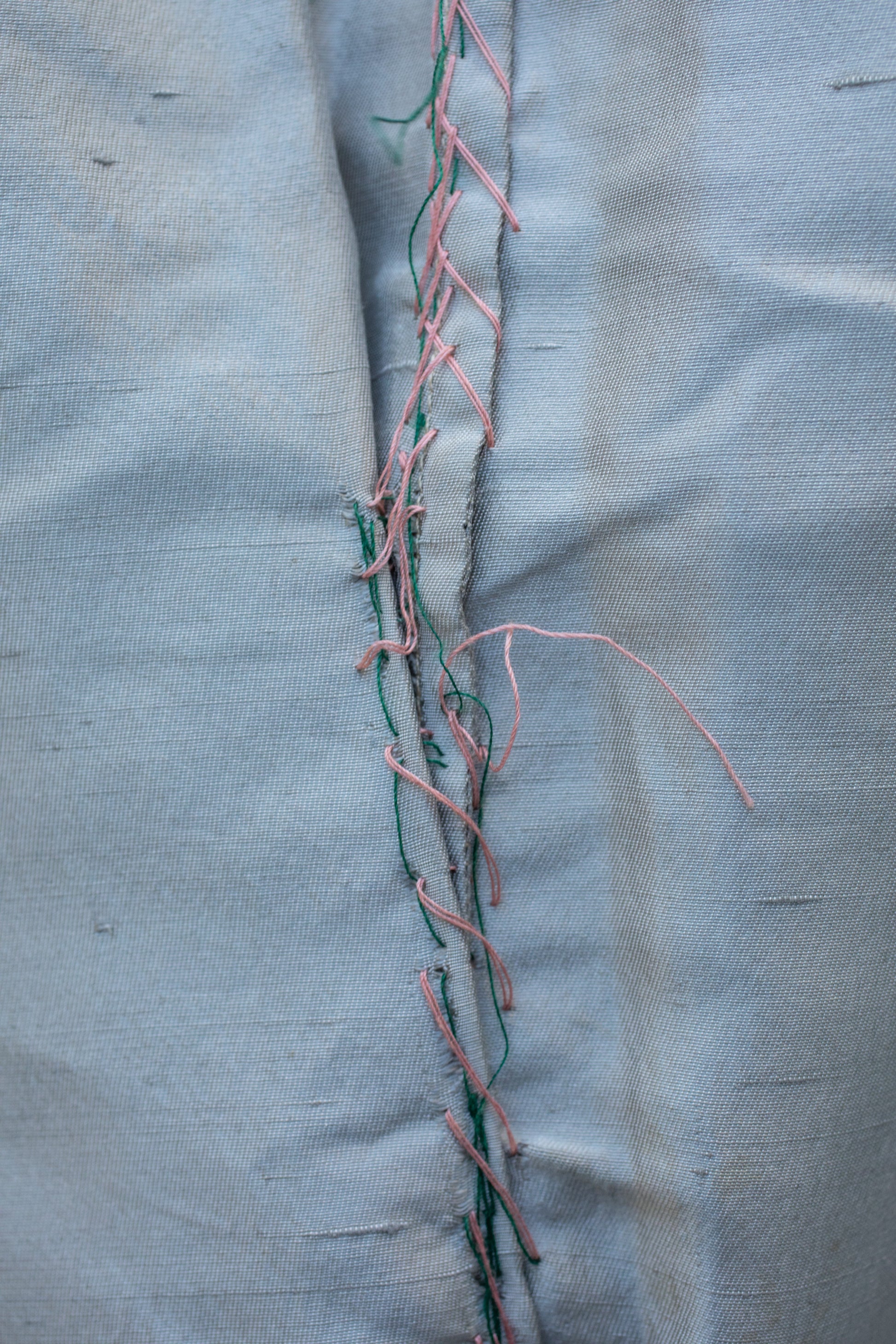 Long silver-grey raw silk Badgley Mischka blazer with designer label. Green and pink embroidery along the back seam and braided pink thread toward bottom of back seam. Minor stain/discoloration in the inside of the garment and another on right lapel collar. Pink-beige button closures.