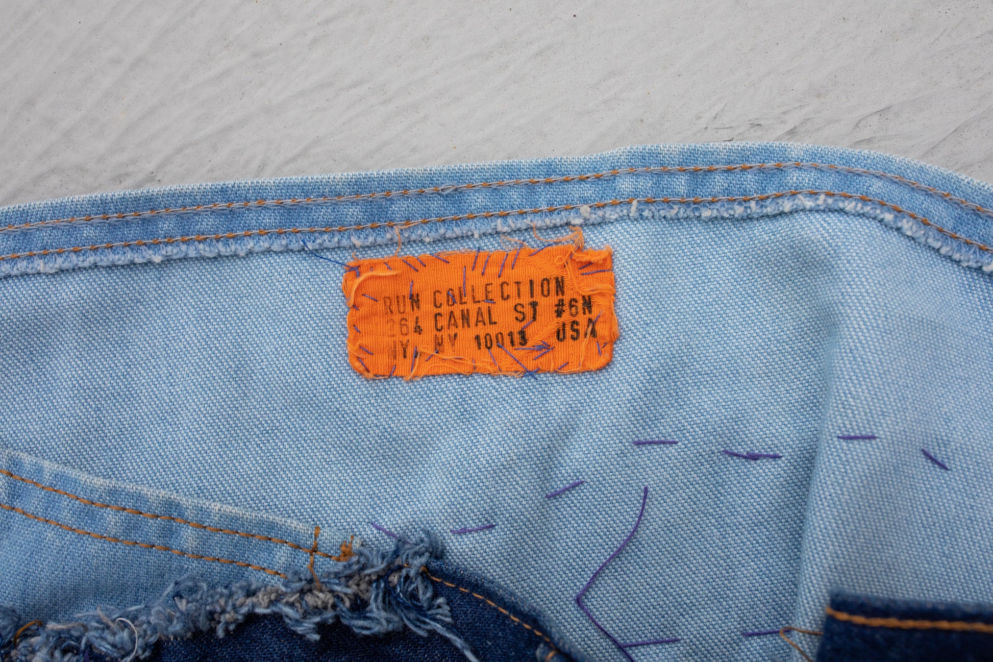 Purple and white stitching details throughout. Multicolored braided yarn sash/toe. Front button closure. Orange inside back waist with RUN Collection logo and Canal street address.