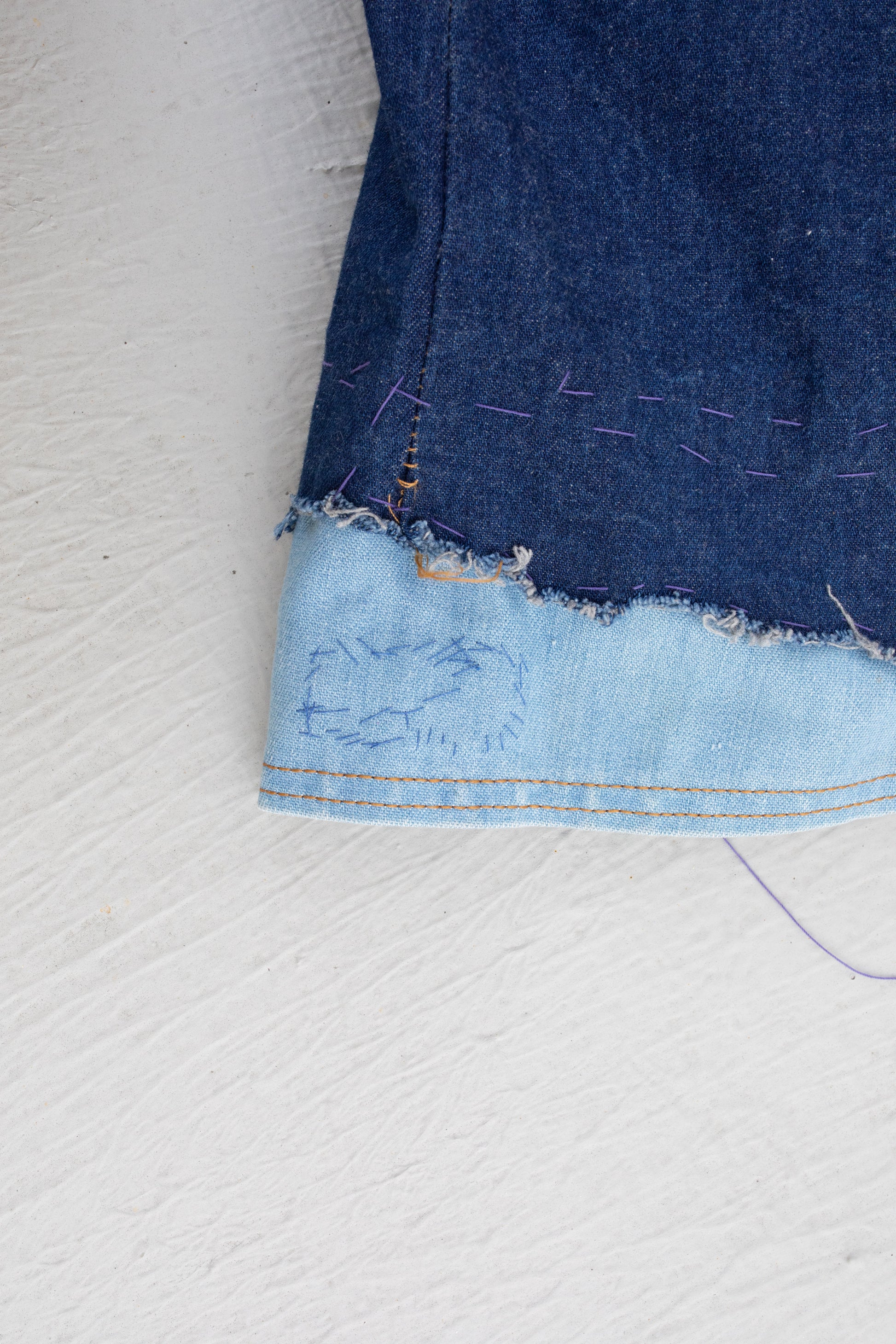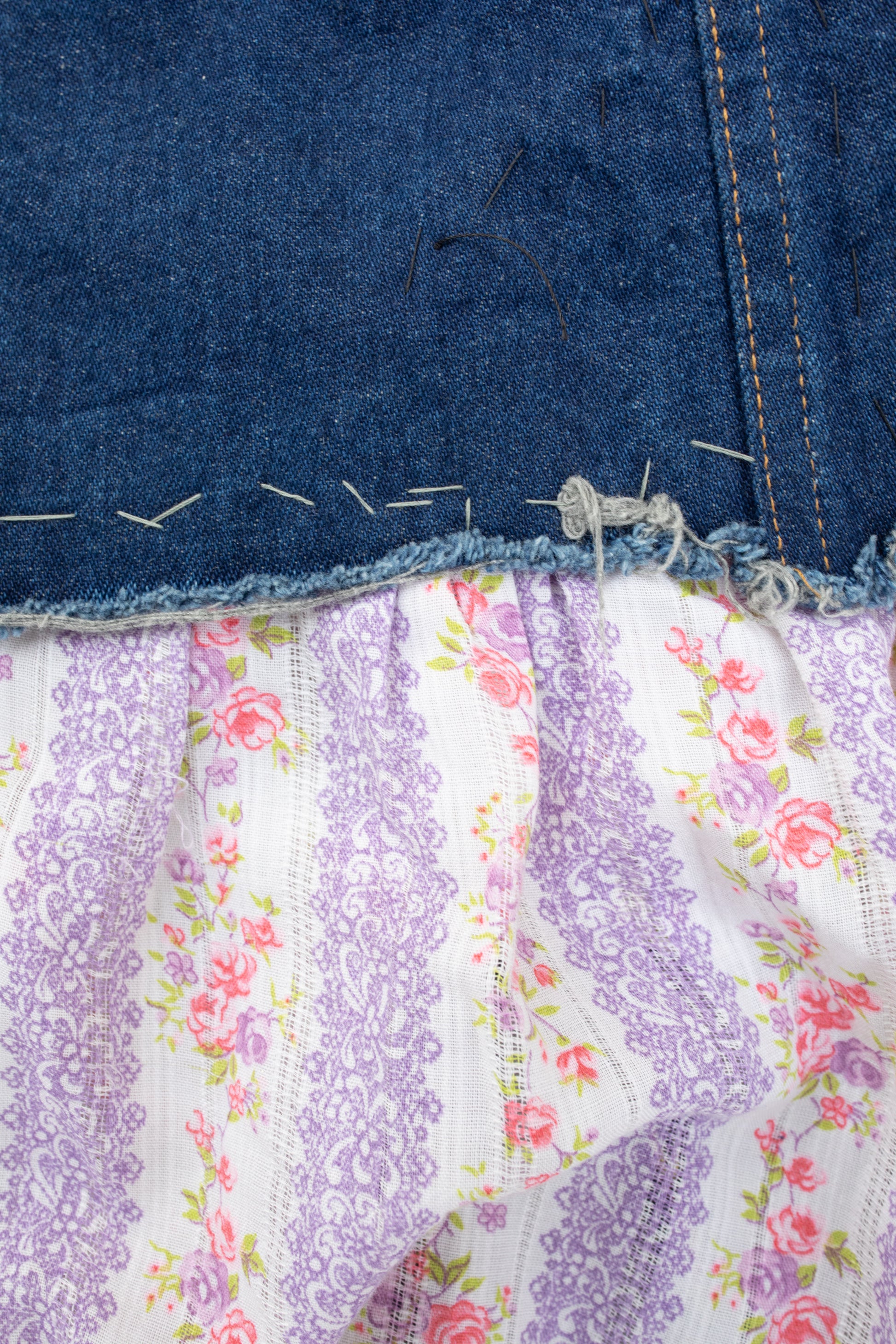 RUN 7 mixed denim distressed wrap skirt with patchwork floral fabric trim.