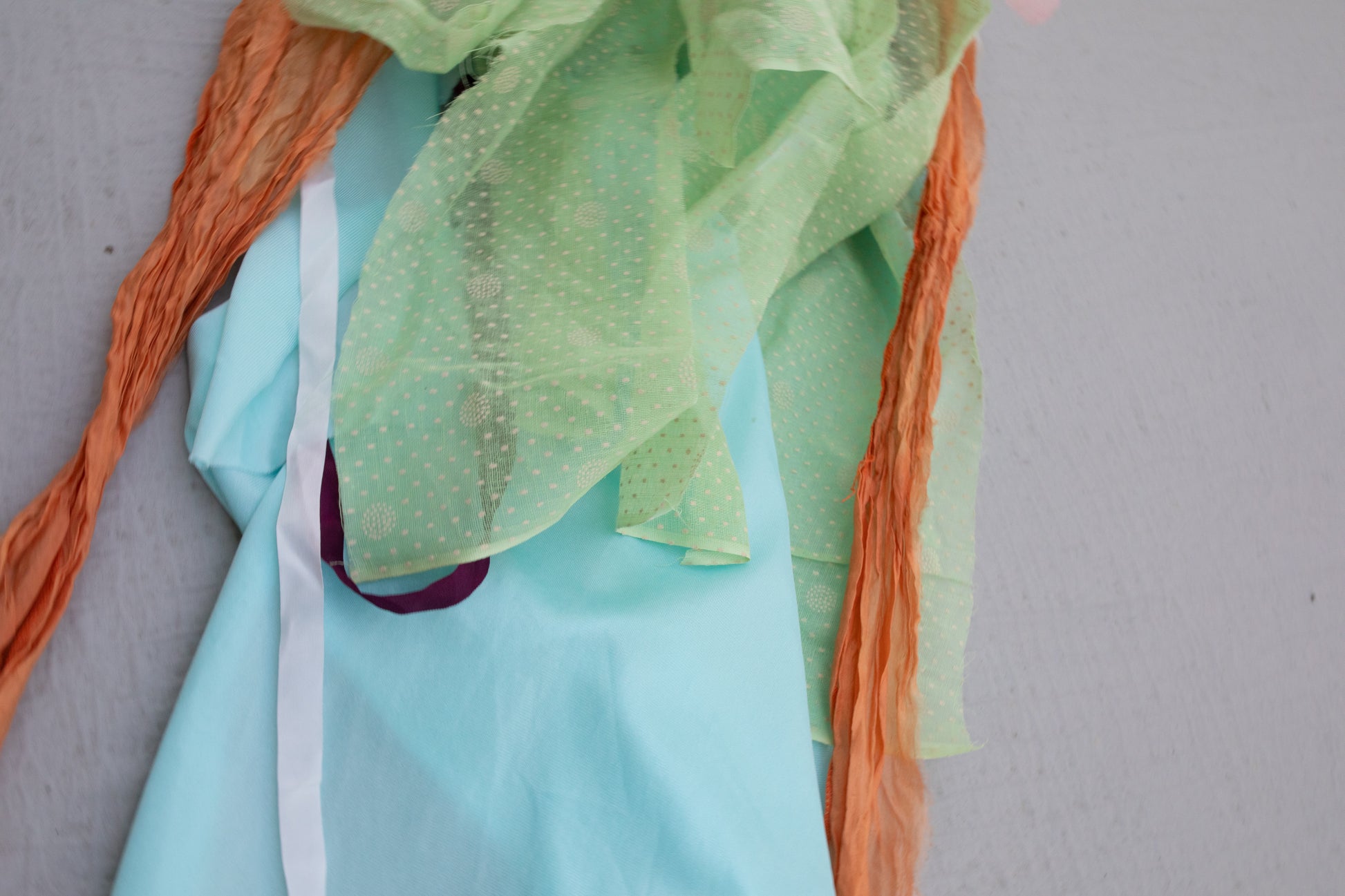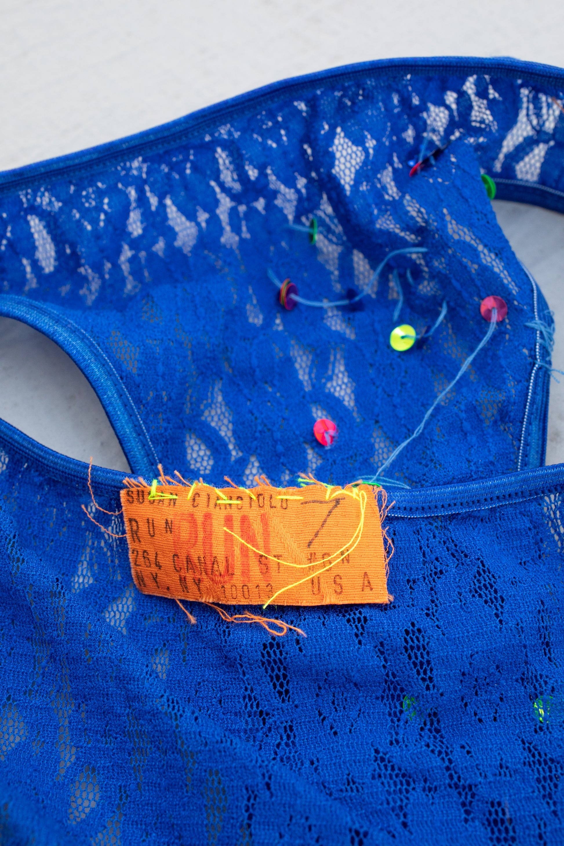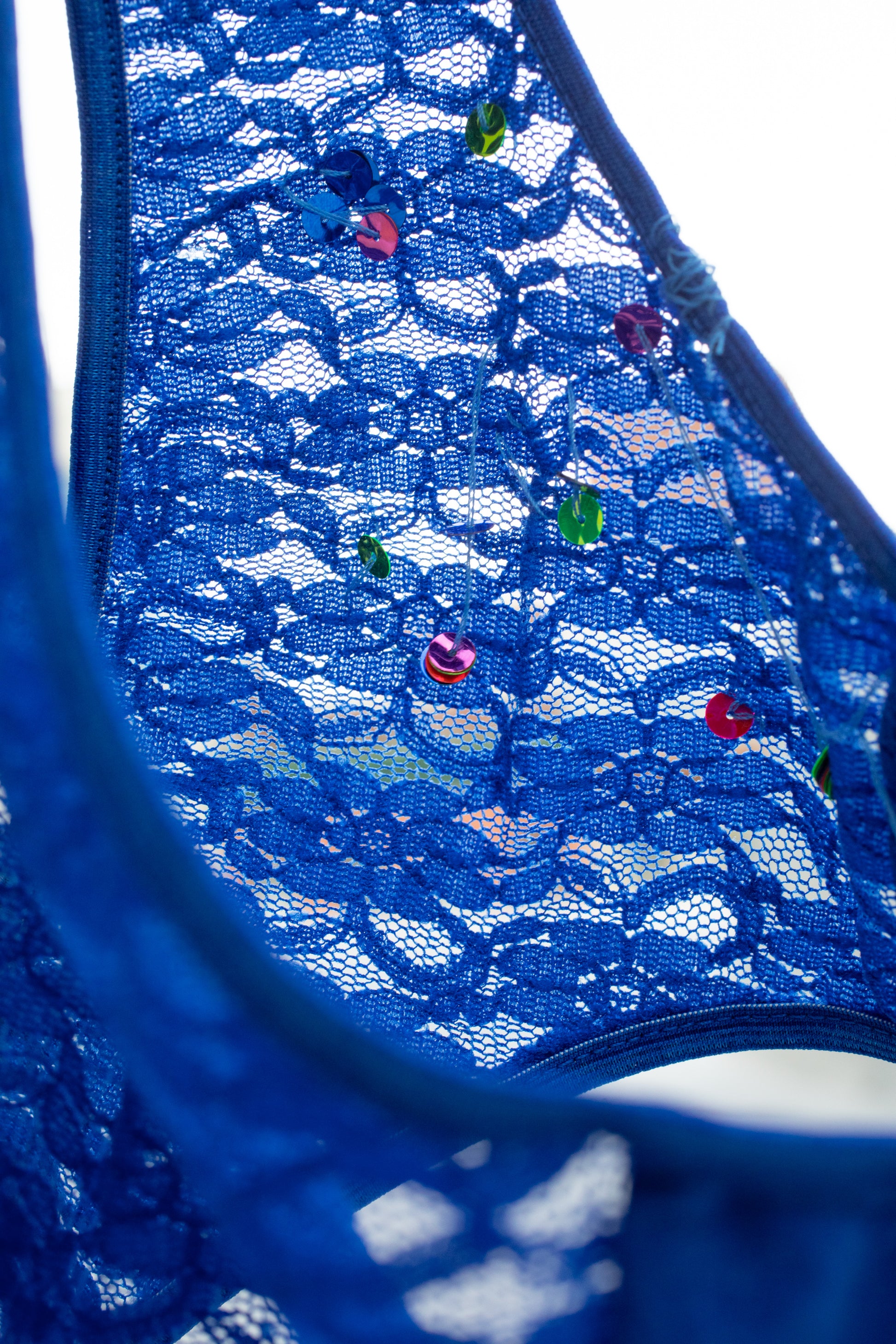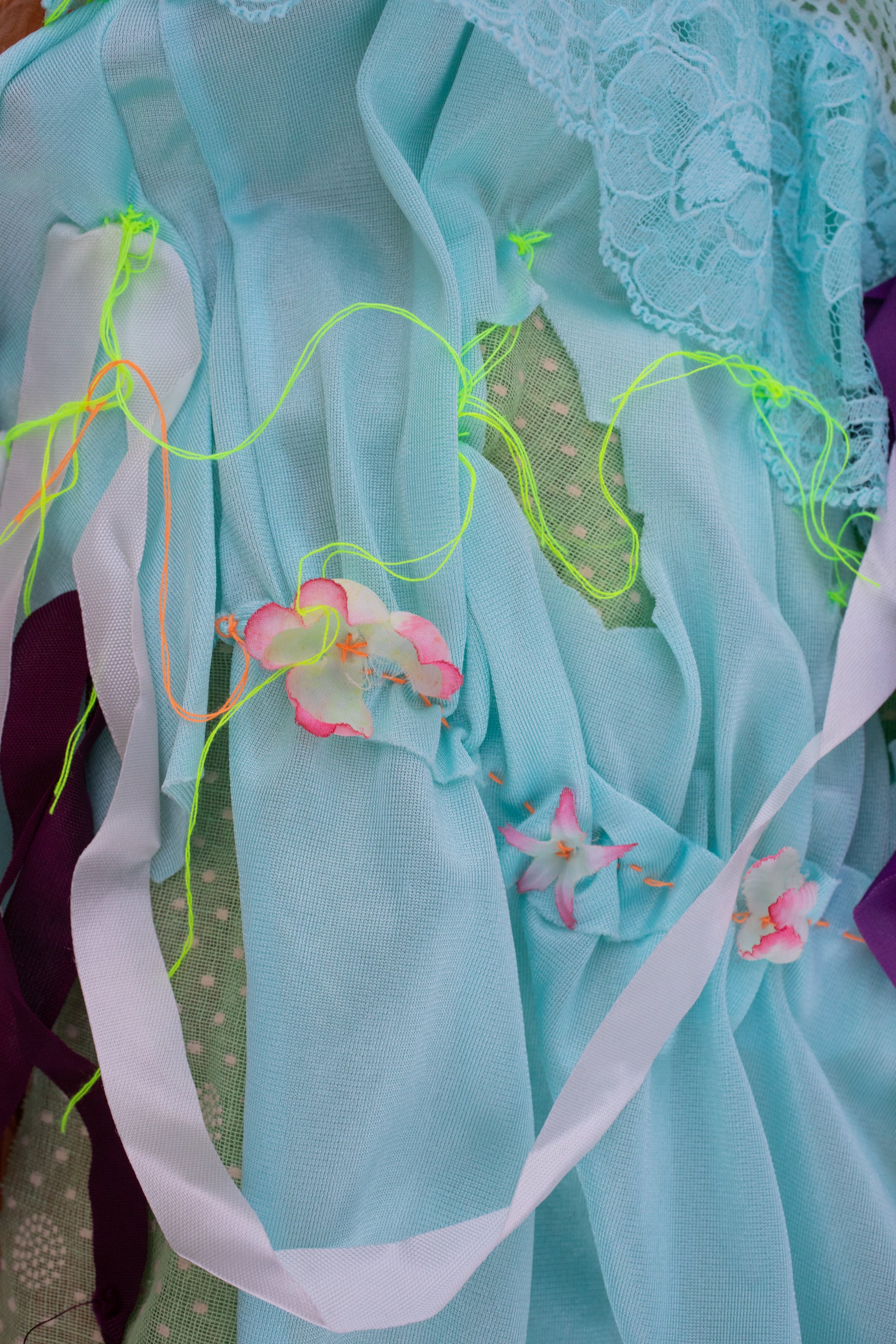 Netted bodice drop waist with lace detail. Tiered, asymmetrical skirt comprised of mixed fabrics with ribbon details and fabric flower accents. Small hoops and fabric flowers at neck lines. Blue lace bikini cut undergarment with hand-sewn sequins. Has good amount of stretch.