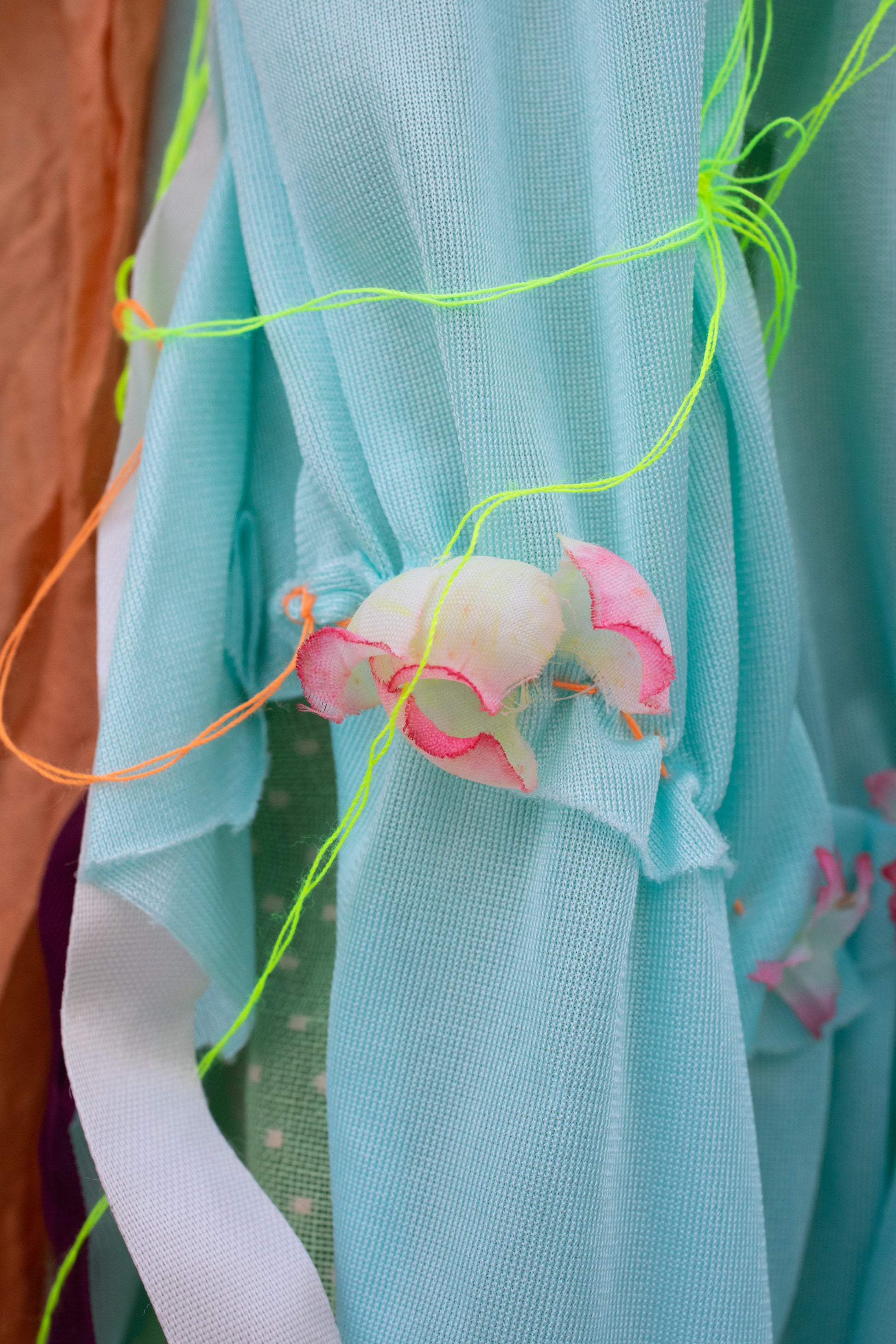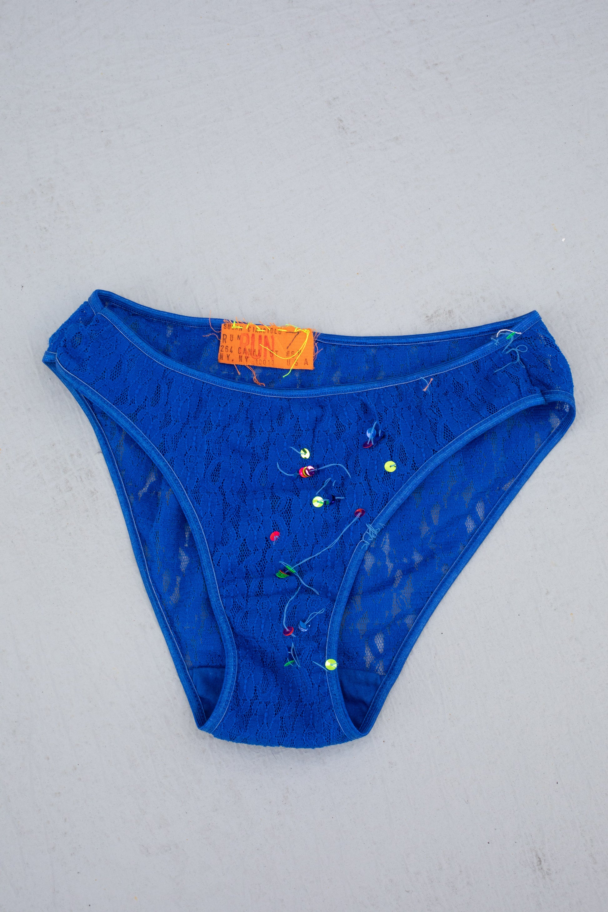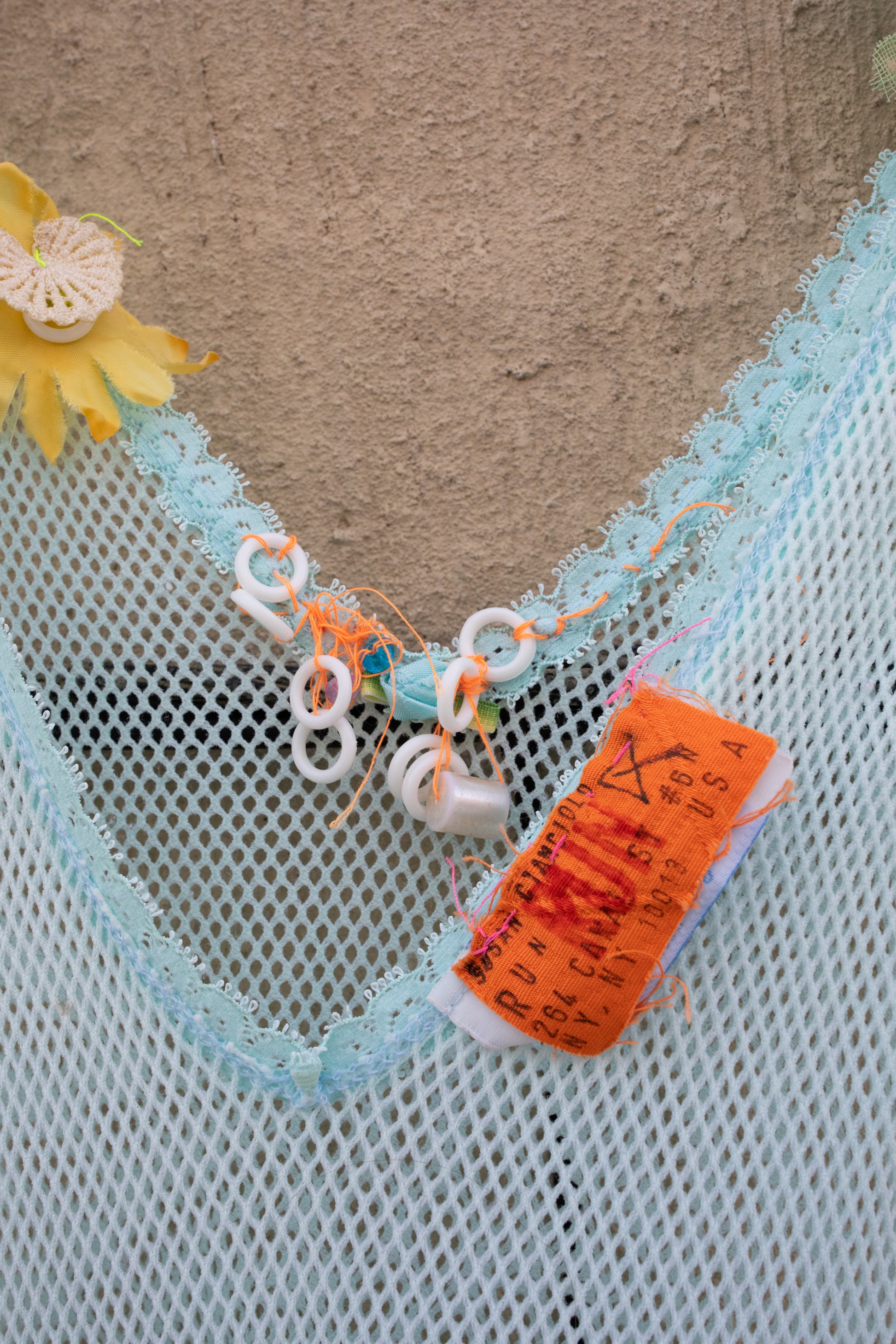 Netted bodice drop waist with lace detail. Tiered, asymmetrical skirt comprised of mixed fabrics with ribbon details and fabric flower accents. Small hoops and fabric flowers at neck lines. Blue lace bikini cut undergarment with hand-sewn sequins. Has good amount of stretch.