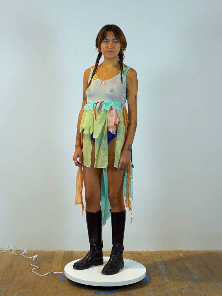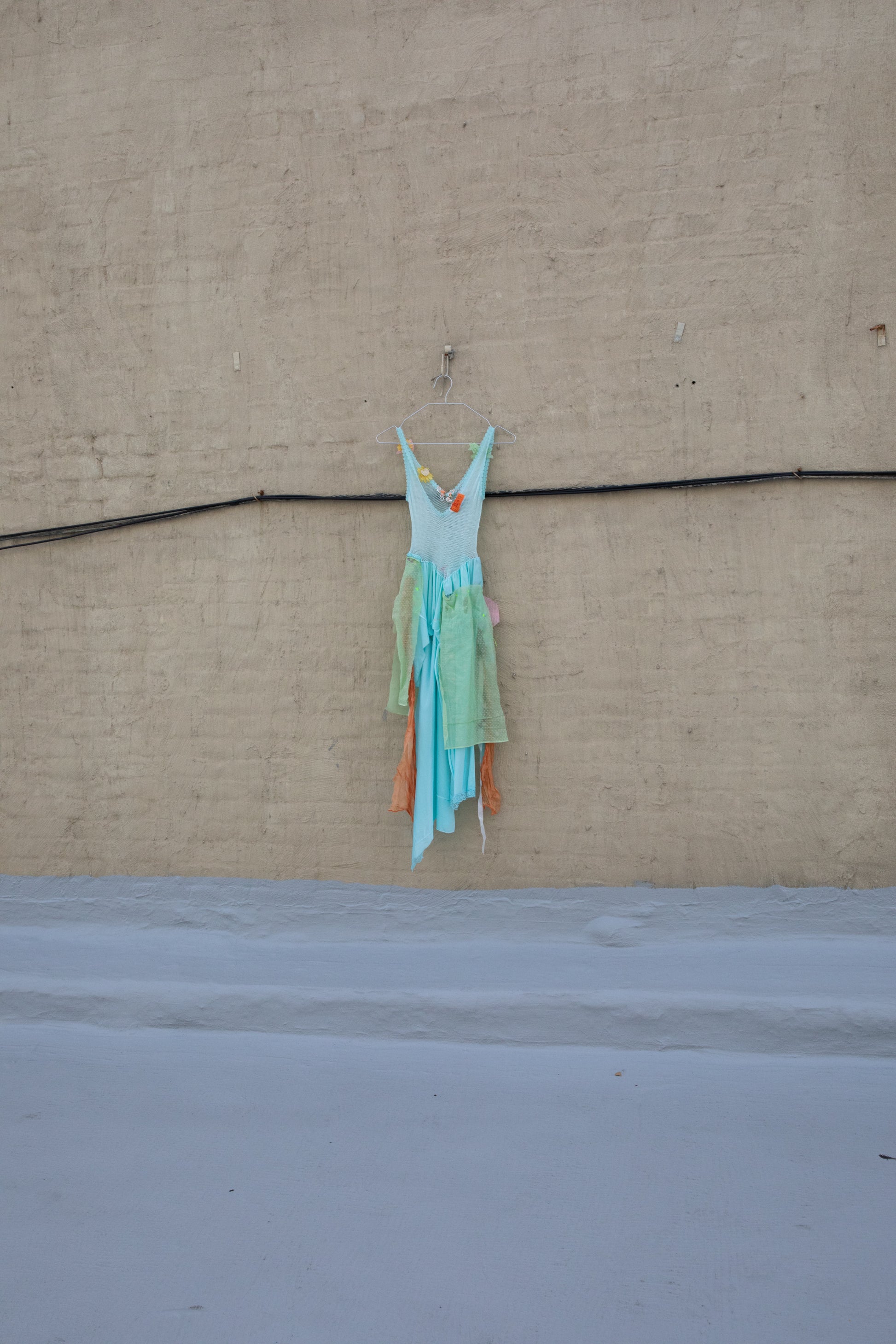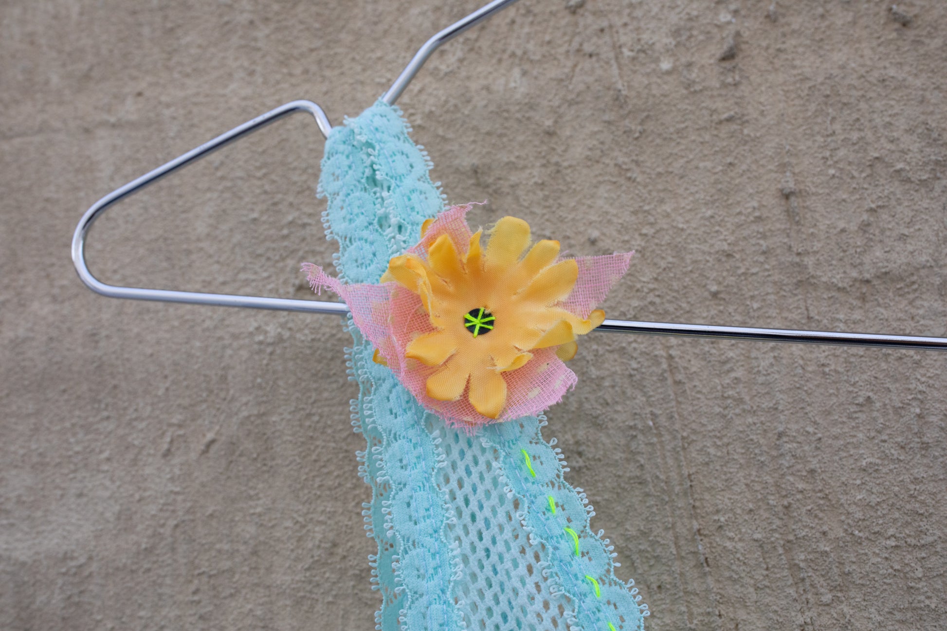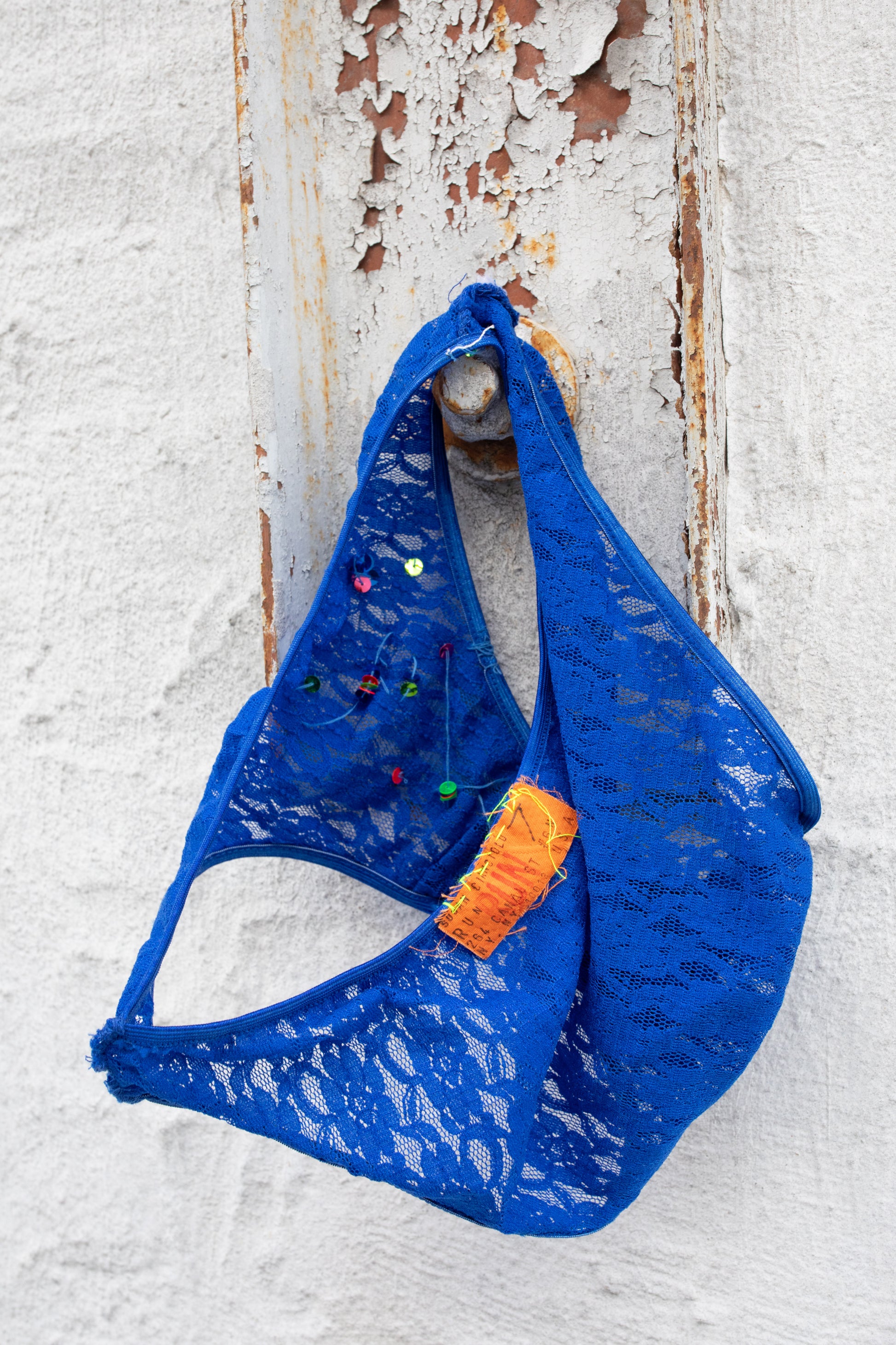 Netted bodice drop waist with lace detail. Tiered, asymmetrical skirt comprised of mixed fabrics with ribbon details and fabric flower accents. Small hoops and fabric flowers at neck lines. Blue lace bikini cut undergarment with hand-sewn sequins. Has good amount of stretch.