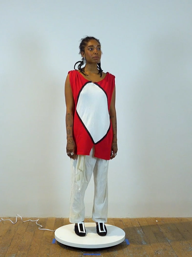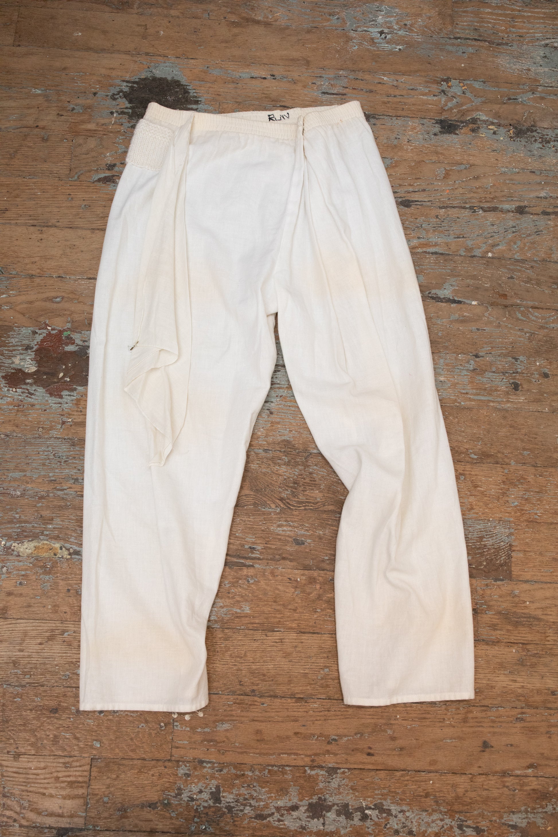 RUN 5 ivory elastic waist band pants with front flap detail attached by small safety pin.