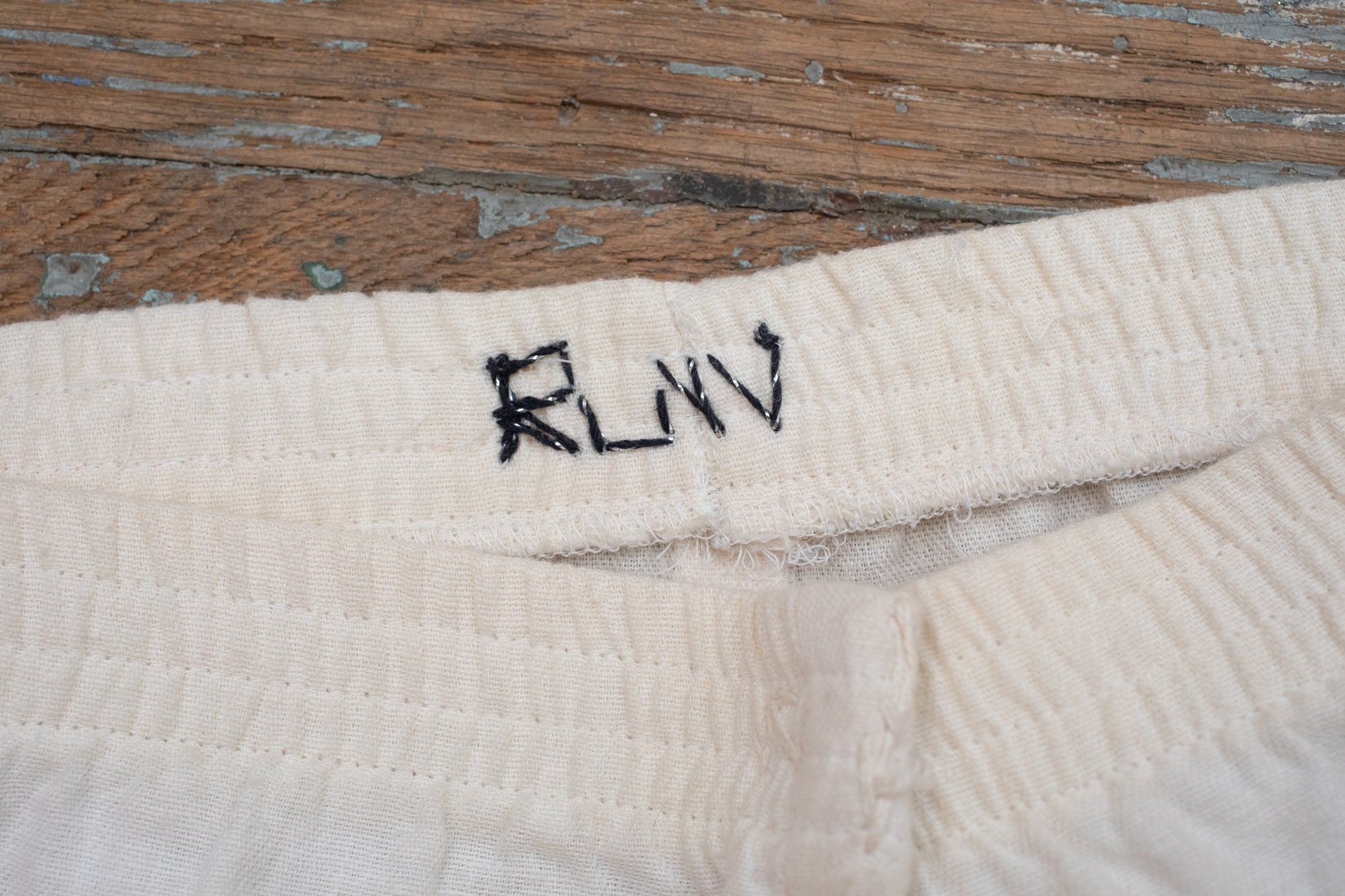 Slight discoloration throughout. RUN embroidered in black metallic thread inside back of waistband. Knit back pocket in ivory metallic yarn. Wide leg, slightly tapered. Fabric feels like cotton/linen blend.