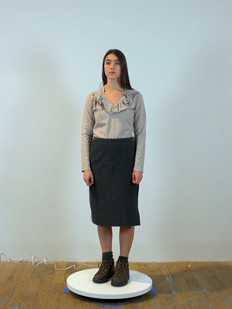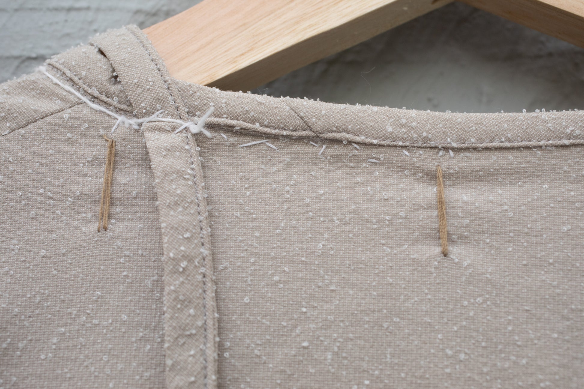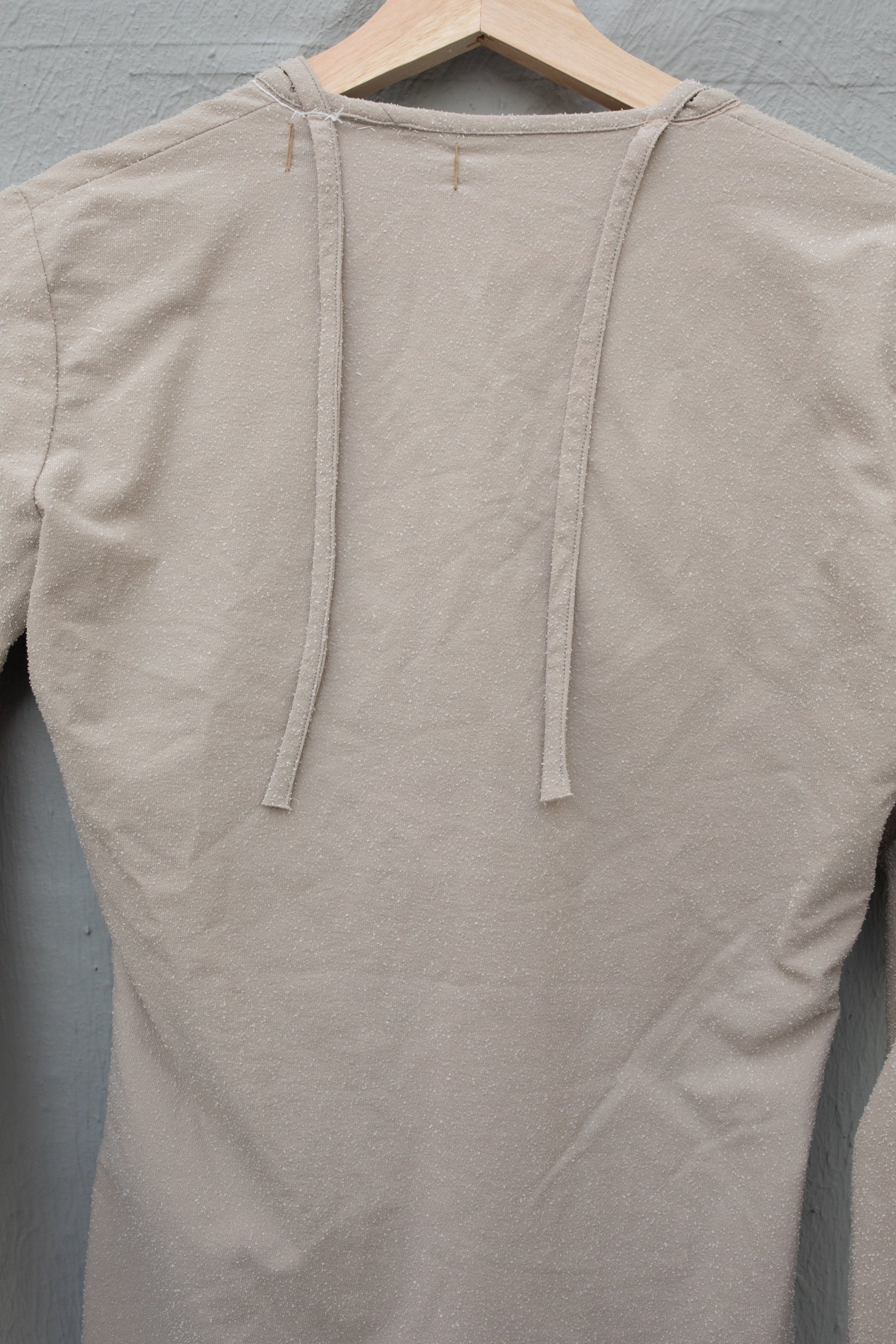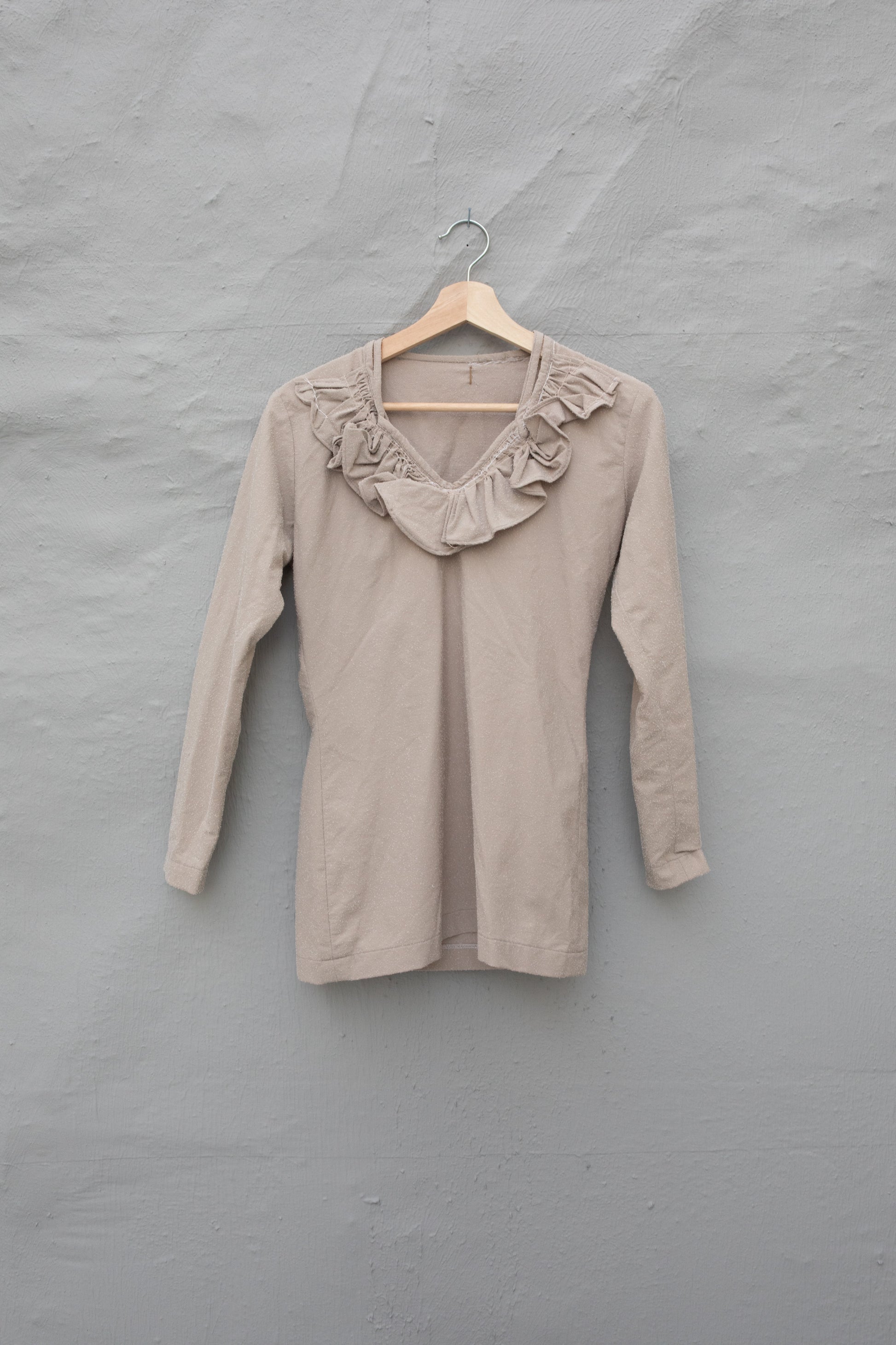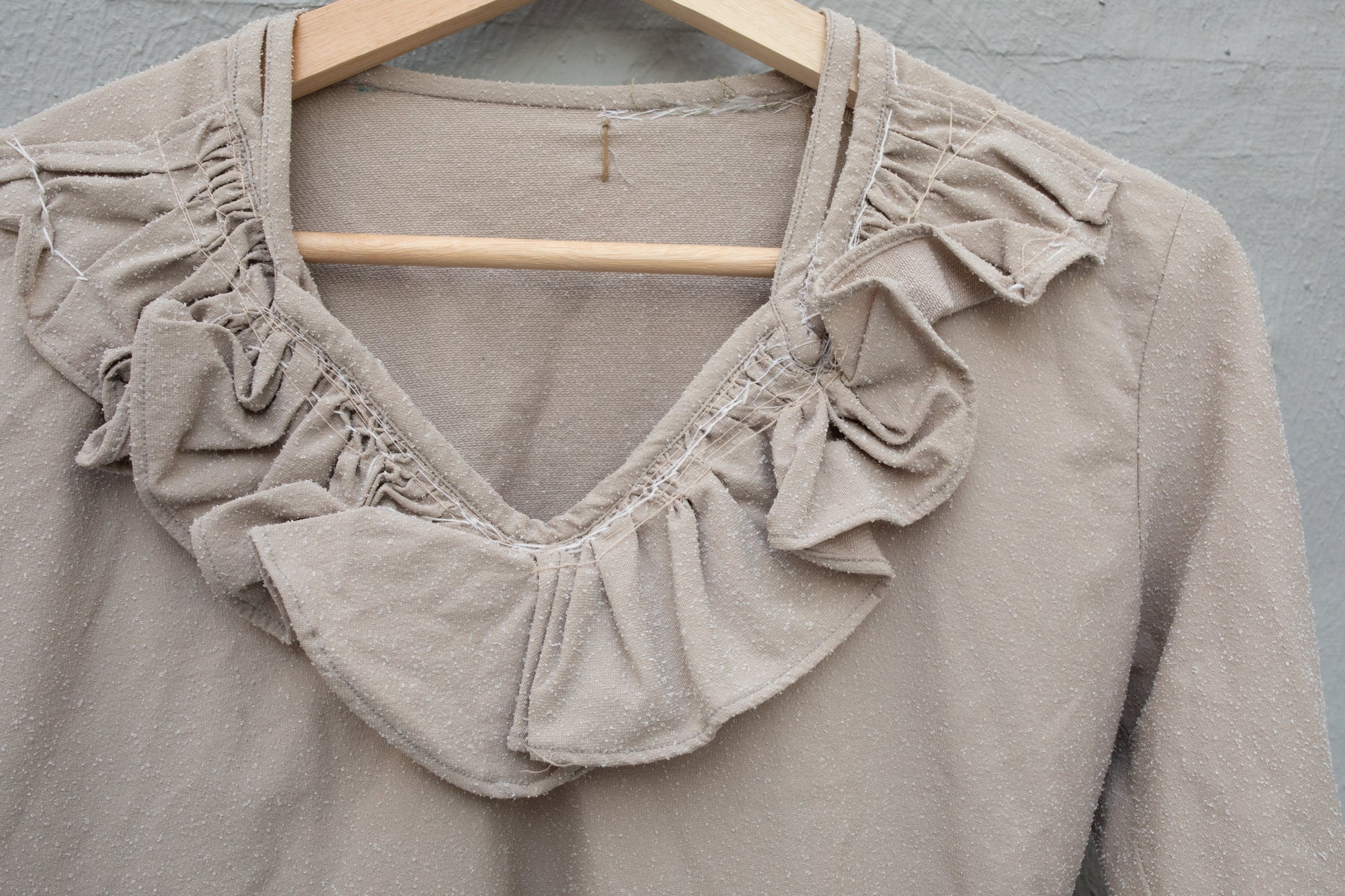 RUN 4 beige nubby cotton long sleeve blouse with ruffle collar with hand-stitching.