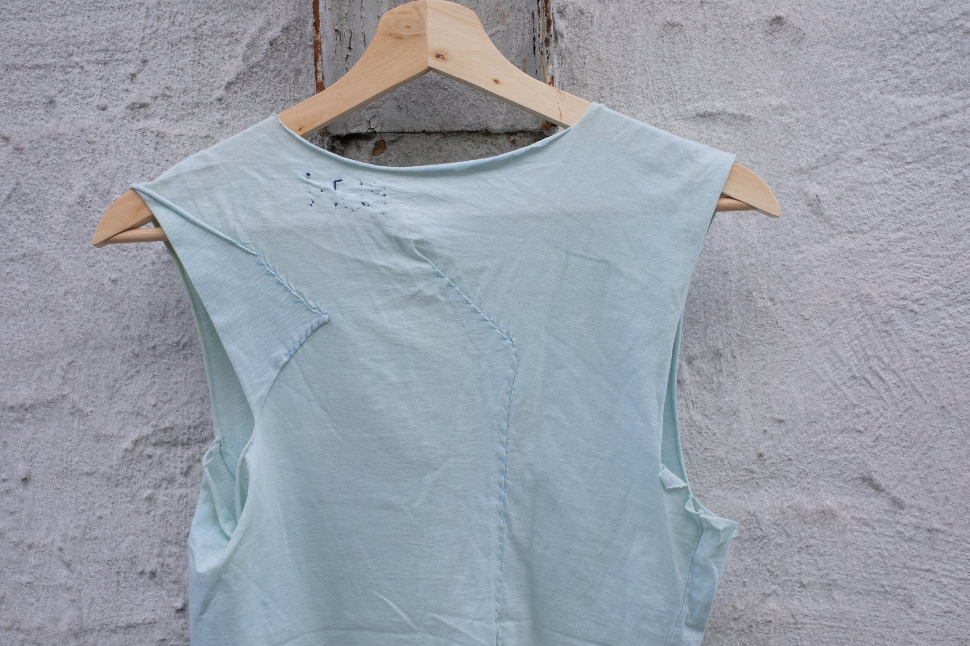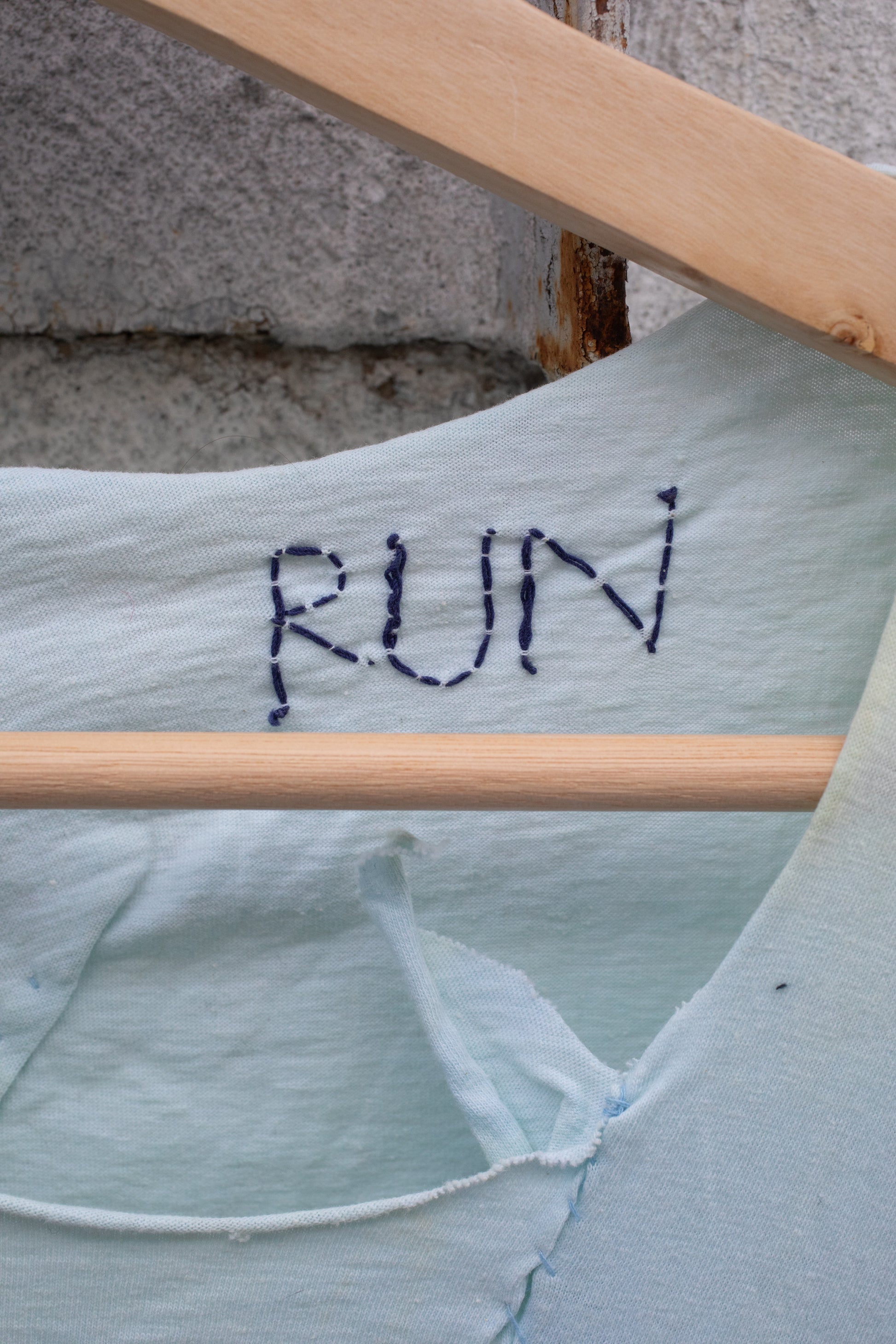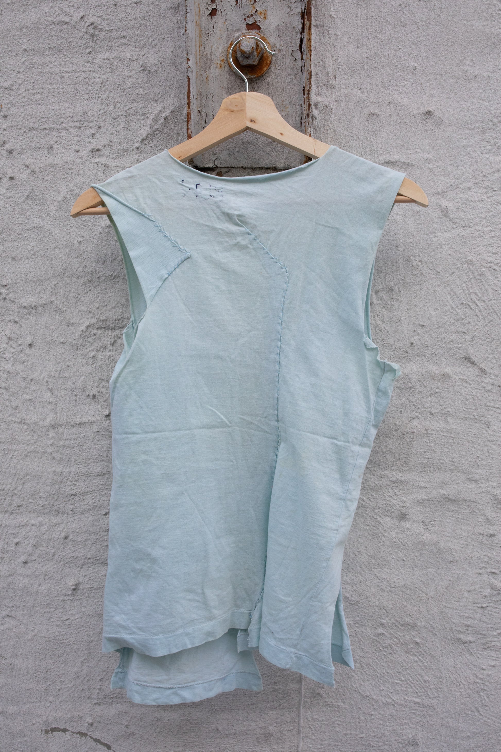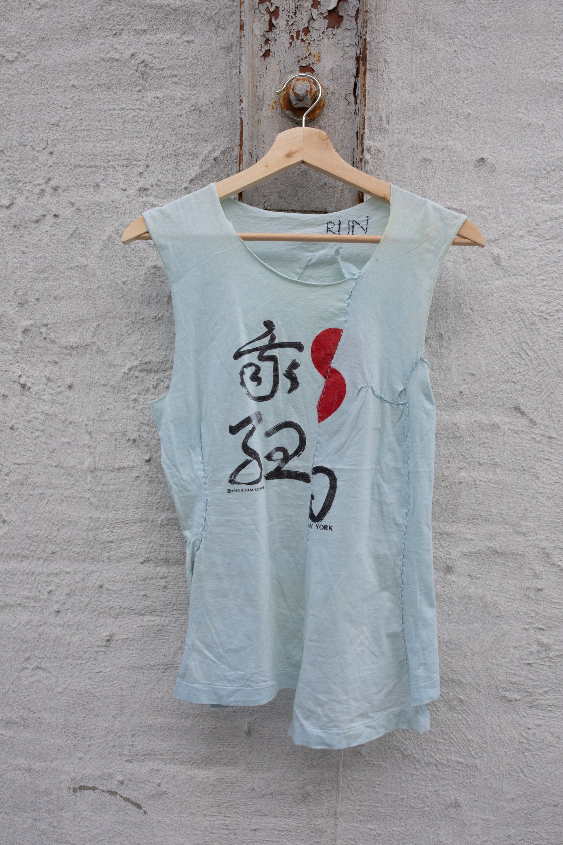 Custom piece during RUN 7: Hand-stitched, pieced pale blue tank with Chinese calligraphy characters on front.