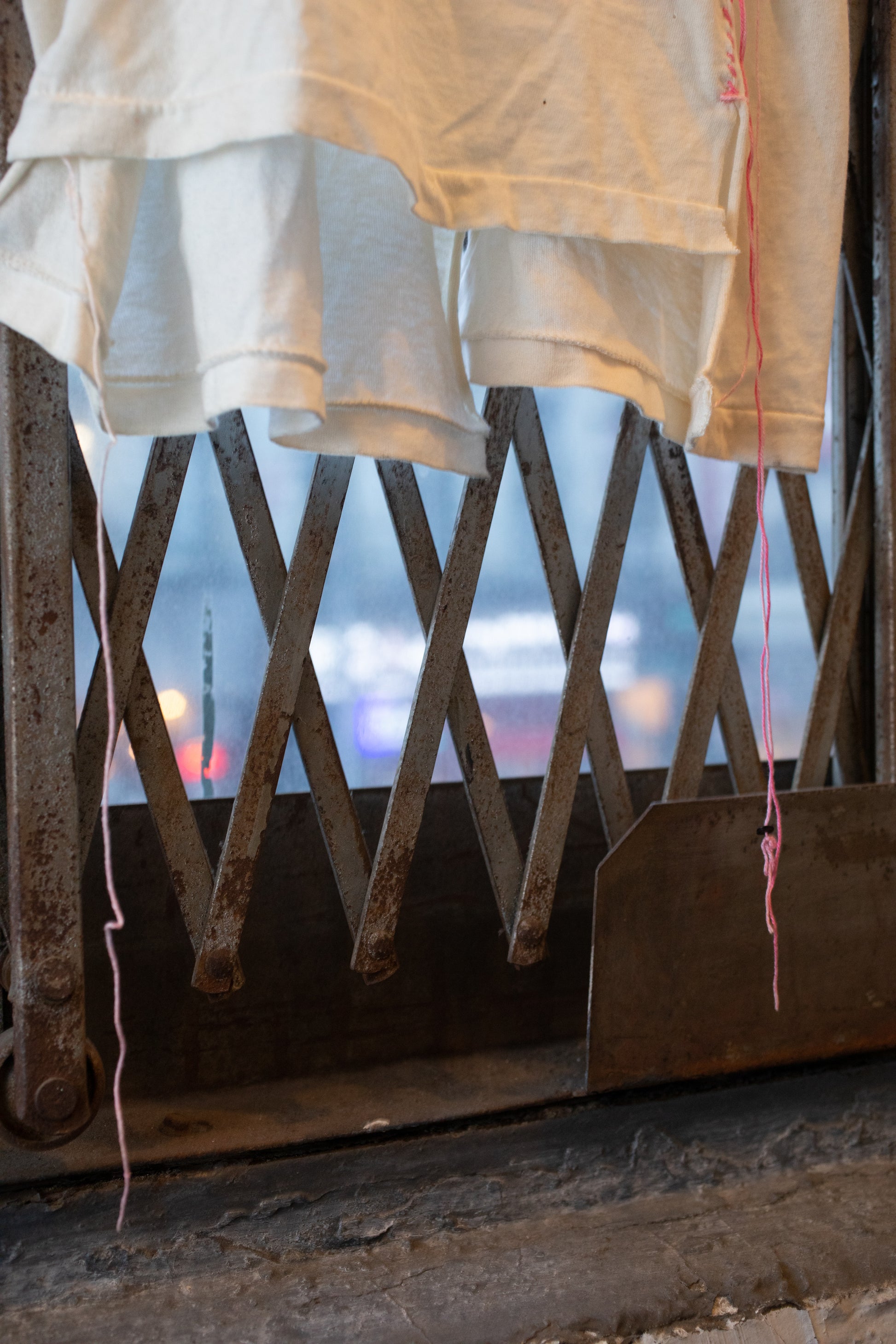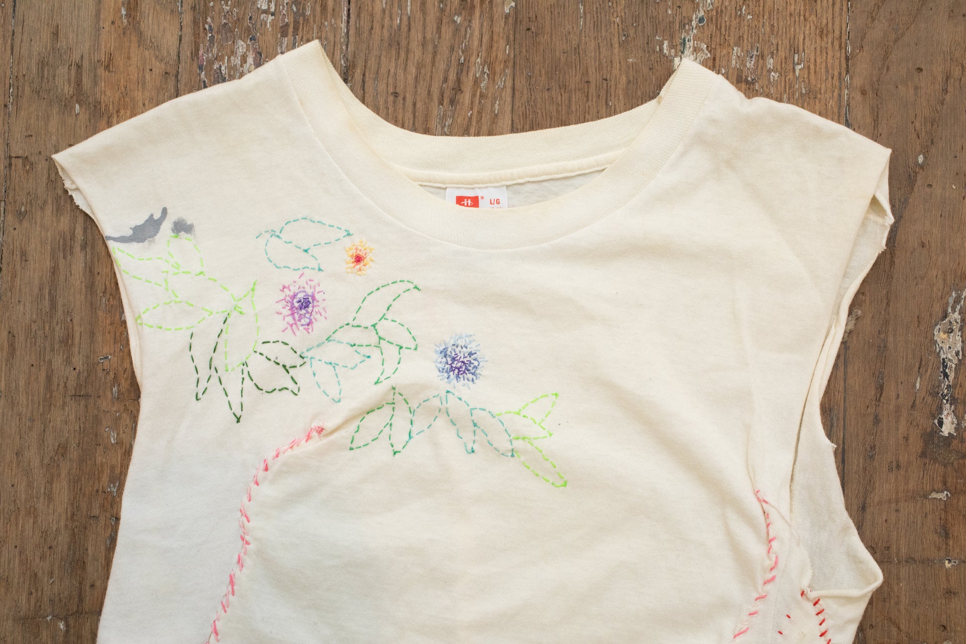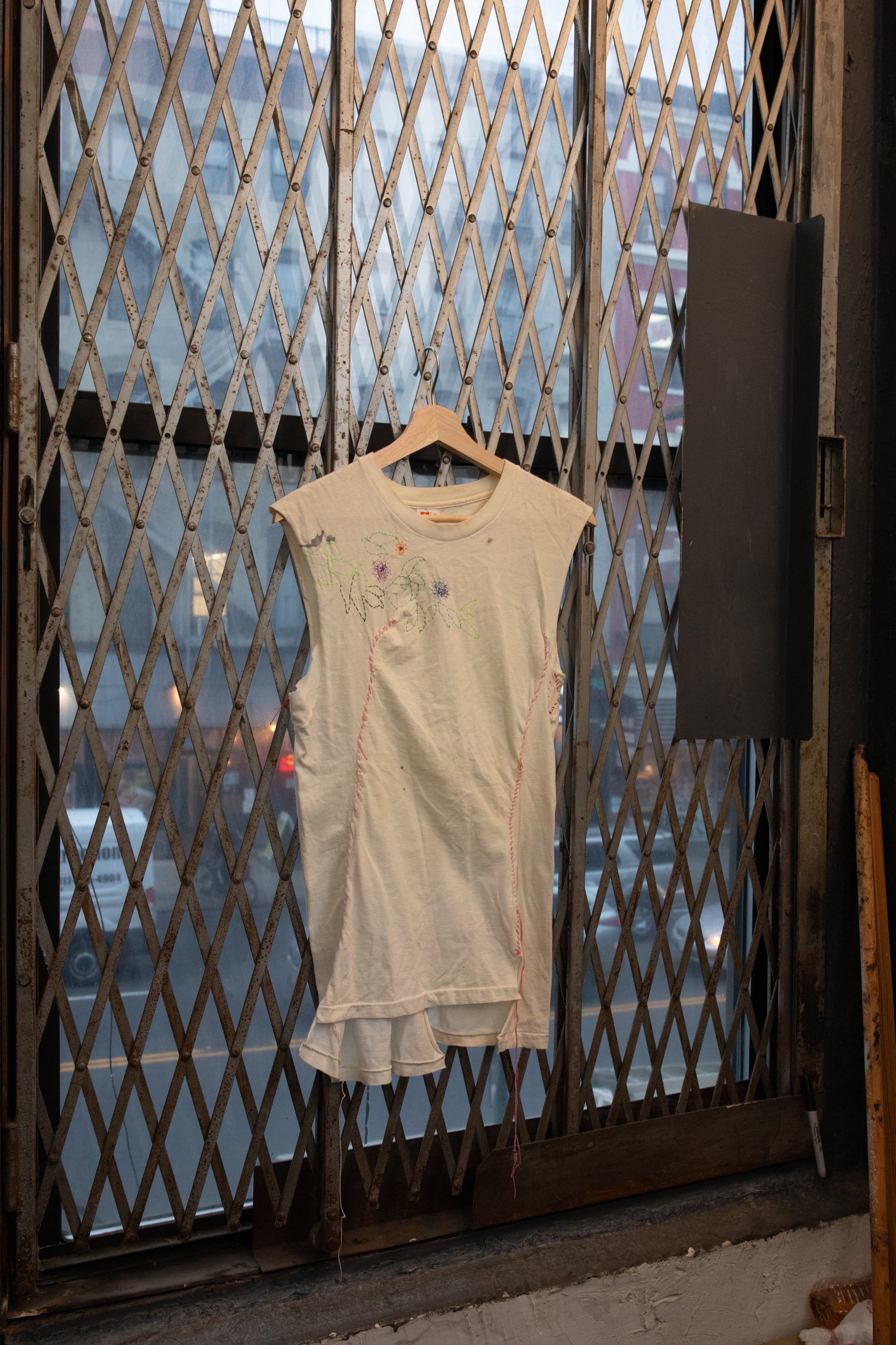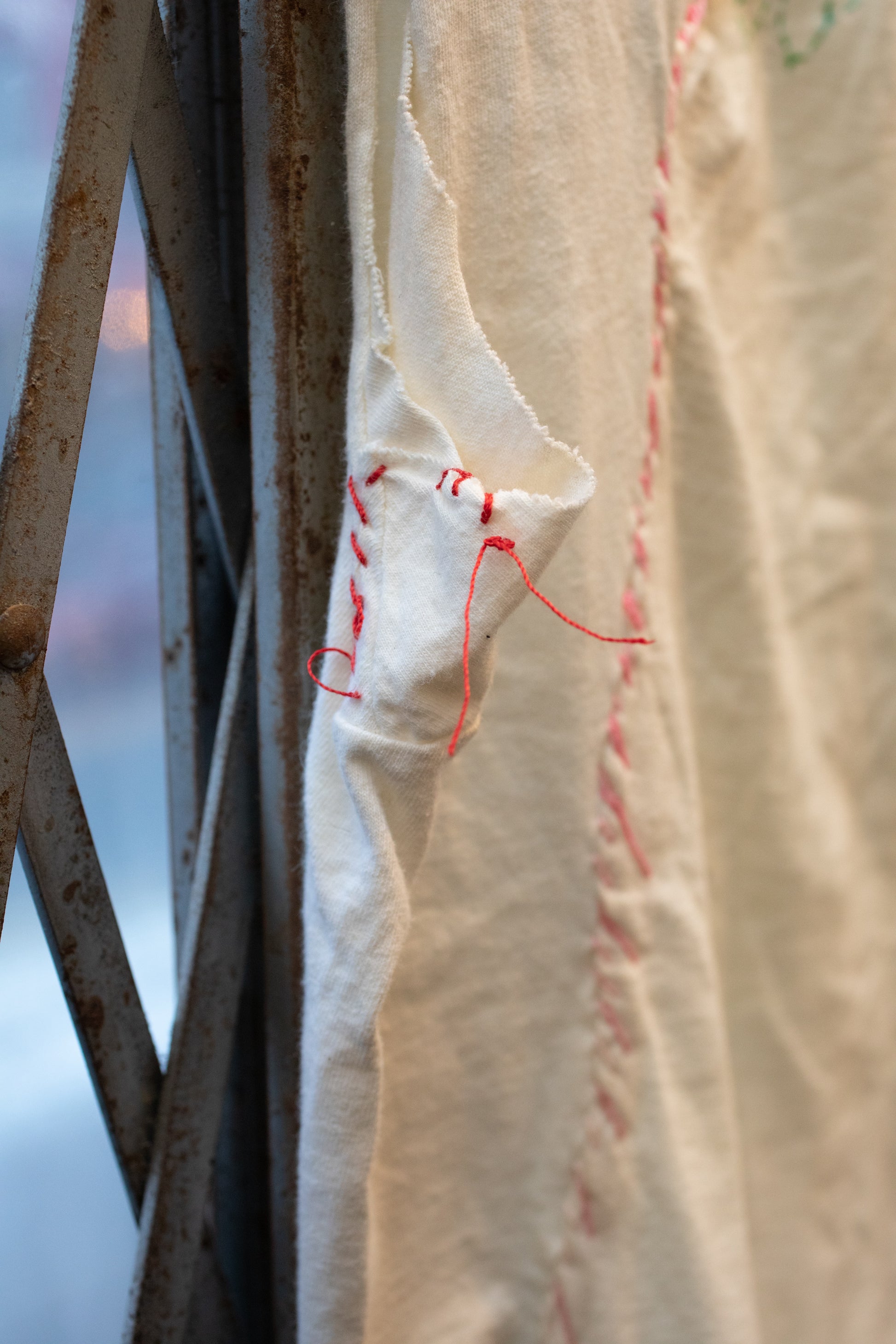 Pink stitching at bottom hem and multicolored hanging thread and ribbon details.