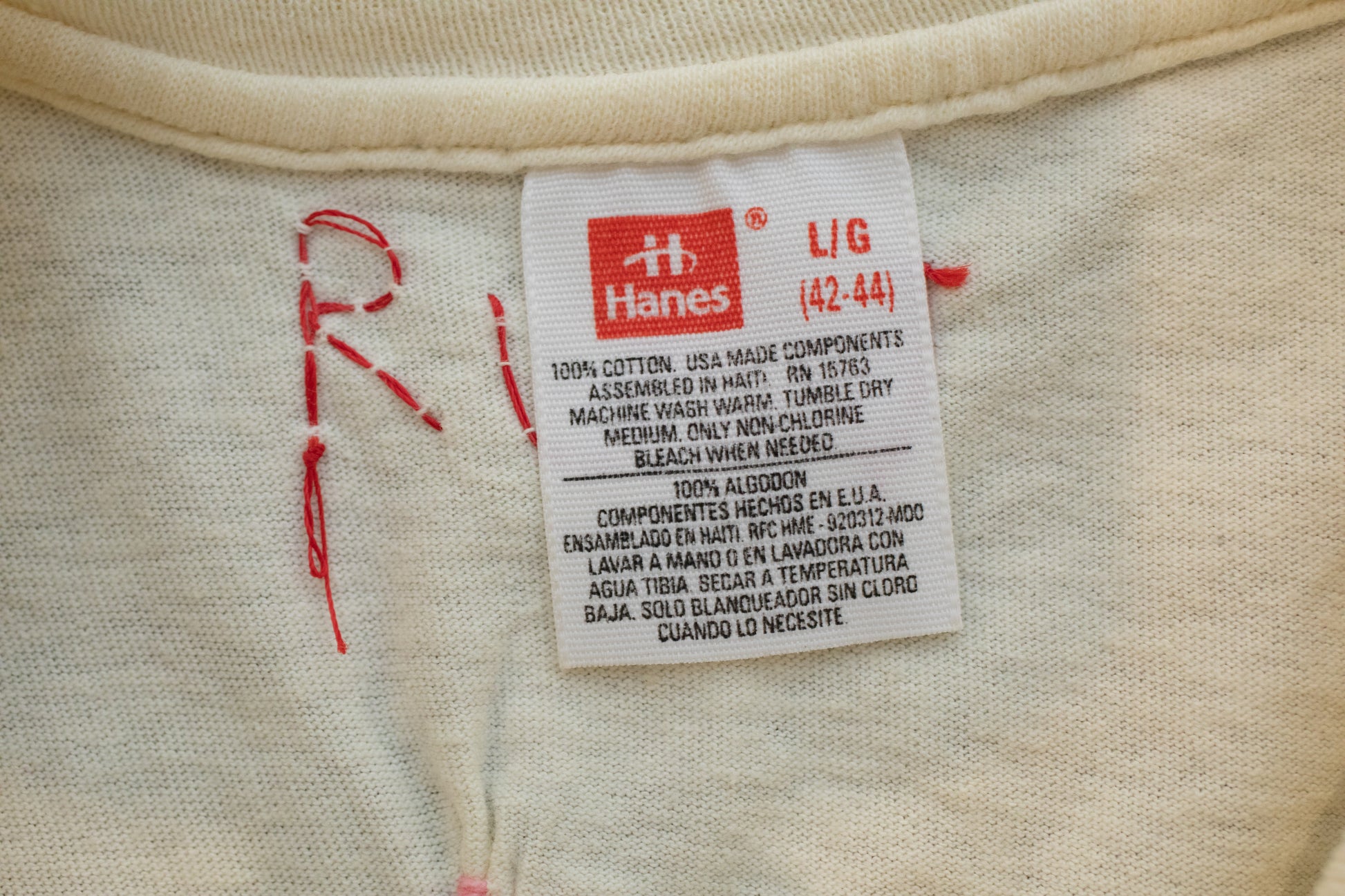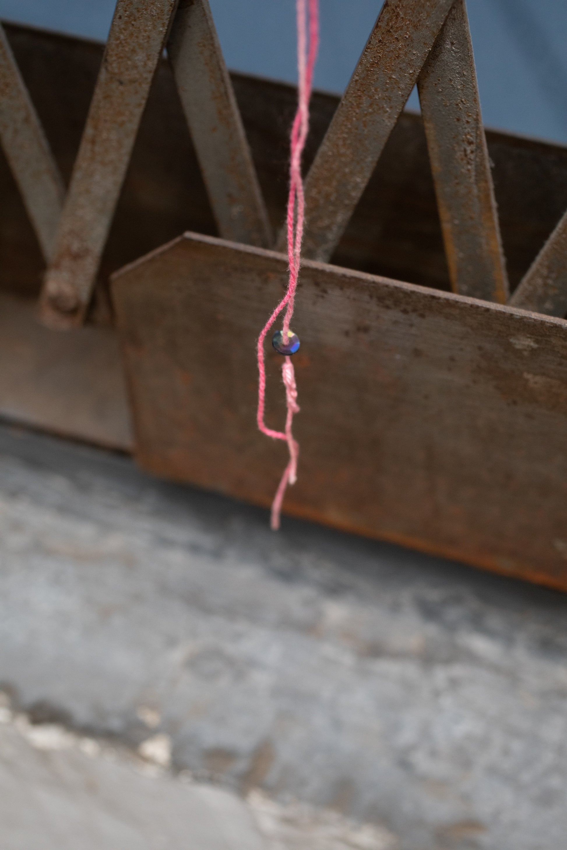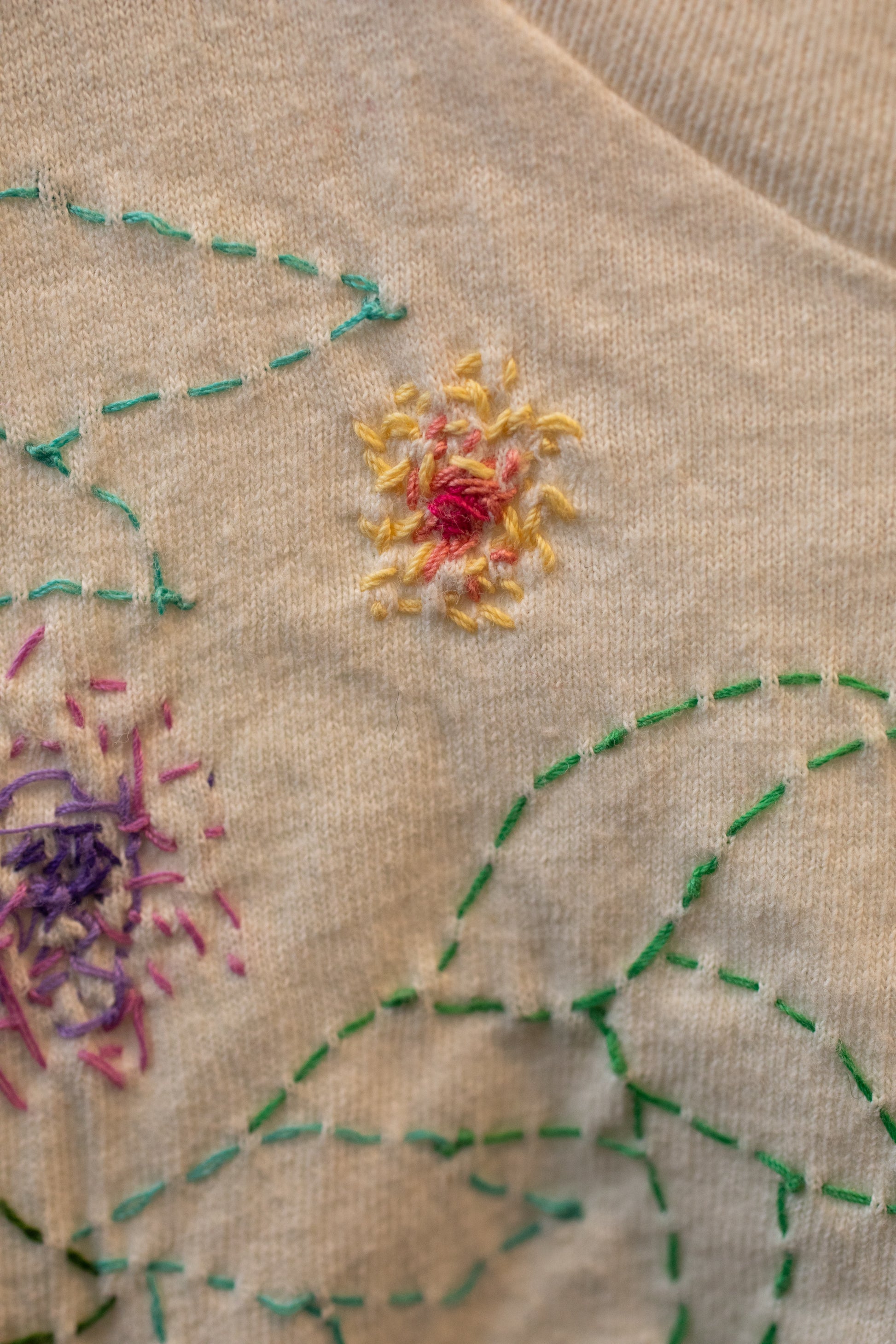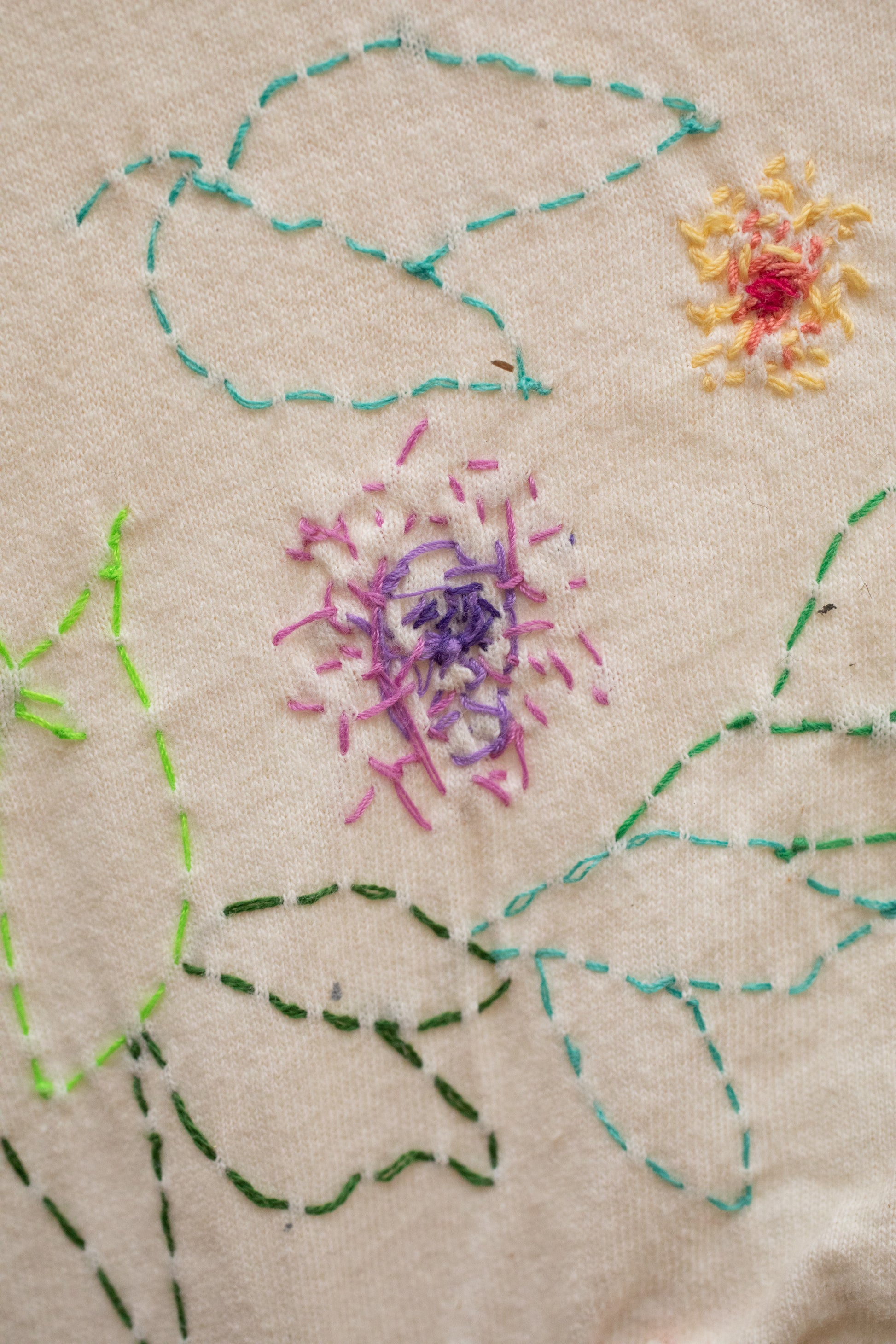 Pink stitching at bottom hem and multicolored hanging thread and ribbon details.
