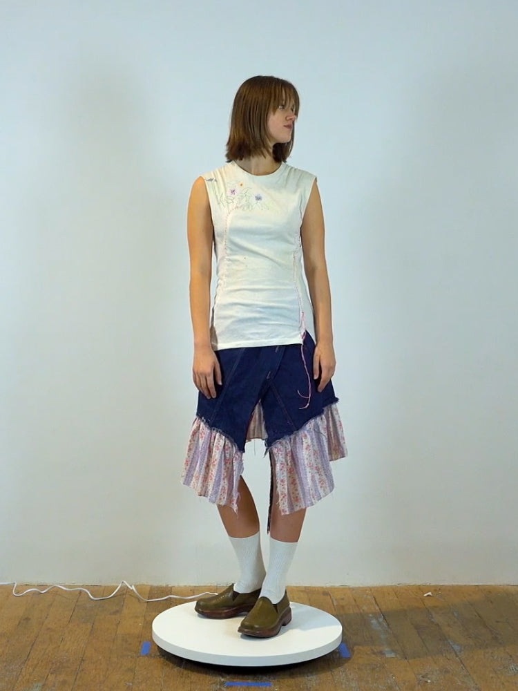 Custom piece during RUN 7: Sleeveless ivory knit top.