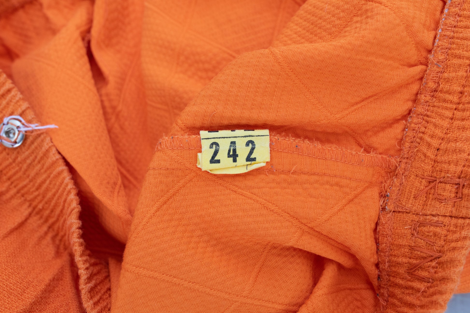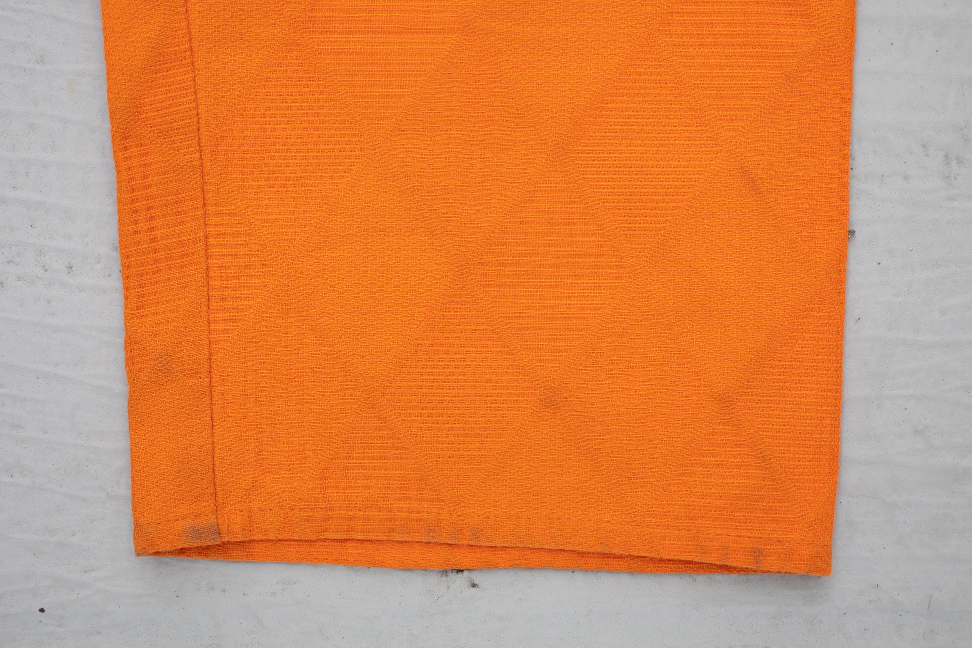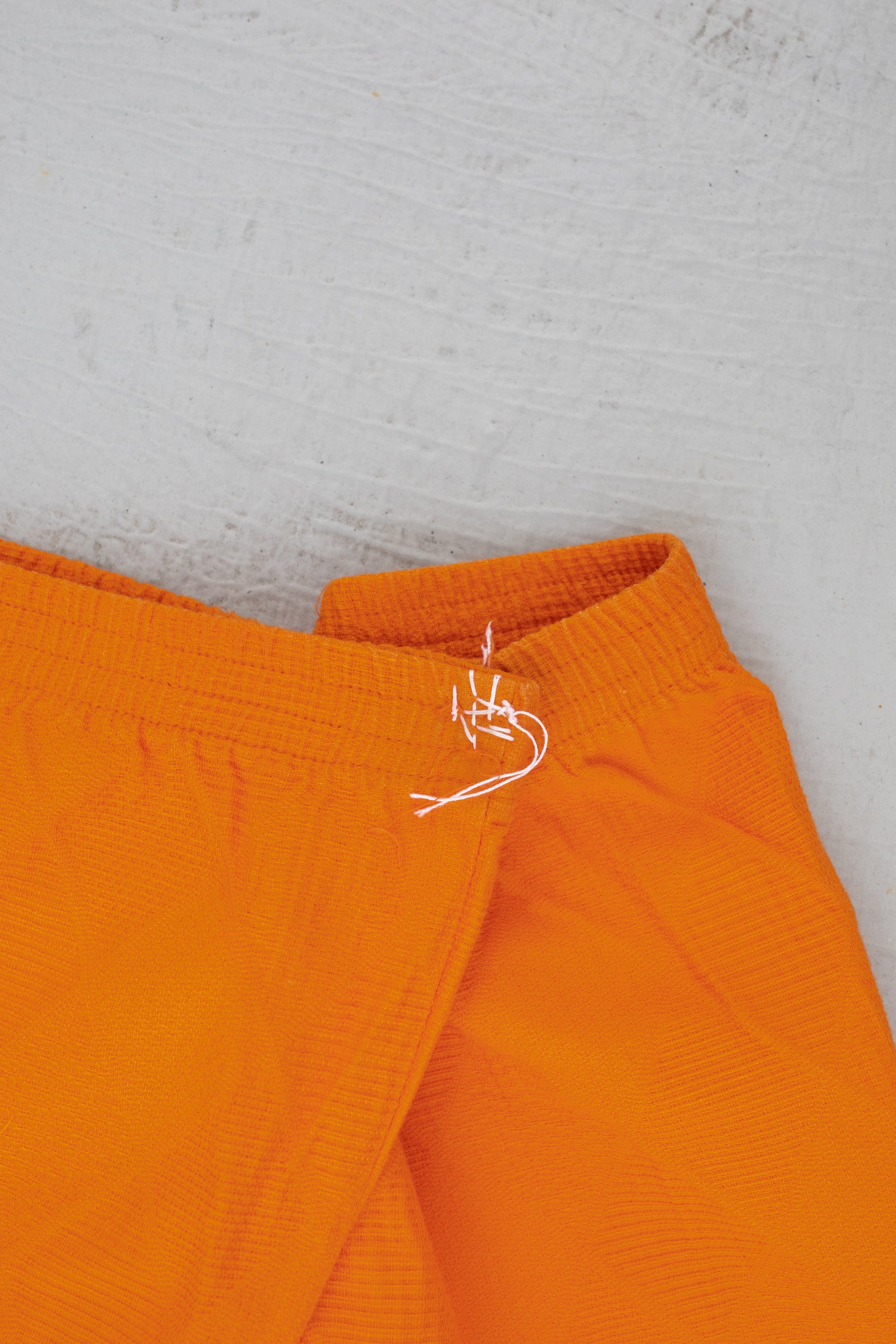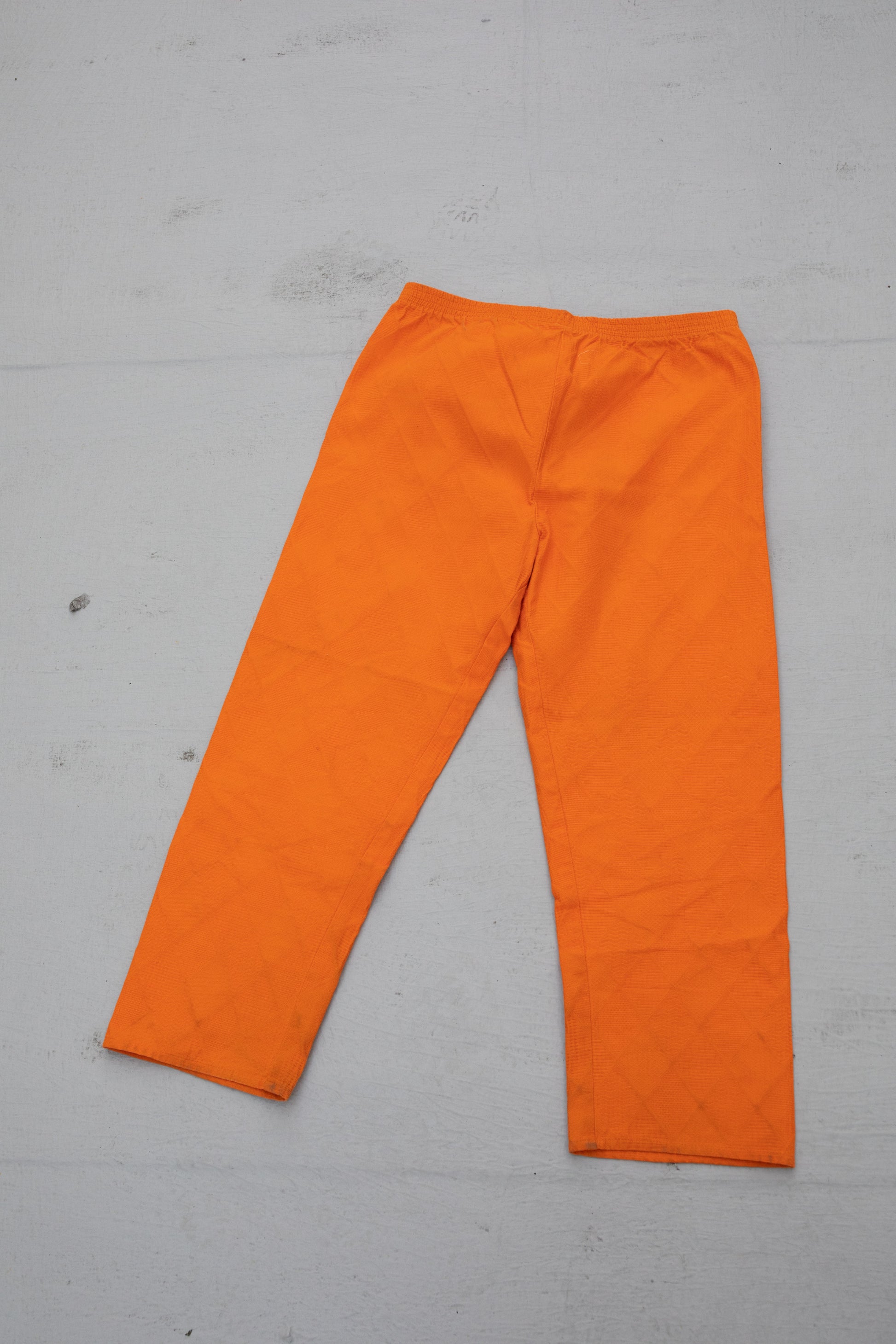 RUN 5 elastic waist orange pants, wide leg, textured diamond pattern.