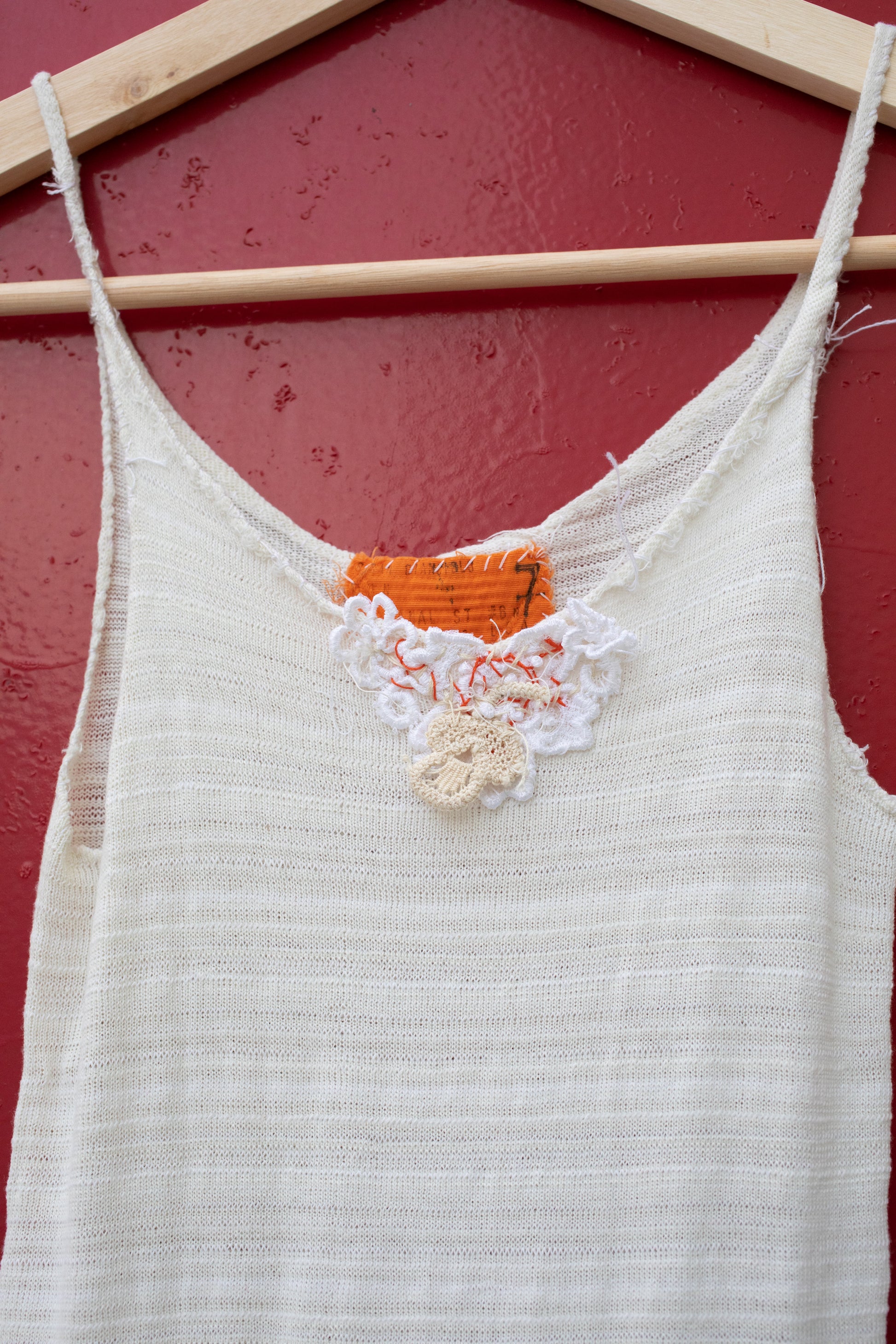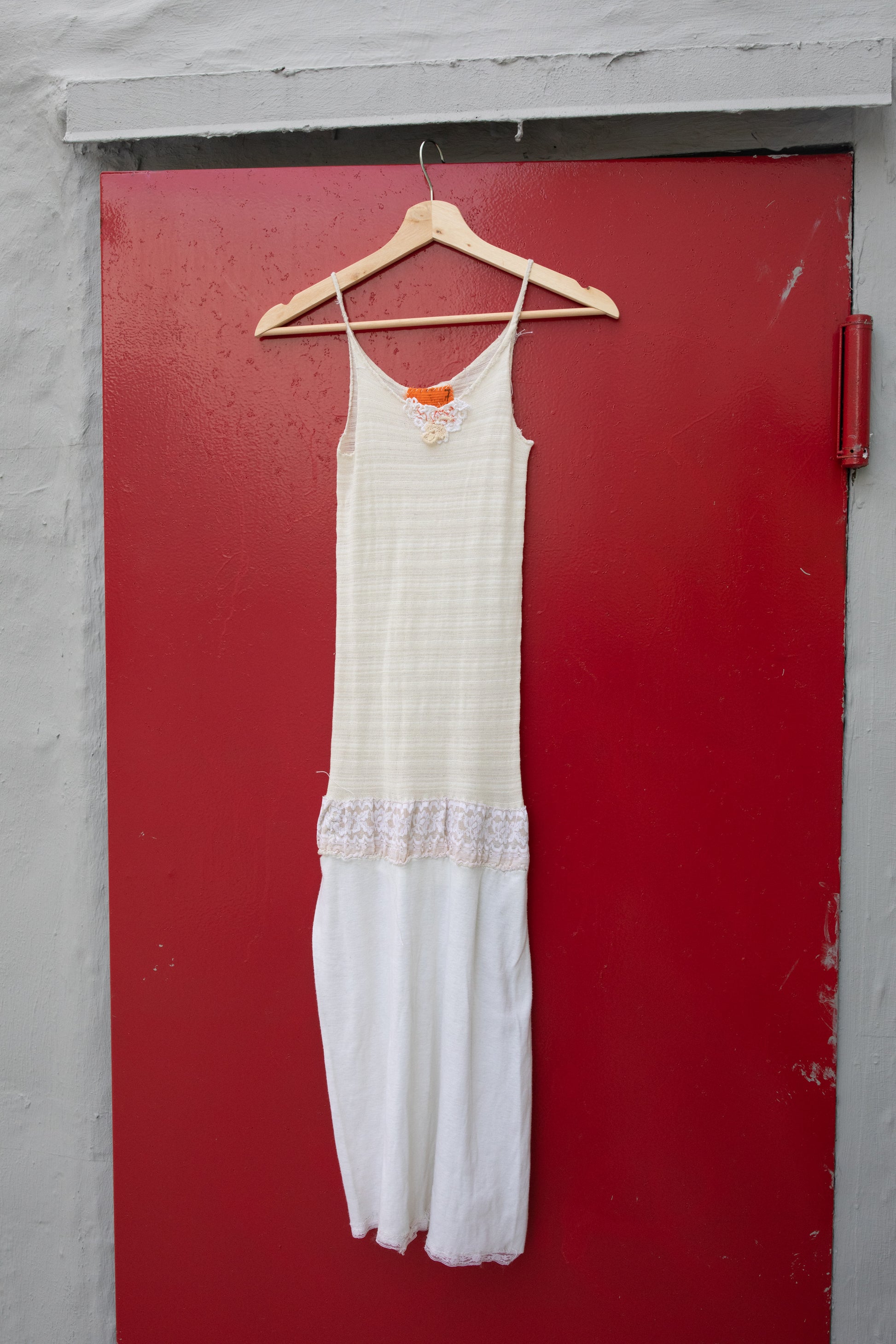 RUN 7 ivory woven cami dress with lace cumberbund detail and applique at neckline.