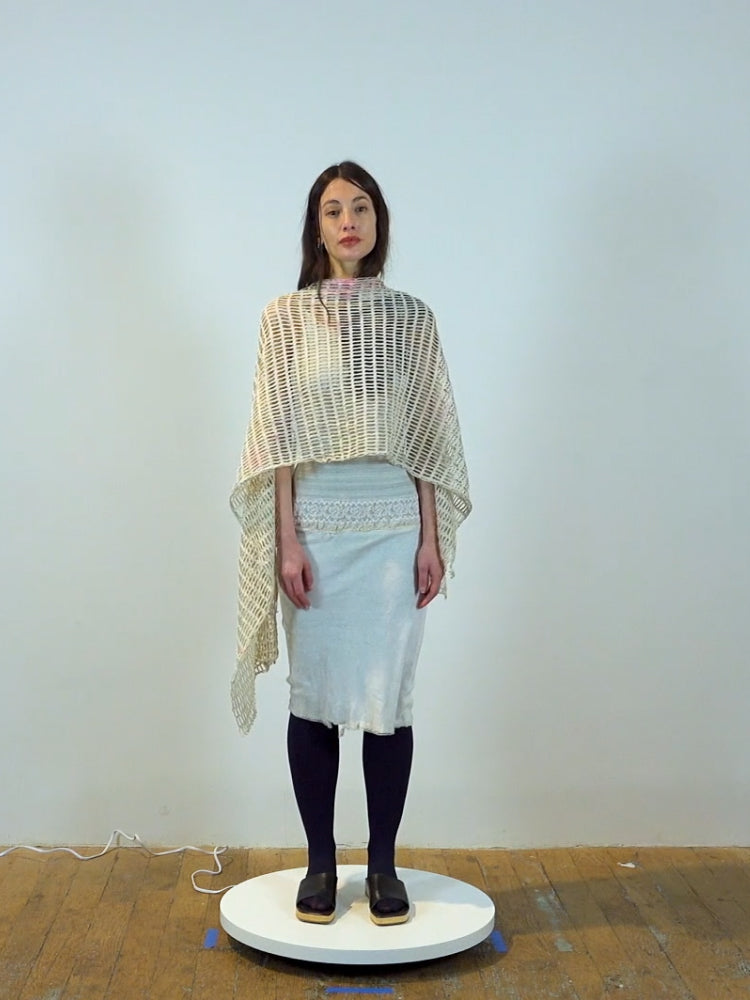 Various splashes of pink dye that are intentional and correspond to the original condition of the garment. Small pale blue ribbon accent.