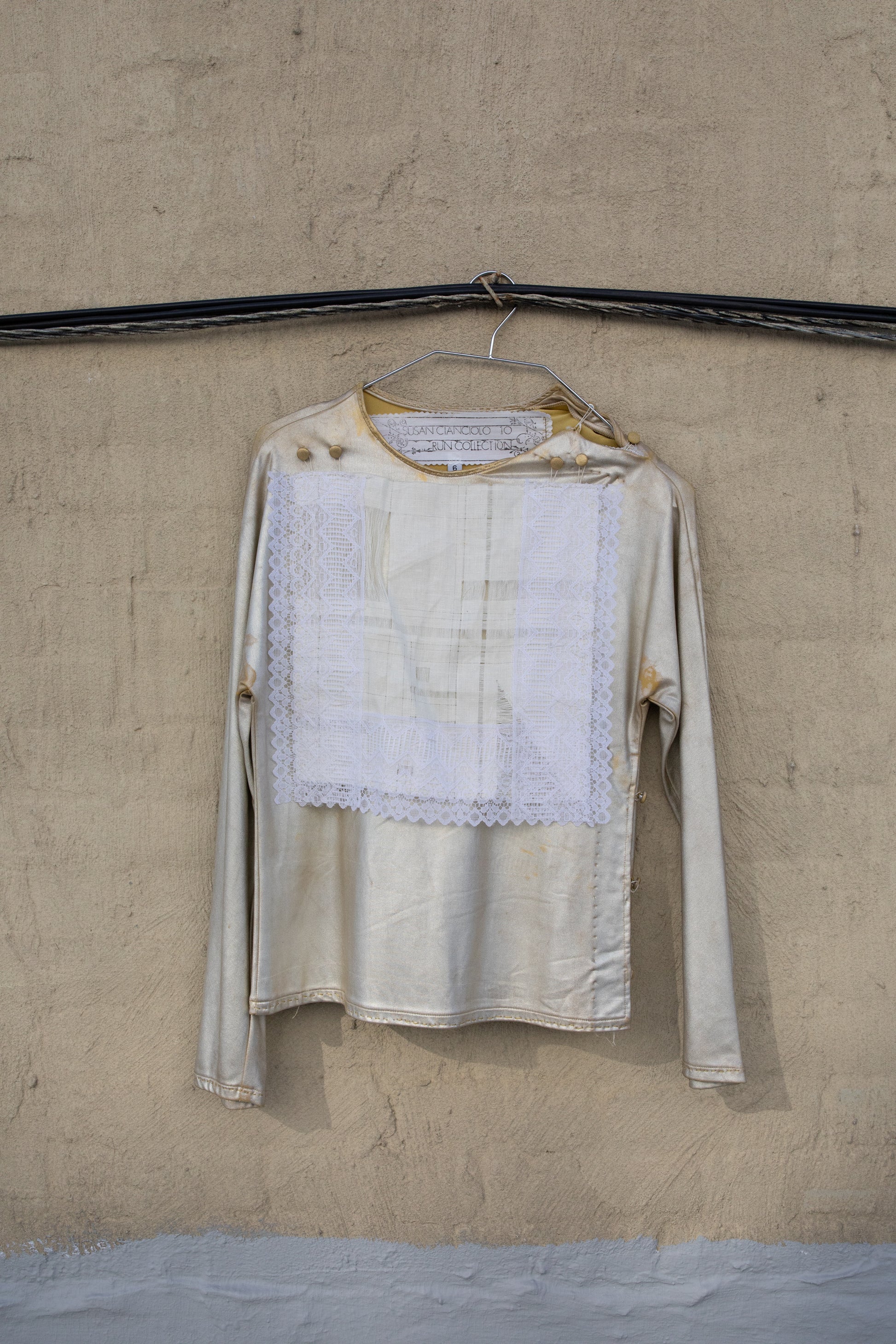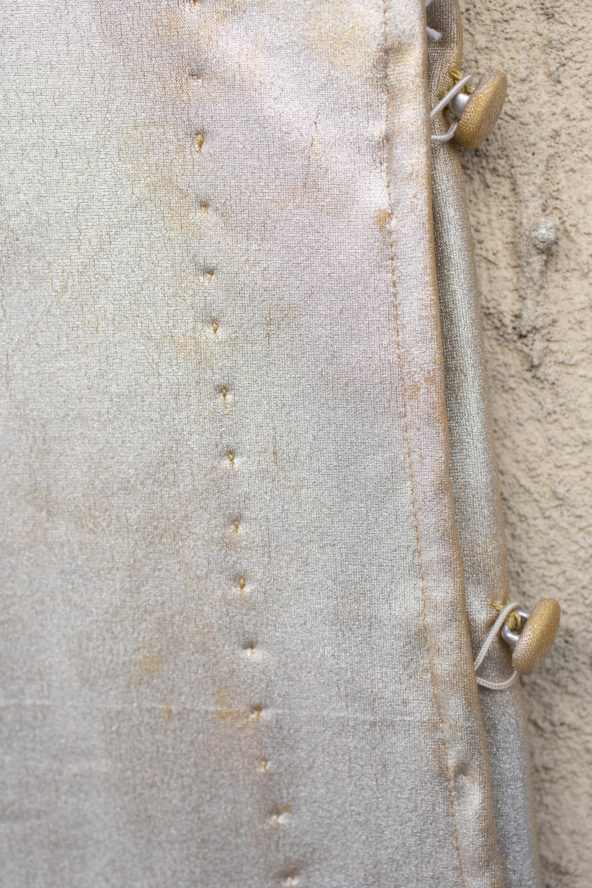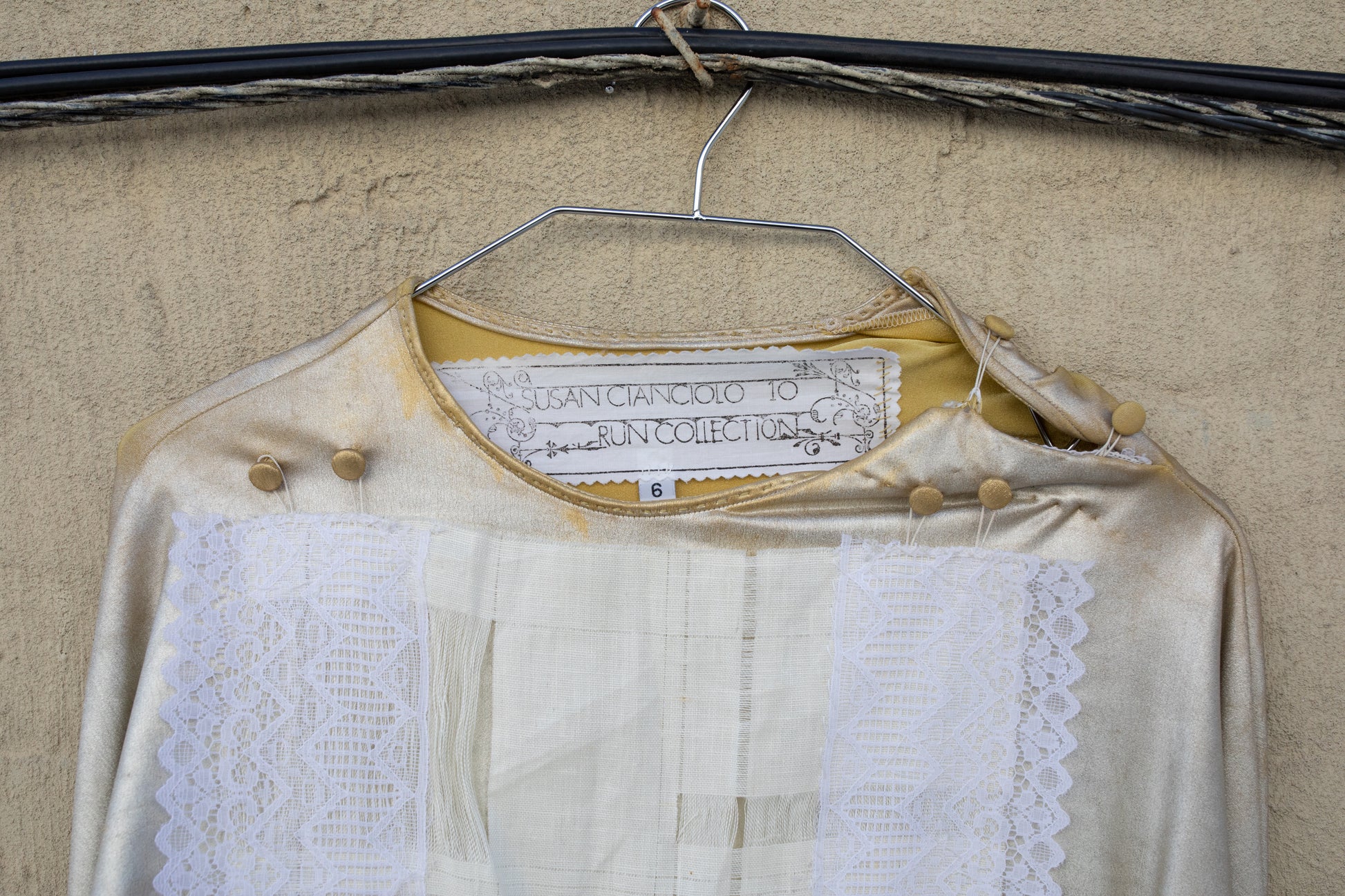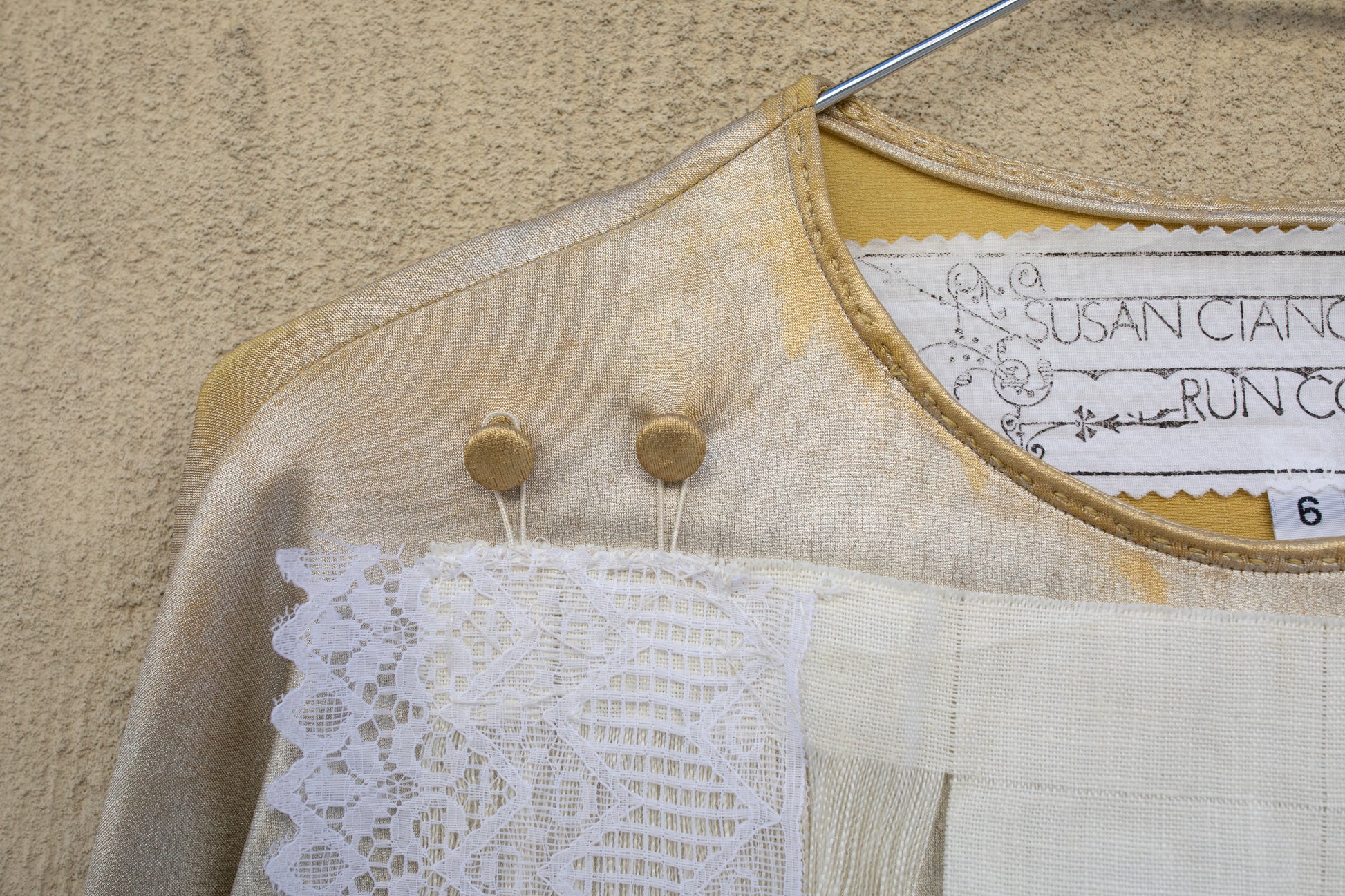Side button closure on left side with lace lining along the seam. Garment has moderate stretch. Button details at collar. Yellow discoloration marks under right arm. RUN 10 label inside back collar. Stitching along hem.