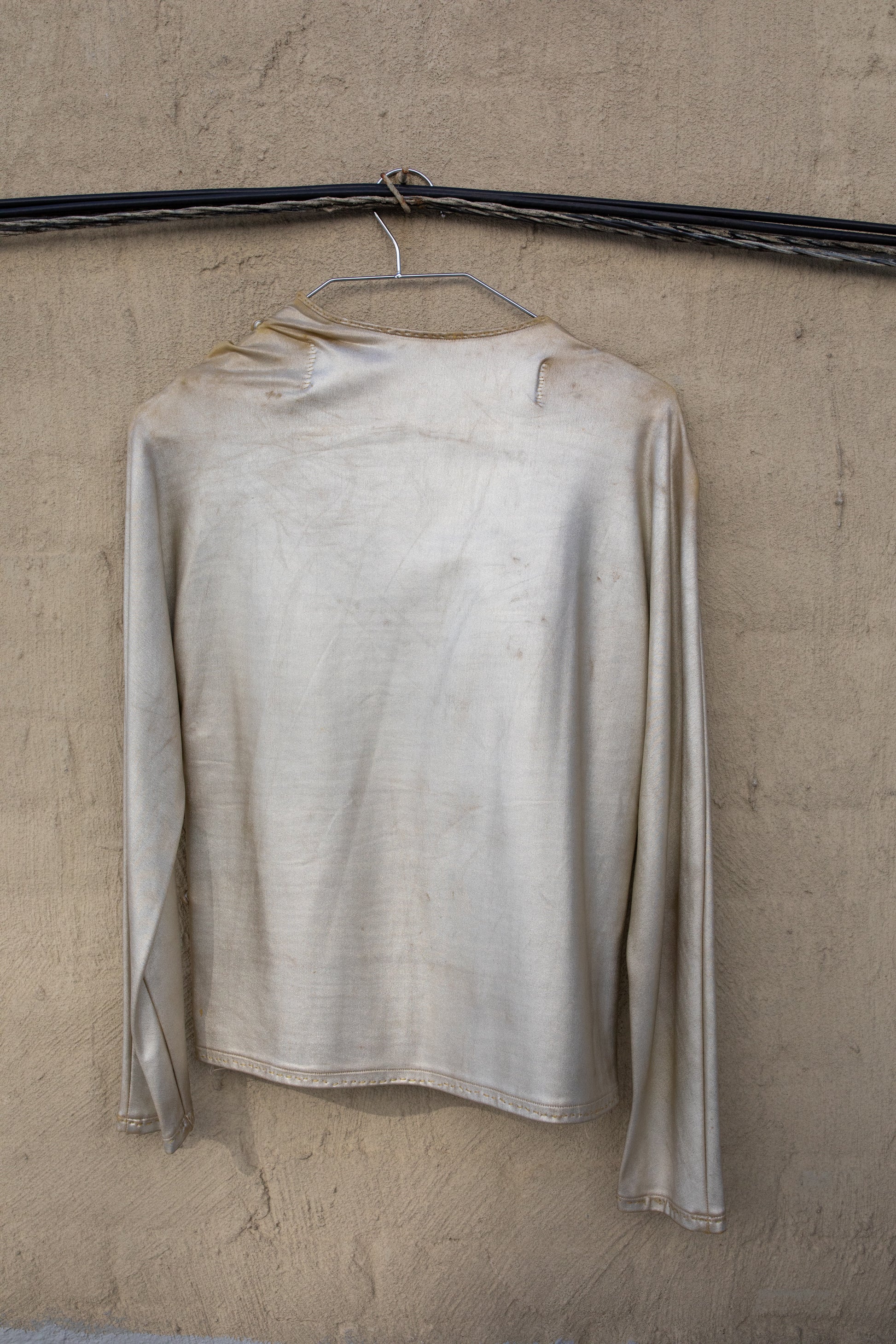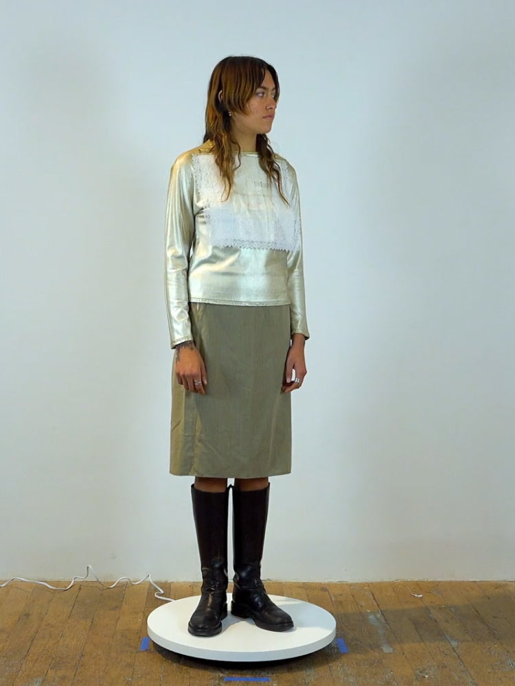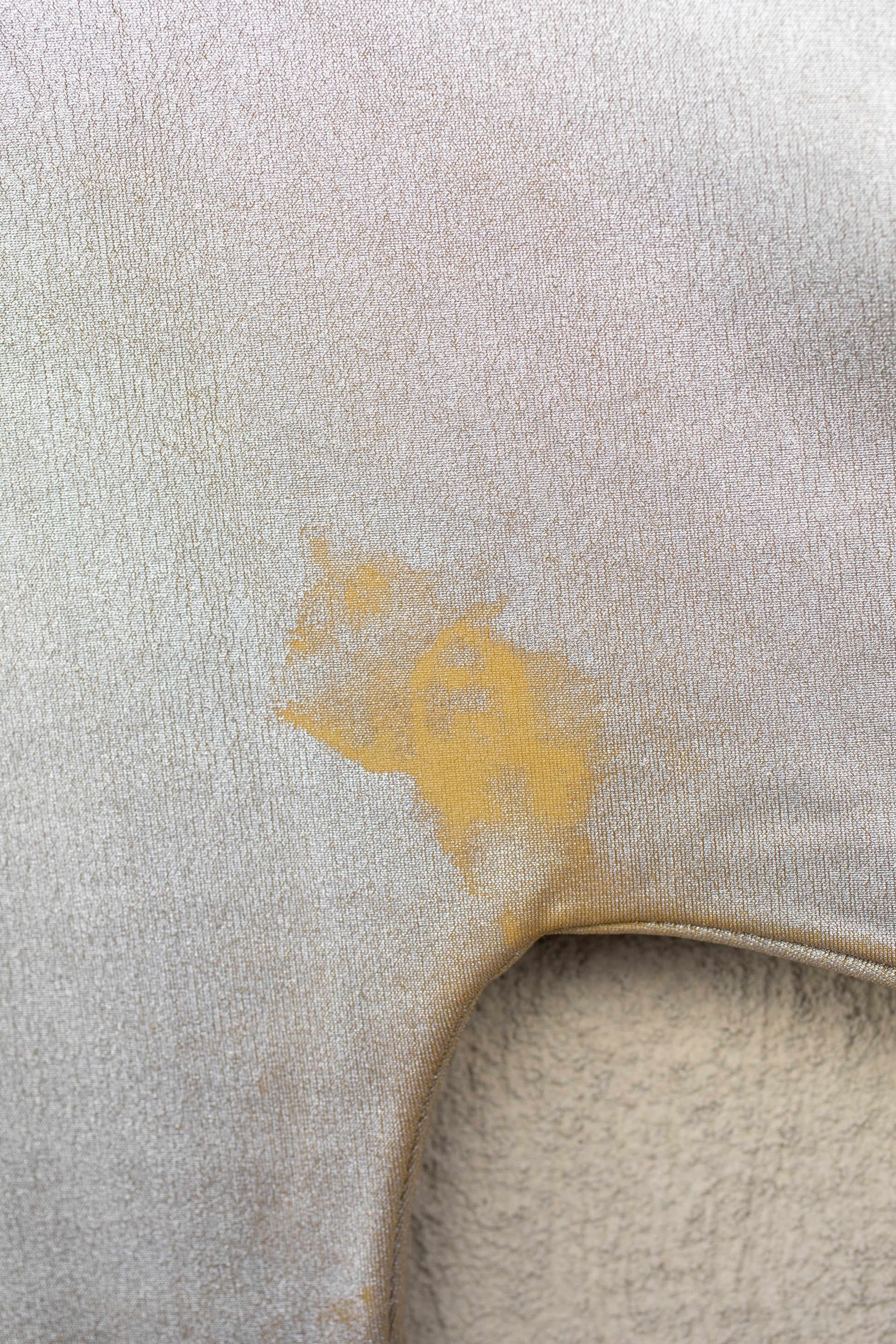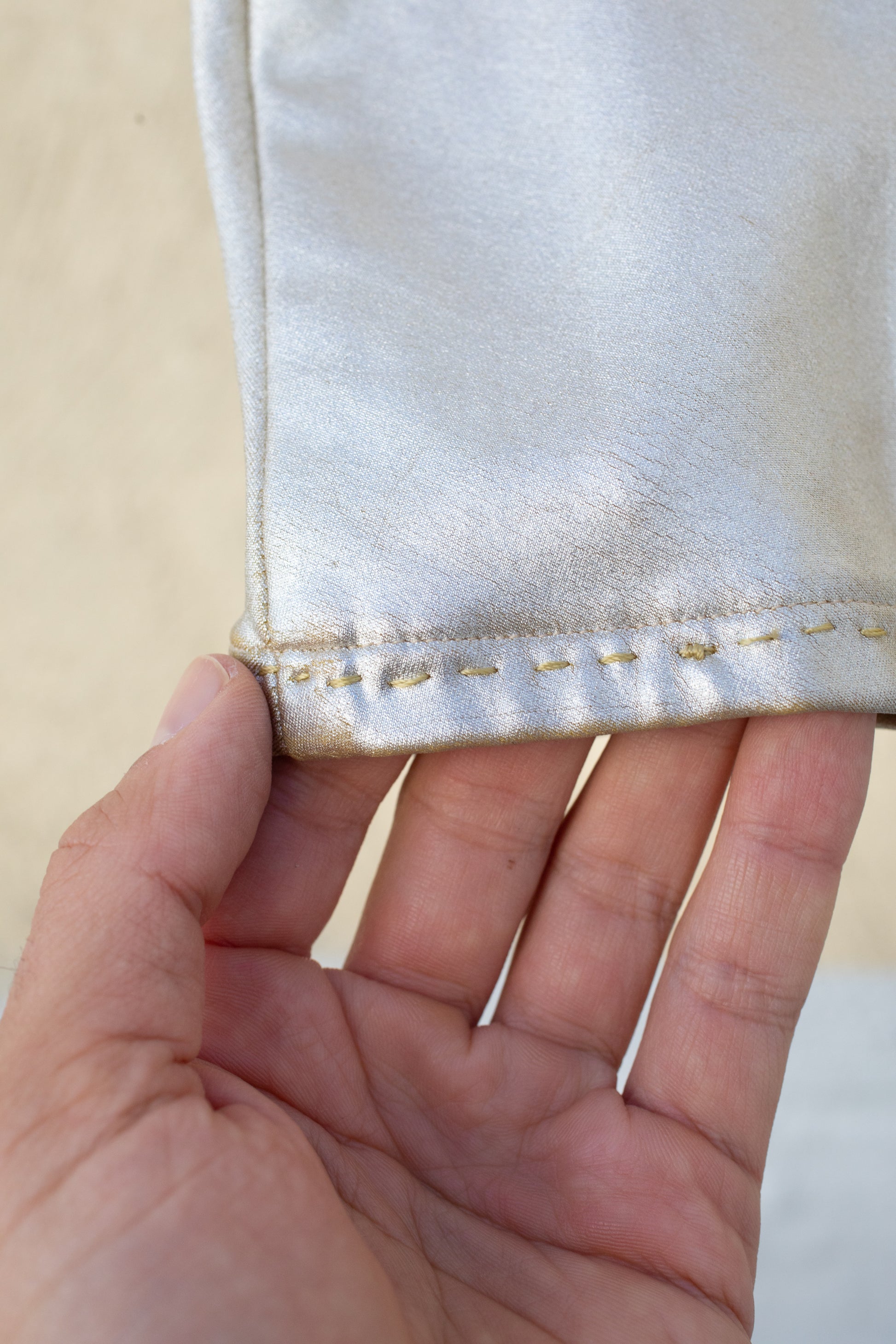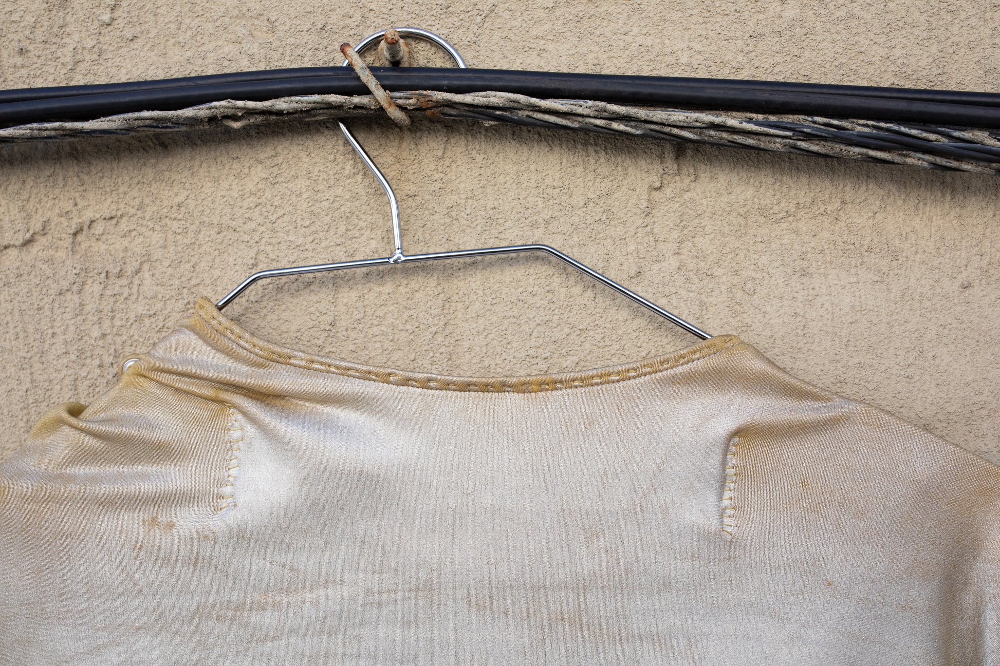 Side button closure on left side with lace lining along the seam. Garment has moderate stretch. Button details at collar. Yellow discoloration marks under right arm. RUN 10 label inside back collar. Stitching along hem.