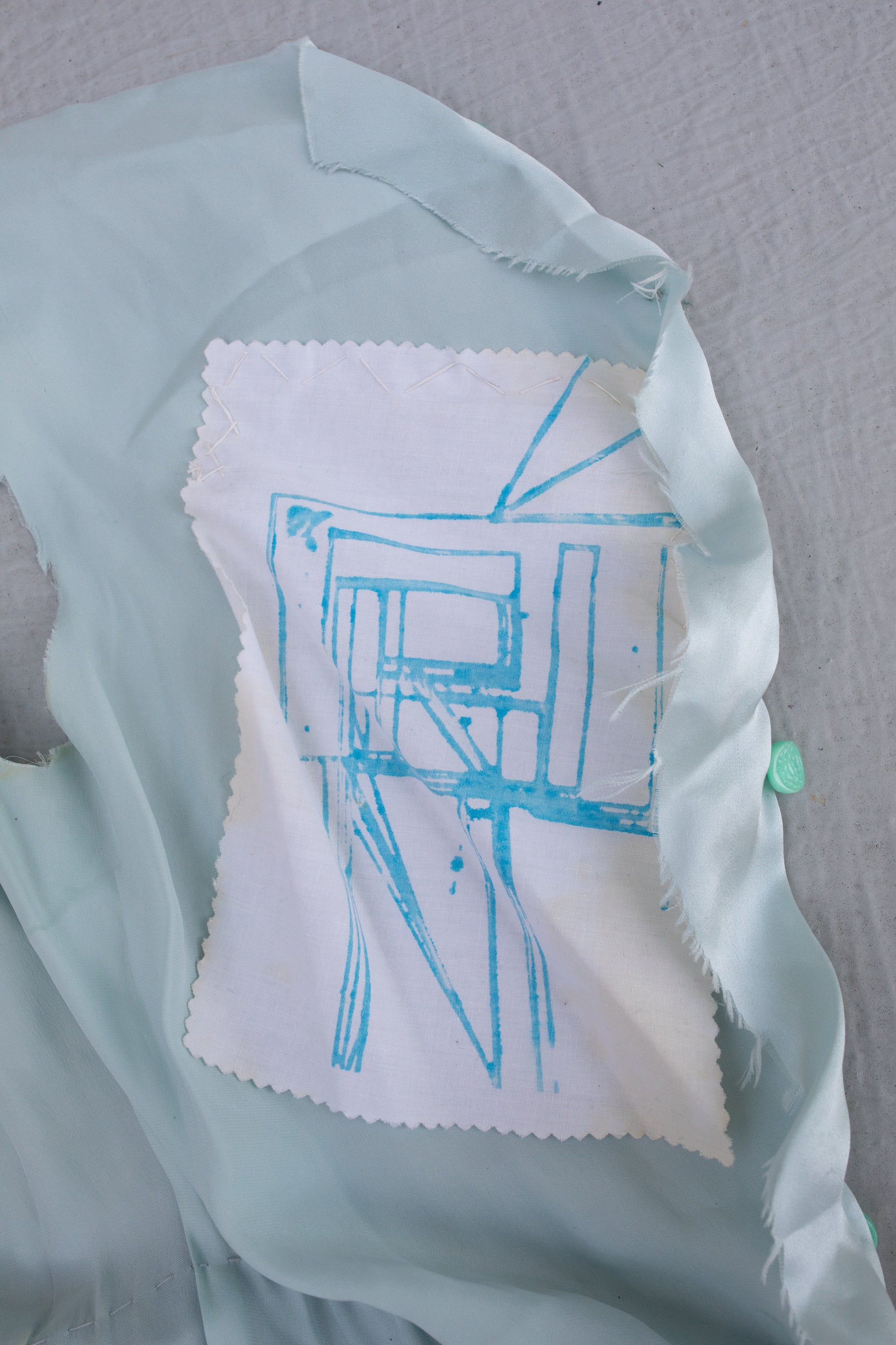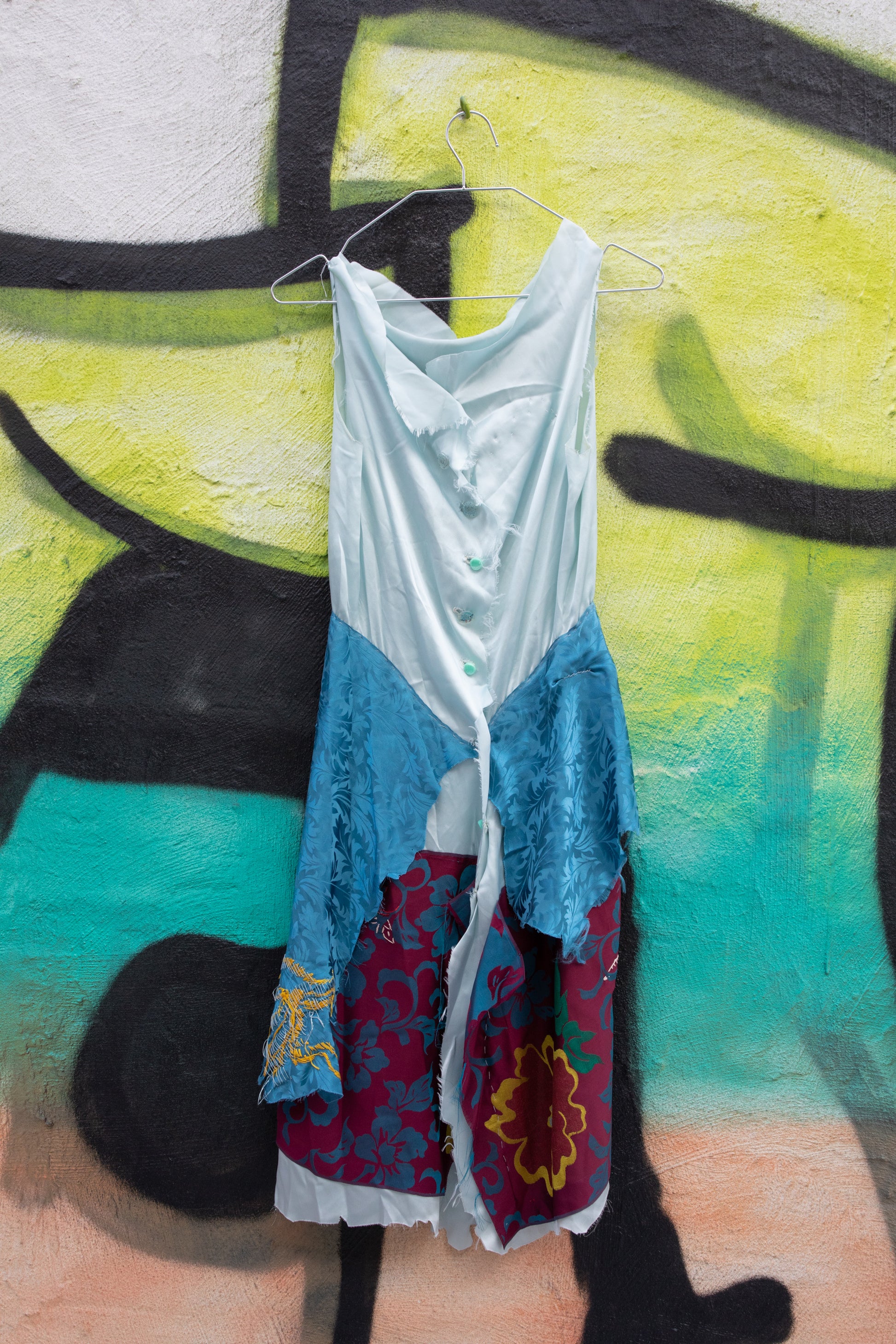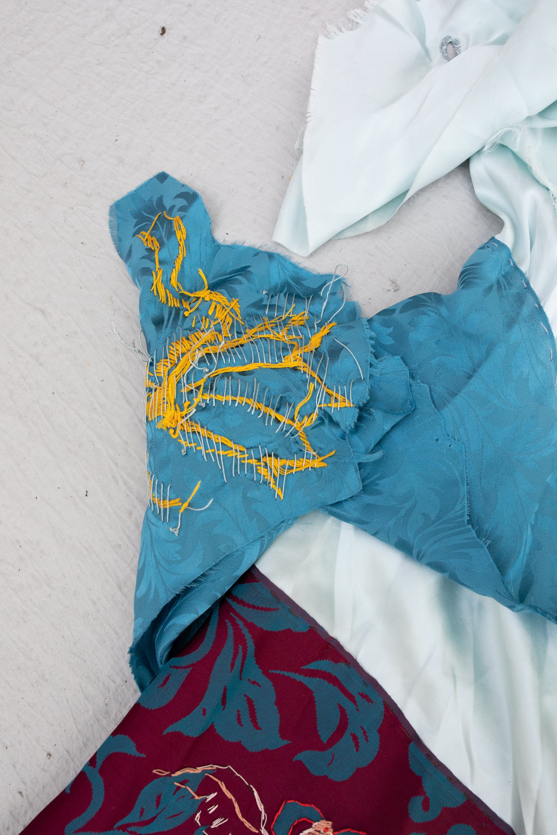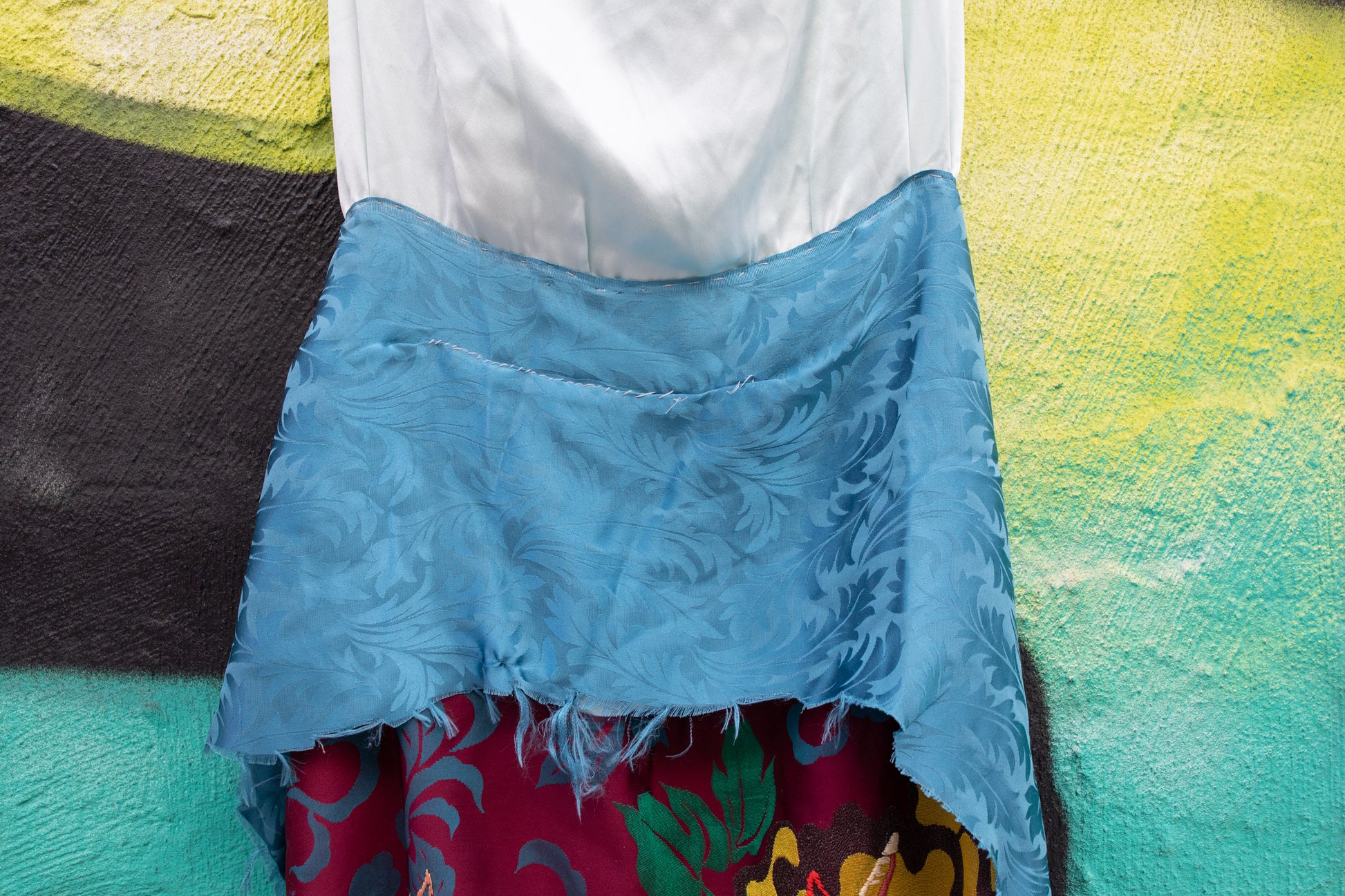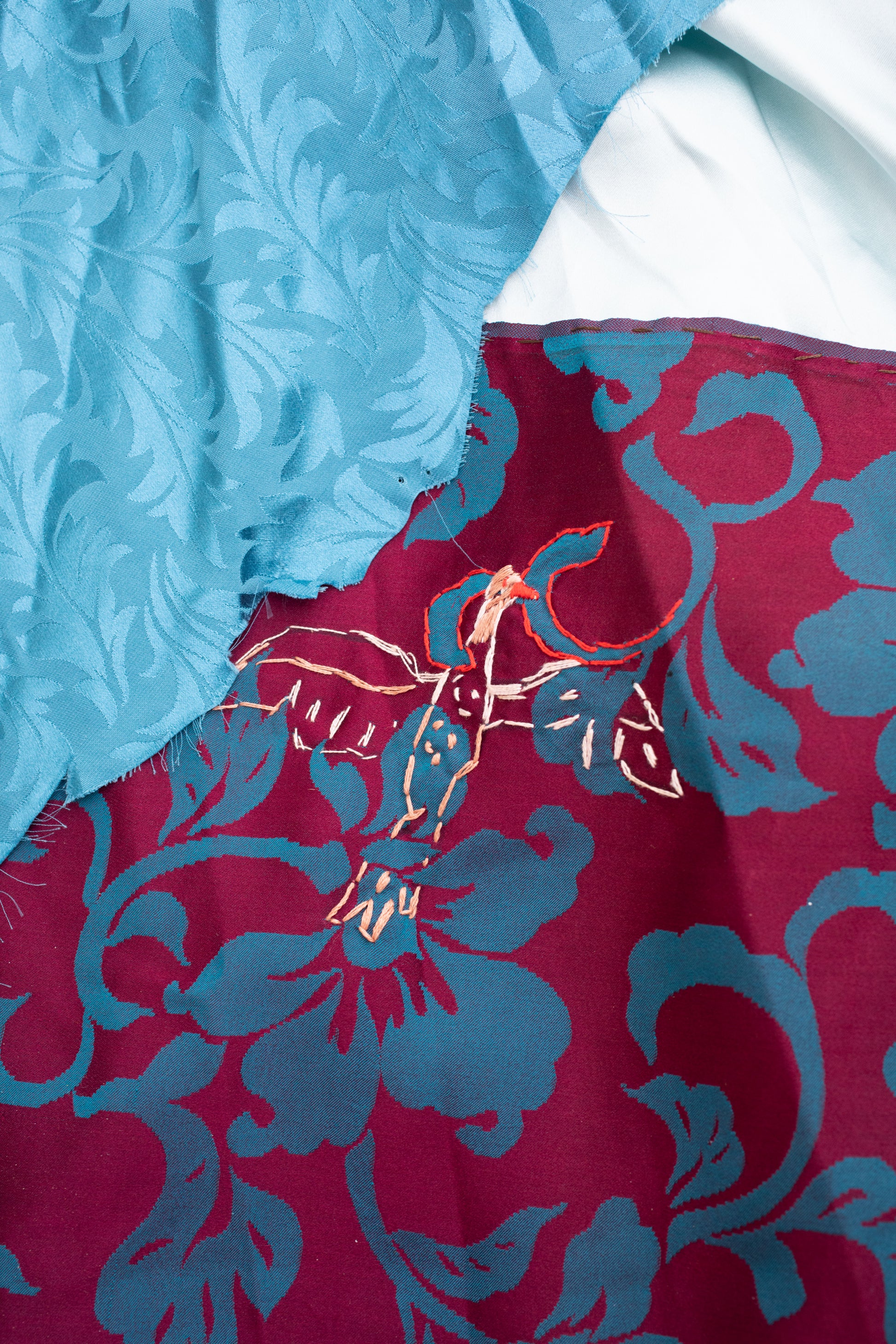 Raw edges, hand-stitched bird designs on skirt. Minor discoloration around armpit. Various loose threads, overall excellent condition.