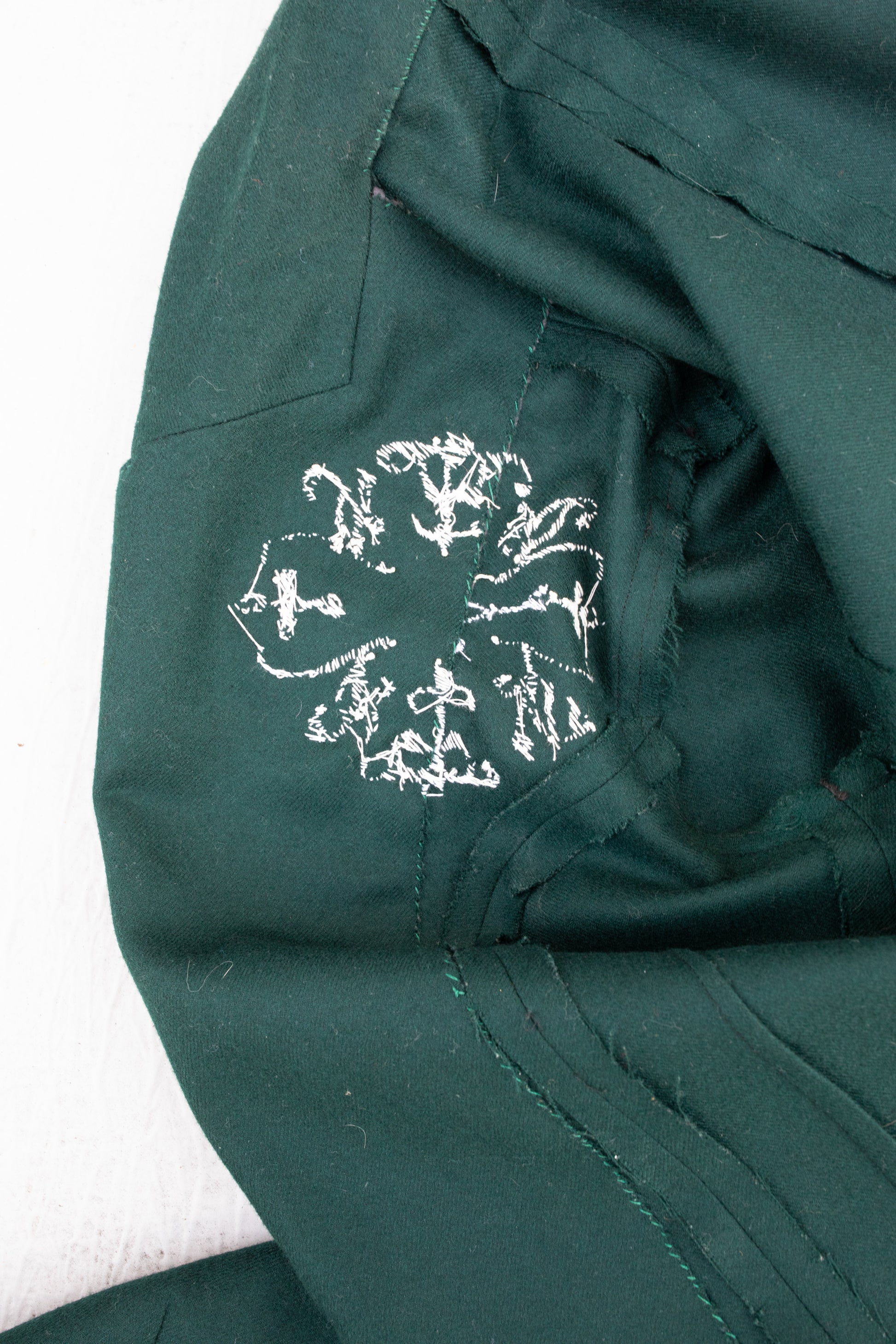 RUN 10 evergreen wool suit with white embroidered design on right lapel.