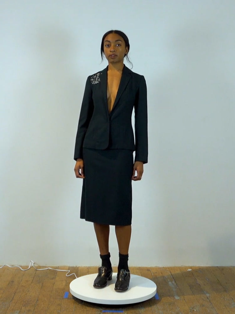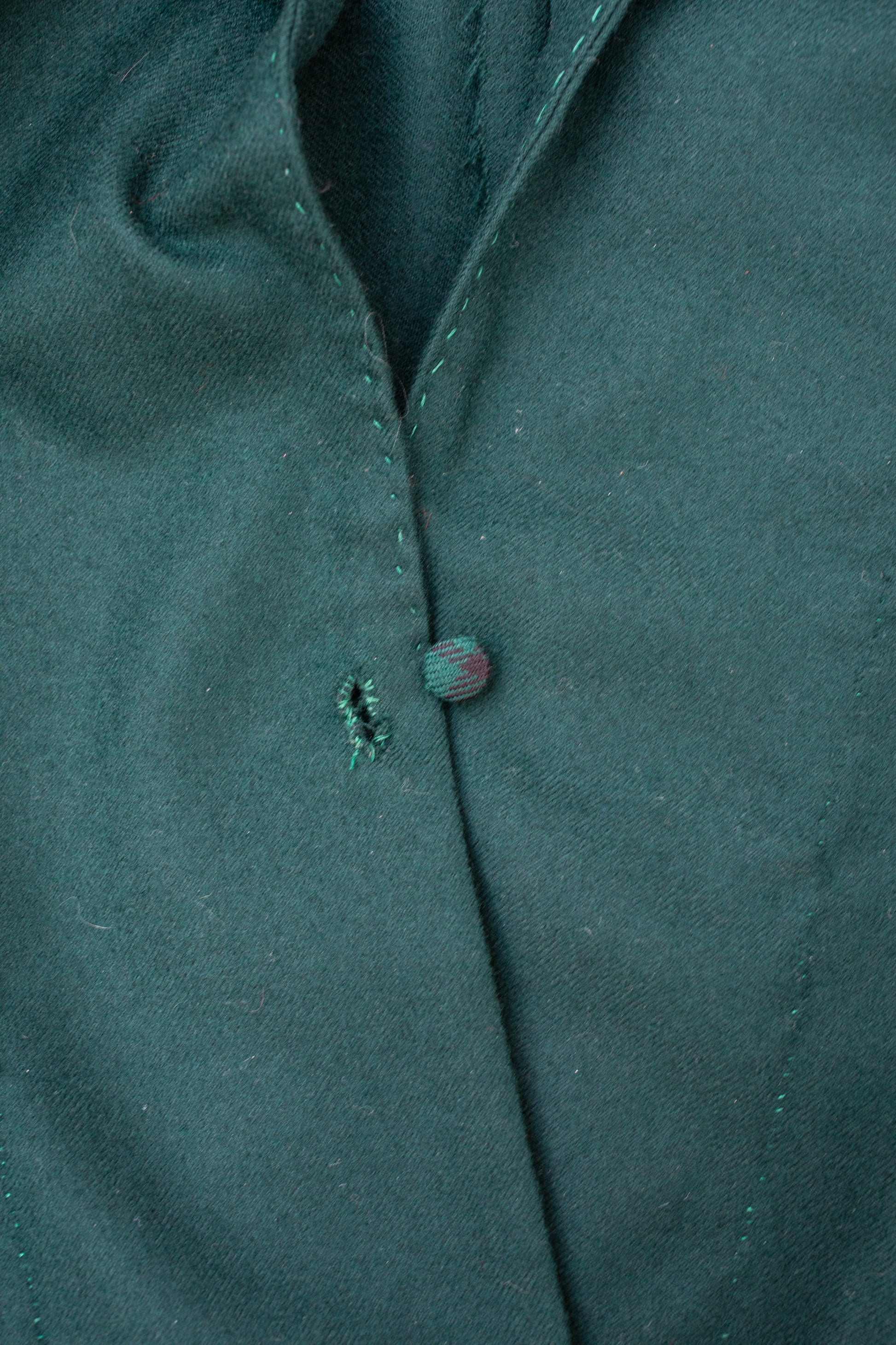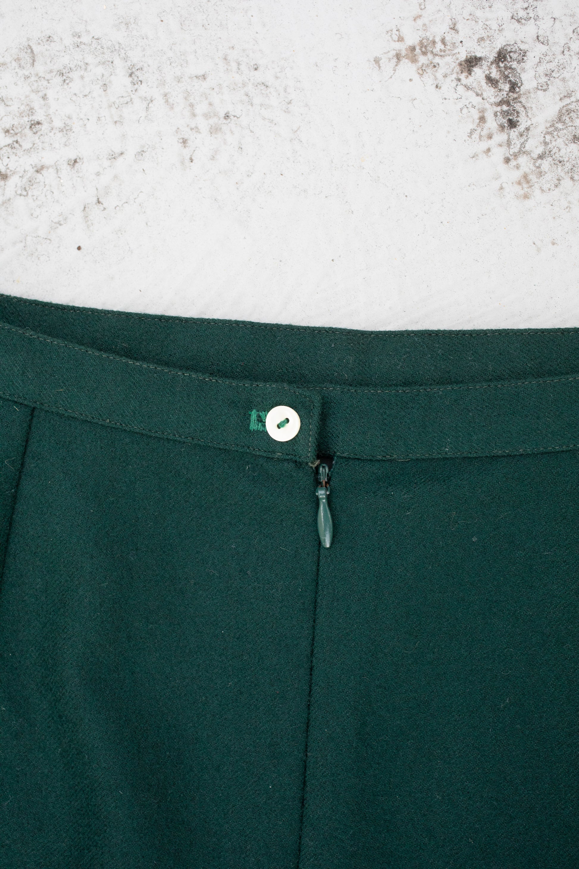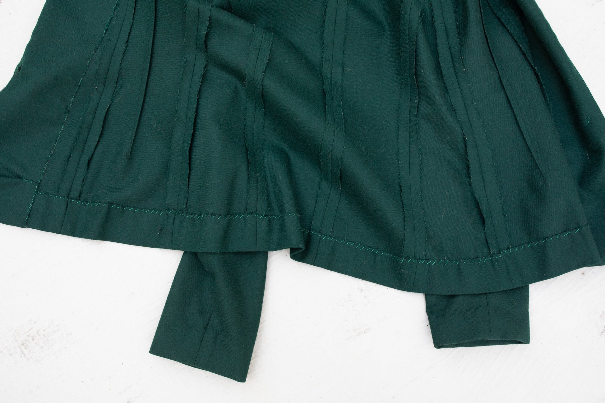 Green stitching details on jacket. Skirt has back zipper and small mother of pearl button closure. Small slit at back of skirt.